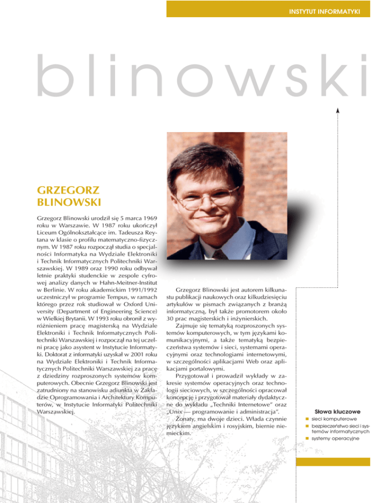 INSTYTUT INFORMATYKI blinowski GRZEGORZ BLINOWSKI Grzegorz Blinowski urodzi³ siê 5 marca 1969 roku w Warszawie. W 1987 roku ukoñczy³ Liceum Ogólnokszta³c¹ce im. Tadeusza Reytana w klasie o profilu matematyczno-fizycznym. W 1987 roku rozpocz¹³ studia o specjalnoœci Informatyka na Wydziale Elektroniki i Technik Informatycznych Politechniki Warszawskiej. W 1989 oraz 1990 roku odbywa³ letnie praktyki studenckie w zespole cyfrowej analizy danych w Hahn-Meitner-Institut w Berlinie. W roku akademickim 1991/1992 uczestniczy³ w programie Tempus, w ramach którego przez rok studiowa³ w Oxford University (Department of Engineering Science) w Wielkiej Brytanii. W 1993 roku obroni³ z wyró¿nieniem pracê magistersk¹ na Wydziale Elektroniki i Technik Informatycznych Politechniki Warszawskiej i rozpocz¹³ na tej uczelni pracê jako asystent w Instytucie Informatyki. Doktorat z informatyki uzyska³ w 2001 roku na Wydziale Elektroniki i Technik Informatycznych Politechniki Warszawskiej za pracê z dziedziny rozproszonych systemów komputerowych. Obecnie Grzegorz Blinowski jest zatrudniony na stanowisku adiunkta w Zak³adzie Oprogramowania i Architektury Komputerów, w Instytucie Informatyki Politechniki Warszawskiej. Grzegorz Blinowski jest autorem kilkunastu publikacji naukowych oraz kilkudziesiêciu artyku³ów w pismach zwi¹zanych z bran¿¹ informatyczn¹, by³ tak¿e promotorem oko³o 30 prac magisterskich i in¿ynierskich. Zajmuje siê tematyk¹ rozproszonych systemów komputerowych, w tym jêzykami komunikacyjnymi, a tak¿e tematyk¹ bezpieczeñstwa systemów i sieci, systemami operacyjnymi oraz technologiami internetowymi, w szczególnoœci aplikacjami Web oraz aplikacjami portalowymi. Przygotowa³ i prowadzi³ wyk³ady w zakresie systemów operacyjnych oraz technologii sieciowych, w szczególnoœci opracowa³ koncepcjê i przygotowa³ materia³y dydaktyczne do wyk³adu „Techniki Internetowe” oraz „Unix — programowanie i administracja”. ¯onaty, ma dwoje dzieci. W³ada czynnie jêzykiem angielskim i rosyjskim, biernie niemieckim. Słowa kluczowe n sieci komputerowe n bezpieczeństwo sieci i systemów informatycznych n systemy operacyjne
