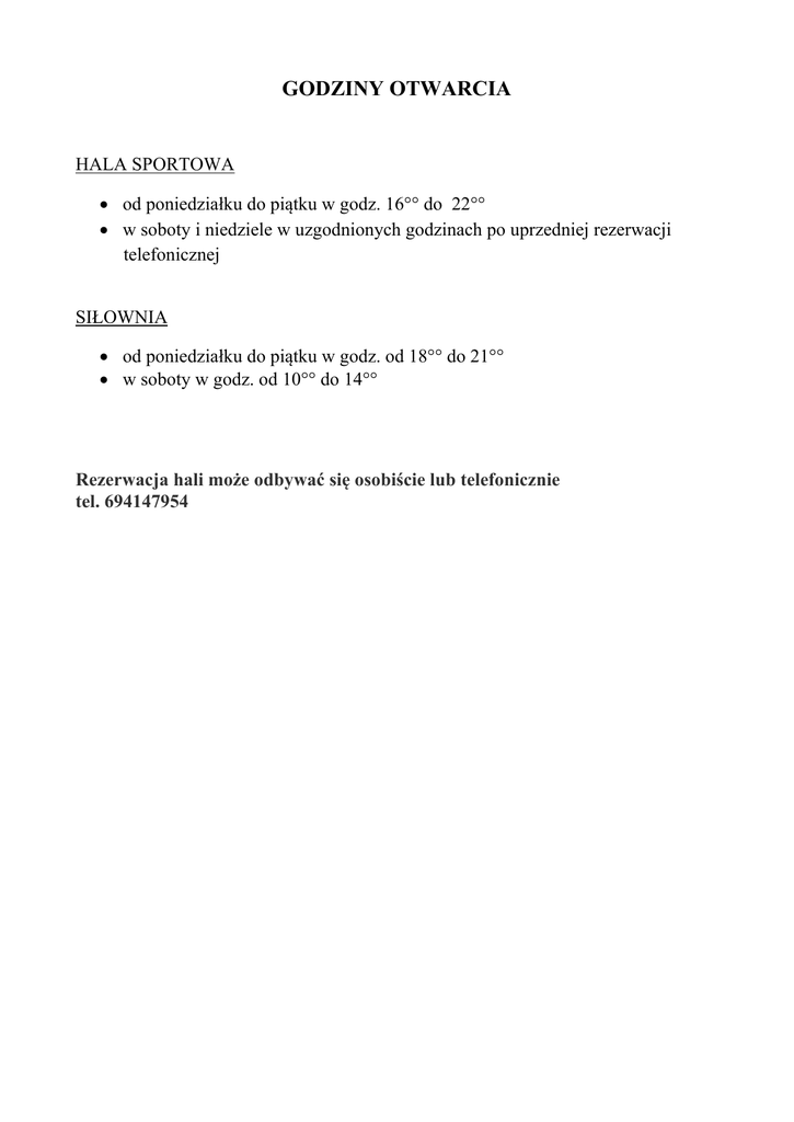 GODZINY OTWARCIA HALA SPORTOWA • od poniedziałku do piątku w godz. 16°° do 22°° • w soboty i niedziele w uzgodnionych godzinach po uprzedniej rezerwacji telefonicznej SIŁOWNIA • od poniedziałku do piątku w godz. od 18°° do 21°° • w soboty w godz. od 10°° do 14°° Rezerwacja hali może odbywać się osobiście lub telefonicznie tel. 694147954
