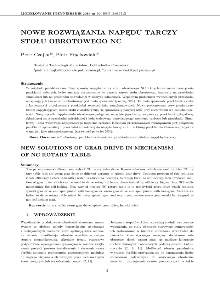 MODELOWANIE INŻYNIERSKIE 2016 nr 60, ISSN 1896-771X NOWE ROZWIĄZANIA NAPĘDU TARCZY STOŁU OBROTOWEGO NC Piotr Czajka1a, Piotr Frąckowiak1b 1 a Instytut Technologii Materiałów, Politechnika Poznańska [email protected], [email protected] Streszczenie W artykule przedstawiono różne sposoby napędu tarczy stołu obrotowego NC. Dotychczas znane rozwiązania przekładni zębatych, które znalazły zastosowanie do napędu tarczy stołu obrotowego, bazowały na przekładni ślimakowej lub na przekładni spiroidalnej w różnych odmianach. Wspólnym problemem wymienionych przekładni napędzających tarcze stołu obrotowego jest mała sprawność (poniżej 50%). Ta mała sprawność przekładni wynika z konieczności projektowania przekładni zębatych jako samohamownych. Nowe proponowane rozwiązania przekładni napędzających tarcze stołu charakteryzują się sprawnością powyżej 50% przy zachowaniu ich samohamowności. Nowy sposób napędu stołu obrotowego polega na napędzie jego tarczy za pomocą przekładni hybrydowej składającej się z przekładni spiroidalnej i koła walcowego napędzającego uzębienie czołowe lub przekładni ślimakowej i koła walcowego napędzającego uzębienie czołowe. Kolejnym prezentowanym rozwiązaniem jest połączenie przekładni spiroidalnej i przekładni ślimakowej do napędu tarczy stołu, w której przekładnia ślimakowa projektowana jest jako niesamohamowna (sprawność powyżej 50%). Słowa kluczowe: stół obrotowy, przekładnia ślimakowa, przekładnia spiroidalna, napęd hybrydowy NEW SOLUTIONS OF GEAR DRIVE IN MECHANISM OF NC ROTARY TABLE Summary The paper presents different methods of NC rotary table drive. Known solutions, which are used to drive NC rotary table disk are worm gear drive or different variants of spiroid gear drive. Common problem of this solutions is low efficiency (lower than 50%) which is caused by necessity to design them as self-locking. New proposed solution of gear drive which can be used to drive rotary table are characterized by efficiency higher than 50% while maintaining the self-locking. New way of driving NC rotary table is to use hybrid gears drive which contains spiroid gear drive and spur pinion with face-gear or worm gear drive and spur pinion with face-gear. Another solution to drive rotary table might be using spiroid gear and worm gear, where worm gear would be designed as not-self-locking gear. Keywords: rotary table, worm gear drive, spiroid gear drive, hybrid drive 1. WPROWADZENIE Jednym z zespołów, które pozwalają spełnić wymienione wymagania, są stoły obrotowe sterowane numerycznie. Ich zastosowanie w budowie obrabiarek wprowadza do łańcucha kinematycznego maszyny dodatkowe osie obrotowe, dzięki czemu staje się możliwe kojarzenie ruchów liniowych i obrotowych podczas procesu kształtowania [2, 9, 11]. Możliwość obrotu przedmiotu w trakcie obróbki przyczynia się do ograniczenia liczby zamocowań potrzebnych do właściwego obrobienia materiału, zmniejszenia czasów pomocniczych, a także Współcześnie produkowane obrabiarki sterowane numerycznie to złożone układy konstrukcyjne zbudowane z funkcjonalnych modułów, które spełniają ściśle określone zadania, umożliwiając obróbkę wyrobów o dużym stopniu skomplikowania. Aktualne trendy rozwojowe podyktowane wymaganiami rynkowymi w zakresie zwiększenia precyzji procesu kształtowania i skracania czasu obróbki zmuszają producentów poszczególnych modułów do ciągłego ulepszania oferowanych przez nich rozwiązań konstrukcyjnych lub też wdrażania nowych [2, 11]. 5 NOWE ROZWIĄZANIA NAPĘDU TARCZY STOŁU OBROTOWEGO NC wykonany jest ze stali, a ślimacznica z brązu. O wartości dopuszczanego obciążenia decyduje przede wszystkim powierzchnia styku oraz materiał, z jakiego wykonane są elementy powierzchni współpracujących. Firma NIKKEN w swoim rozwiązaniu przekładni ślimakowych wykonuje ślimak z węglików spiekanych, a ślimacznicę ze specjalnej stali [7]. W rozwiązaniu tym tradycyjny zarys ewolwentowy zębów ślimacznicy został zastąpiony zarysem wklęsłym (hiperbolicznym), który zapewnia uzyskanie korzystniejszego rozkładu nacisków [1, 2], przez co zwiększa dopuszczalne maksymalne obciążenie i trwałość przekładni. Inne podejście do zwiększenia dopuszczalnego obciążenia i trwałości przekładni stosowanych w stołach obrotowych prezentuje firma SPIRSIN, która do przeniesienia napędu wykorzystuje stożkowe przekładnie spiroidalne charakteryzujące się dużą powierzchnią współpracy zębów (zwój ślimaka styka się jednocześnie z kilkoma zębami uzębienia). umożliwia obróbkę przedmiotów o złożonych kształtach [2, 11]. Ze względu na dużą liczbę rozwiązań konstrukcyjnych stoły obrotowe mogą stanowić standardowe wyposażenie obra-biarek wieloosiowych, tzw. centrów obróbkowych, lub być osobnym autonomicznym urządzeniem montowanym na stole roboczym obrabiarki 3-osiowej [9, 11]. Obecnie do napędu urządzeń podziałowych wykorzystuje się przekładnie mechaniczne i napędy bezpośrednie. Najwięksi producenci urządzeń podziałowych, (HAAS AUTOMATION EUROPE; LCM; SPIRSIN; NIKKEN; KITAGAWA; YANTAI UNIVERSAL MACHINE TOOL ACCESSORY GROUP CO., LTD i inne) oferują typoszeregi rozwiązań kinematycznych od 1 do 4 wrzecionowych. Wyżej wymienione typoszeregi stołów obrotowych NC produkowane są również w wersji z osią uchylną, która umożliwia wykorzystanie ich do obróbki kompleksowej na pięcioosiowych centrach obróbczych. Wymienione rozwiązania urządzeń podziałowych produkowane są z wykorzystaniem przekładni mechanicznej lub z napędem bezpośrednim. Istotnym parametrem świadczącym o jakości przekładni stosowanych do napędu tarczy stołu obrotowego jest czas pracy przekładni, w którym błędy dokładności pozycjonowania (związane ze zużyciem powierzchni) znajdują się w granicach dopuszczalnych bez konieczności regulowania luz