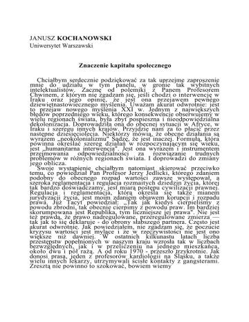 JANUSZ KOCHANOWSKI Uniwersytet Warszawski Znaczenie kapitału społecznego Chciałbym serdecznie podziękować za tak uprzejme zaproszenie mnie do udziału w tym panelu, w gronie tak wybitnych intelektualistów. Zacznę od polemiki z Panem Profesorem Chwinem, z którym nie zgadzam się, jeśli chodzi o interwencję w Iraku oraz jego opinię, że jest ona przejawem pewnego dziewiętnastowiecznego myślenia. Uważam akurat odwrotnie: jest to przejaw nowego myślenia XXI w. Jednym z największych błędów poprzedniego wieku, którego konsekwencje obserwujemy w wielu regionach świata, była zbyt pospieszna i nieodpowiedzialna dekolonizacja. Doprowadziła ona do obecnej sytuacji w Afryce, w Iraku i szeregu innych krajów. Przyjdzie nam za to płacić przez następne dziesięciolecia. Niektórzy mówią, że obecne działania są wyrazem „neokolonializmu" Sądzę, że jest inaczej. Formułą, która powinna określać szereg działań w rozpoczynającym się wieku, jest „humanitarna interwencja". Jest ona wyrazem i instrumentem przejmowania odpowiedzialności za rozwiązanie trudnych problemów w różnych regionach świata. I doprowadzi do zmiany jego oblicza. Swoje wystąpienie chciałbym natomiast skierować przeciwko temu, co powiedział Pan Profesor Jerzy Jedlicki, którego zdaniem podobny do obecnego rozpad wartości zawsze występował, a szeroka reglamentacja i regulacja rozmaitych dziedzin życia, której tak bardzo doświadczamy, jest miarą postępu cywilizacji prawnej. Regulacja i reglamentacja, którą określa się także mianem jurydyzacji życia, jest moim zdaniem objawem korupcji i rozpadu prawa. Już Tacyt powiedział: „Tak jak kiedyś cierpieliśmy z powodu zbrodni, tak obecnie cierpimy z powodu praw. Im bardziej skorumpowana jest Republika, tym liczniejsze jej prawa". Nie jest też prawdą, że prawo nadregulowane, przeregulowane zmierza — tak jak to się deklaruje - do obrony słabszego partnera. Często jest akurat odwrotnie. Jak powiedziałem, nie zgadzam się, że poczucie kryzysu wartości jest mylące i że w rzeczywistości nie jest ono większe niż dawniej. W ostatnich kilkunastu latach liczba przestępstw popełnionych w naszym kraju wzrosła tak w liczbach bezwzględnych, jak i w przeliczeniu na jednego mieszkańca, około dwu i pół rażą. A od roku 1970 - przeszło trzykrotnie. Jak donosi prasa, jeden z profesorów kardiologii na Śląsku, a także wielu innych lekarzy, utrzymywali ścisłe kontakty z gangsterami. Zresztą nie powinno to szokować, bowiem wiemy 282 o takich samych sytuacjach dotyczących sędziów i polityków. Jeśli chodzi o tych ostatnich, zwykło się mówić, że wskaźnik przestępczości wśród chronionych immunitetem członków parlamentu znacznie przewyższa średnią krajową. Wystarczy wymienić aferę Rywina czy obecnie aferę starachowicką. Przed chwilą czytałem w „Rzeczypospolitej" o kolejnej aferze jakiegoś posła SLD, który coś tam znowu zrobił. Pojemność pamięci jest zbyt mała, aby to wszystko móc ogarnąć. Jak pisze jeden z publicystów, korupcja jest jedną z miar wartości człowieka, gdyż przekupywanie zachodzi tylko wówczas, gdy jakaś osoba jest podatna na przekupstwo i odnosi się to również do przekupującego. Jakby tego jeszcze było mało, pewien biskup prowadzi samochód po pijanemu. Jak Państwo wiedzą z prasy, kobiety polskie stały się niebezpieczne dla swych dzieci. Ilość dzieciobójstw rośnie w sposób zastraszający. Te i wszystkie inne zjawiska dają się sprowadzić do pierwszego członu tematu tego posiedzenia. Mianowicie określany on jest mianem zaniku normatywizmu, anomii. Ja bym wolał użyć innego terminu, którym będę się tu w dalszym ciągu posługiwał: ów termin to „rozpad kapitału społecznego". Jest to bardzo modne określenie, ale określenie, wydaje mi się, pokazujące pewien element większej całości, a mianowicie, gdy w stosunkach gospodarczych mówimy o kapitale ekonomicznym czy o kapitale ludzkim, to obok nich powinniśmy postawić trzeci element - kapitał społeczny, przy czym jest on ważniejszy od tych dwóch pierwszych, gdyż bez niego zarówno kapitał ludzki, jak i finansowy ulegają rozpadowi, i - w odróżnieniu od tamtych - nie można tego kapitału importować. Co to jest kapitał społeczny? Przytoczę jedną z jego definicji. Oznacza on zestaw pewnych podstawowych wartości, takich jak: uczciwość, prawdomówność, wywiązywanie się z umów i dotrzymywanie danego słowa, wzajemność w stosunkach z innymi oraz pamięć o swoich obowiązkach jako podstawie istnienia każdej grupy społecznej. Od czasów Maxa Webera wiadomo, że ustrój kapitalistyczny i zachodnie demokracje nieprzypadkowo były zbudowane właśnie na purytańskim etosie uczciwości. Współczesne przykłady państw i systemów kapitalistycznych, w których ustrój demokratyczny próbuje się budować bez kapitału społecznego, potwierdzają, że bez pewnego jego zasobu jest to niemożliwe. Jednocześnie wydaje się, że kapitalizm, stawiając według zasad klasycznego liberalizmu i indywidualizmu interes materialny jednostki nad zobowiązaniami moralnymi, zużywa więcej kapitału społecznego, niż jest go zdolny stworzyć, przez indywidualistyczne założenia wolnego rynku podkopując swoje moralne fundamenty. O istniejącym zasobie czy też aktualnym stanie kapitału społecznego, o którym najlepiej wiemy z codziennej obserwacji, można w sposób bardziej obiektywny przekonać się przy pomocy sondaży opinii publicznej, pytając o wzajemne zaufanie współobywateli do siebie, zaufanie do takich instytucji jak sądy czy parlament, o to, czy bylibyśmy skłonni wziąć lub dać łapówkę, 283 popełnić oszustwo podatkowe itd. Miarą tego kapitału jest także stopień udziału w demokratycznych procedurach, czy to w postaci wyborów parlamentarnych, czy samorządowych, a także aktywność w lokalnych stowarzyszeniach. Można też go badać od strony negaty