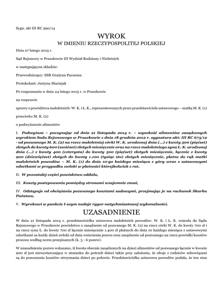 Sygn. akt III RC 590/14 WYROK W IMIENIU RZECZYPOSPOLITEJ POLSKIEJ Dnia 27 lutego 2015 r. Sąd Rejonowy w Pruszkowie III Wydział Rodzinny i Nieletnich w następującym składzie: Przewodniczący: SSR Grażyna Paczesna Protokolant: Justyna Maciejak Po rozpoznaniu w dniu 24 lutego 2015 r. w Pruszkowie na rozprawie sprawy z powództwa małoletnich: W. K. i Ł. K., reprezentowanych przez przedstawiciela ustawowego – matkę M. K. (1) przeciwko M. K. (2) o podwyższenie alimentów I. Podwyższa – poczynając od dnia 21 listopada 2014 r. – wysokość alimentów zasądzonych wyrokiem Sadu Rejonowego w Pruszkowie z dnia 18 grudnia 2012 r. sygnatura akt: III RC 673/12 - od pozwanego M. K. (2) na rzecz małoletniej córki W. K. urodzonej dnia (...) z kwoty 500 (pięćset) złotych do kwoty 600 (sześćset) złotych miesięcznie oraz na rzecz małoletniego syna Ł. K. urodzonej dnia (...) z kwoty 400 (czterysta) do kwoty 500 (pięćset) złotych miesięcznie, łącznie z kwoty 900 (dziewięćset) złotych do kwoty 1.100 (tysiąc sto) złotych miesięcznie, płatne do rąk matki małoletnich powodów – M. K. (1) do dnia 10-go każdego miesiąca z góry wraz z ustawowymi odsetkami w przypadku zwłoki w płatności którejkolwiek z rat, II. W pozostałej części powództwo oddala, III. Koszty postepowania pomiędzy stronami wzajemnie znosi, IV. Odstępuje od obciążania pozwanego kosztami sadowymi, przejmując je na rachunek Skarbu Państwa, V. Wyrokowi w punkcie I-szym nadaje rygor natychmiastowej wykonalności. UZASADNIENIE W dniu 21 listopada 2014 r. przedstawicielka ustawowa małoletnich powodów: W. K. i Ł. K. wniosła do Sądu Rejonowego w Pruszkowie powództwo o zasądzenie od pozwanego M. K. (2) na rzecz córki W. K. do kwoty 700 zł i na rzecz syna Ł. do kwoty 700 zł łącznie miesięcznie 1.400 zł płatnych do dnia 10 każdego miesiąca z ustawowymi odsetkami za każdy dzień zwłoki od dnia wniesienia pozwu oraz zasądzenie od pozwanego na rzecz powódki kosztów procesu według norm przepisanych (k. 3 - 6 pozew). W uzasadnieniu pozwu wskazano, iż kwota obecnie zasądzonych na dzieci alimentów od pozwanego łącznie w kwocie 900 zł jest niewystarczająca w stosunku do potrzeb dzieci także przy założeniu, że oboje z rodziców zobowiązani są do ponoszenia kosztów utrzymania dzieci po połowie. Przedstawicielka ustawowa powodów podała, że ten stan rzeczy powoduje, że dzieci okresowo korzystają też z pomocy ośrodka Pomocy Społecznej, a matka dzieci korzysta z pomocy zakładowej organizacji związkowej w postaci zapomogi. Ponadto istniejący stan zdrowia dzieci powoduje, że znaczące kwoty wydatkowane są na ich leki, leczenie, wyjazdy na rehabilitacje i środki rehabilitacyjne, z których muszą korzystać. Podniosła również, że w związku z zdiagnozowanymi chorobami dzieci potrzebują nie tylko pożywienia w zakresie podstawowym, ale przede wszystkim zawierającego duże ilości witamin i minerałów, które są pomocne w procesie ich rehabilitacji. W październiku syn Ł. przebywał w szpitalu na oddziale (...). Przy wypisie dostał wyraźne zalecenia co do odżywiania, dieta (...). Jest to dieta bogata w warzywa i owoce oraz węglowodany, pełnoziarniste, ponadto musi brać leki zlecone przez lekarza. Przedstawicielka ustawowa powodów podała, iż pozwany ogranicza się do regulowania alimentów i nie uczestniczy w żadnych czynnościach związanych z wychowaniem i pomocą dla dzieci, które pozostają pod opieką matki, z którą zamieszkują. Wskazała, że pozwany z zawodu jest (...) i (...) co umożliwia mu też podejmowanie innych dodatkowych form zatrudnienia. Dla znanych tylko pozwanemu powodów, pozwany jest obecnie bezrobotny. Być może dla potrzeb właśnie minimalizowania swoich wydatków na rzecz dzieci. W piśmie z dnia 22.01.2015 r. przedstawicielka ustawowa powodów wskazała koszty utrzymania powodów na łączną kwotę 2.800 zł, w tym: koszty wyżywienia około 1000 zł, opłaty mieszkaniowe około 800 zł, kosmetyki i środki higieny osobistej około 200 zł, leki i rehabilitacja, sprzęt rehabilitacyjny, materiały opatrunkowe około 150 zł, szkoła, wycieczki szkolne oraz składki klasowe – około 150 zł, obiady w szkole dla Ł. – około 80 zł, bilet miesięczny powódki – 105 zł, bielizna i odzież – 200 zł, kino, słodycze, inne – około 115 zł (k. 127 akt). W odpowiedzi na pozew wniesionej w dniu 19 stycznia 2015 r. pozwany M. K. (2) wniósł o oddalenie powództwa w całości oraz zasądzenie kosztów sądowych od strony powodowej wg norm przepisanych (k. 118-125 akt) W uzasadnieniu pozwany wskazał, iż jego stan rodzinny i majątkowy nie pozwala mu na jakiekolwiek inne wydatki, co skutkowałoby narażeniem go na uszczerbek konieczny dla utrzymania. Pozwany wskazał, że twierdzenia przedstawicielki ustawowej powodów, przedstawione w pozwie są bezpodstawne, w tym zarzut o unikaniu pracy przez pozwanego, bowiem obecna sytuacja ekonomiczna i na rynku pracy w Polsce przedstawia się w ten sposób, że pracodawcy nie chcą zatrudniać nowych pracowników. Twierdzi, iż umowy na czas nieokreślony, a przy tym na godziwych warunkach finansowych, które pozwany określa na minimum 1.500 zł miesięcznie netto, praktycznie nie są zawierane, a pracodawcy oferują co najwyżej umowy na czas określony lub umowy – zlecenia na warunkach finansowych znacznie gorszych, niż 1500 zł netto miesięcznie. Pozwany zaprzecza też zarzutom matki powodów, że unika pracy, bowiem jego zdaniem jest on gotów podjąć każdą legalną pracę na umowę na czas nieokreślony lub nawet na czas określony, czy nawet na umowę – zlecenie, ale na uczciwych warunkach, a nie „pracę na czarno”. Pozwany podał, że w roku 2014 udało się mu uzyskać pracę na dość korzystnych warunkach w (...) Sp. z o.o., gdzie pozwany uzyskał ok. 2.400 zł netto/miesięcznie, ale pozwany był zatrudniony tylko od 5 maja do 27 września, dlatego