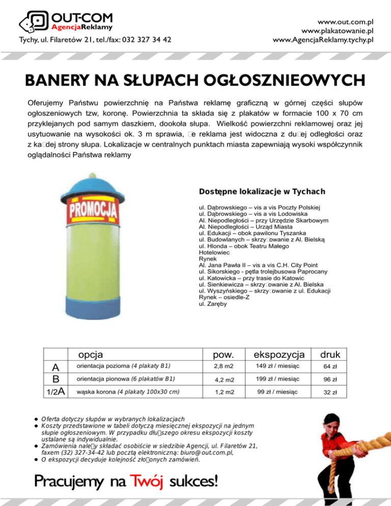 www.out.com.pl www.plakatowanie.pl www.AgencjaReklamy.tychy.pl Tychy, ul. Filaretów 21, tel./fax: 032 327 34 42 Oferujemy Państwu powierzchnię na Państwa reklamę graficzną w górnej części słupów ogłoszeniowych tzw, koronę. Powierzchnia ta składa się z plakatów w formacie 100 x 70 cm przyklejanych pod samym daszkiem, dookoła słupa. Wielkość powierzchni reklamowej oraz jej usytuowanie na wysokości ok. 3 m sprawia, że reklama jest widoczna z dużej odległości oraz z każdej strony słupa. Lokalizacje w centralnych punktach miasta zapewniają wysoki współczynnik oglądalności Państwa reklamy Dostępne lokalizacje w Tychach ul. Dąbrowskiego – vis a vis Poczty Polskiej ul. Dąbrowskiego – vis a vis Lodowiska Al. Niepodległości – przy Urzędzie Skarbowym Al. Niepodległości – Urząd Miasta ul. Edukacji – obok pawilonu Tyszanka ul. Budowlanych – skrzyżowanie z Al. Bielską ul. Hlonda – obok Teatru Małego Hotelowiec Rynek Al. Jana Pawła II – vis a vis C.H. City Point ul. Sikorskiego - pętla trolejbusowa Paprocany ul. Katowicka – przy trasie do Katowic ul. Sienkiewicza – skrzyżowanie z Al. Bielska ul. Wyszyńskiego – skrzyżowanie z ul. Edukacji Rynek – osiedle-Z ul. Zaręby A B 1/2A opcja pow. ekspozycja orientacja pozioma (4 plakaty B1) 2,8 m2 149 zł / miesiąc 64 zł orientacja pionowa (6 plakatów B1) 4,2 m2 199 zł / miesiąc 96 zł wąska korona (4 plakaty 100x30 cm) 1,2 m2 99 zł / miesiąc 32 zł Oferta dotyczy słupów w wybranych lokalizacjach Koszty przedstawione w tabeli dotyczą miesięcznej ekspozycji na jednym słupie ogłoszeniowym. W przypadku dłuższego okresu ekspozycji koszty ustalane są indywidualnie. Zamówienia należy składać osobiście w siedzibie Agencji, ul. Filaretów 21, faxem (32) 327-34-42 lub pocztą elektroniczną: [email protected], O ekspozycji decyduje kolejność złożonych zamówień. druk