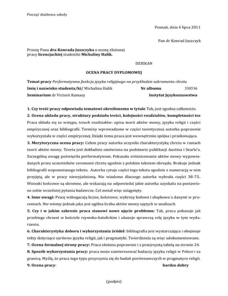 Pieczęć służbowa szkoły Poznań, dnia 4 lipca 2011 Pan dr Konrad Juszczyk Proszę Pana dra Konrada Juszczyka o ocenę złożonej pracy licencjackiej studentki Michaliny Halik. DZIEKAN OCENA PRACY DYPLOMOWEJ Temat pracy Performatywna funkcja języka religijnego na przykładzie sakramentu chrztu Imię i nazwisko studenta/ki/ Michalina Halik Nr albumu Seminarium dr Victorii Kamasy 330536 Instytut Językoznawstwa 1. Czy treść pracy odpowiada tematowi określonemu w tytule Tak, jest zgodna całkowicie. 2. Ocena układu pracy, struktury podziału treści, kolejności rozdziałów, kompletności tez Praca składa się ze wstępu, trzech rozdziałów: opisu teorii aktów mowy, języka religii i części empirycznej oraz bibliografii. Terminy wprowadzone w części teoretycznej autorka poprawnie wykorzystała w części empirycznej. Dzięki temu praca jest wewnętrznie spójna i przekonująca. 3. Merytoryczna ocena pracy: Celem pracy autorka uczyniła charakterystykę chrztu w ramach teorii aktów mowy. Teoria jest dokładnie omówiona na podstawie publikacji Austina i Searle’a. Szczególną uwagę poświęciła performatywom. Pokazała zróżnicowanie aktów mowy wypowiadanych przez uczestników ceremonii chrztu zgodnie z polskim tekstem obrzędu. Brakuje jednak bibliografii wspomnianego tekstu. Autorka cytuje części tego tekstu zgodnie z numeracją w nim przyjętą, ale w pracy niewyjaśnioną. Nie wiadomo dlaczego autorka wybrała części 38-73.. Wnioski końcowe są skromne, ale wskazują na odpowiedzi jakie autorka uzyskała na postawione sobie wcześniej pytania badawcze. Cel został więc osiągnięty. 4. Inne uwagi: Pracę wzbogacają liczne, kolorowe, wykresy kołowe i słupkowe z danymi w procentach. Nie wiemy jednak jaka jest ogólna liczba aktów mowy ujętych w analizach. 5. Czy i w jakim zakresie praca stanowi nowe ujęcie problemu: Tak, praca pokazuje jak przebiega chrzest w kościele rzymsko-katolickim i ukazuje sprawczą rolę języka w tym wydarzeniu. 6. Charakterystyka doboru i wykorzystania źródeł: bibliografia jest wystarczająca i obejmuje tekty dotyczące zarówno języka religii, jak i pragmatyki. Twierdzenia są więc udokumentowane. 7. Ocena formalnej strony pracy: Praca złożona poprawnie i z przejrzystą tabelą na stronie 24. 8. Sposób wykorzystania pracy: praca może zainteresować badaczy języka religii w Polsce i za granicą. Myślę, że praca tego typu przyczynia się do badań porównawczych w pragmatyce religii. 9. Ocena pracy: bardzo dobry (podpis)