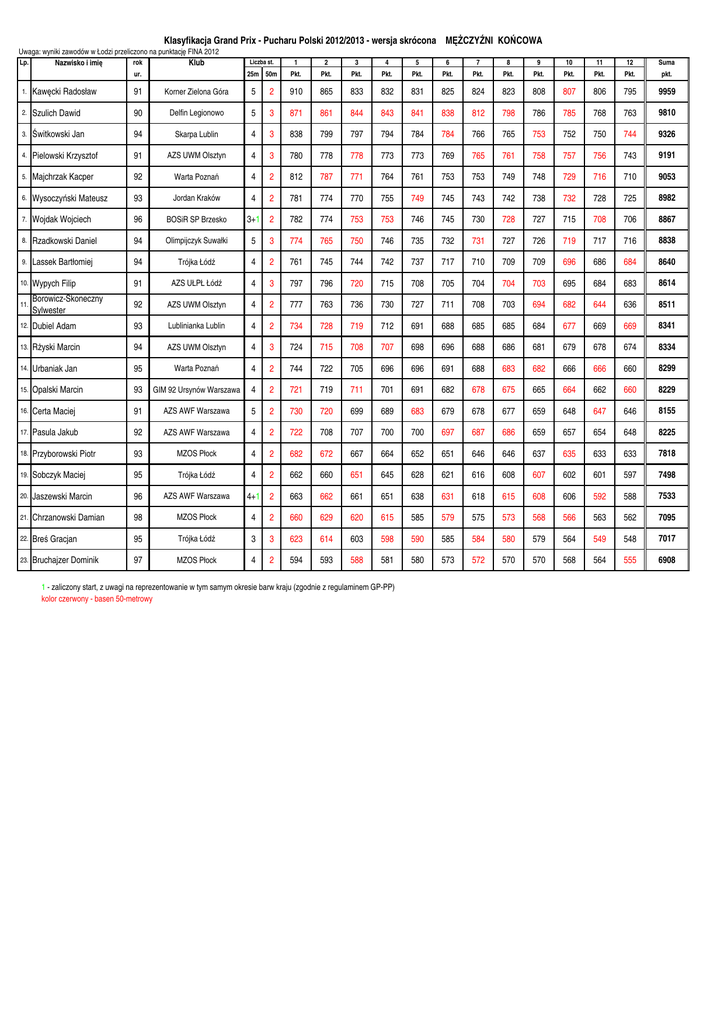 Klasyfikacja Grand Prix - Pucharu Polski 2012/2013 - wersja skrócona MĘśCZYŹNI KOŃCOWA Uwaga: wyniki zawodów w Łodzi przeliczono na punktację FINA 2012 Lp. rok Nazwisko i imię Klub ur. Liczba st. 1 2 3 4 5 6 7 8 9 10 11 12 Suma 25m 50m Pkt. Pkt. Pkt. Pkt. Pkt. Pkt. Pkt. Pkt. Pkt. Pkt. Pkt. Pkt. pkt. 1. Kawęcki Radosław 91 Korner Zielona Góra 5 2 910 865 833 832 831 825 824 823 808 807 806 795 9959 2. Szulich Dawid 90 Delfin Legionowo 5 3 871 861 844 843 841 838 812 798 786 785 768 763 9810 3. Świtkowski Jan 94 Skarpa Lublin 4 3 838 799 797 794 784 784 766 765 753 752 750 744 9326 4. Pielowski Krzysztof 91 AZS UWM Olsztyn 4 3 780 778 778 773 773 769 765 761 758 757 756 743 9191 5. Majchrzak Kacper 92 Warta Poznań 4 2 812 787 771 764 761 753 753 749 748 729 716 710 9053 6. Wysoczyński Mateusz 93 Jordan Kraków 4 2 781 774 770 755 749 745 743 742 738 732 728 725 8982 7. Wojdak Wojciech 96 BOSiR SP Brzesko 3+1 2 782 774 753 753 746 745 730 728 727 715 708 706 8867 8. Rzadkowski Daniel 94 Olimpijczyk Suwałki 5 3 774 765 750 746 735 732 731 727 726 719 717 716 8838 9. Lassek Bartłomiej 94 Trójka Łódź 4 2 761 745 744 742 737 717 710 709 709 696 686 684 8640 10. Wypych Filip 91 AZS UŁPŁ Łódź 4 3 797 796 720 715 708 705 704 704 703 695 684 683 8614 11. Borowicz-Skoneczny Sylwester 92 AZS UWM Olsztyn 4 2 777 763 736 730 727 711 708 703 694 682 644 636 8511 12. Dubiel Adam 93 Lublinianka Lublin 4 2 734 728 719 712 691 688 685 685 684 677 669 669 8341 13. RŜyski Marcin 94 AZS UWM Olsztyn 4 3 724 715 708 707 698 696 688 686 681 679 678 674 8334 14. Urbaniak Jan 95 Warta Poznań 4 2 744 722 705 696 696 691 688 683 682 666 666 660 8299 15. Opalski Marcin 93 GIM 92 Ursynów Warszawa 4 2 721 719 711 701 691 682 678 675 665 664 662 660 8229 16. Certa Maciej 91 AZS AWF Warszawa 5 2 730 720 699 689 683 679 678 677 659 648 647 646 8155 17. Pasula Jakub 92 AZS AWF Warszawa 4 2 722 708 707 700 700 697 687 686 659 657 654 648 8225 18. Przyborowski Piotr 93 MZOS Płock 4 2 682 672 667 664 652 651 646 646 637 635 633 633 7818 19. Sobczyk Maciej 95 Trójka Łódź 4 2 662 660 651 645 628 621 616 608 607 602 601 597 7498 20. Jaszewski Marcin 96 AZS AWF Warszawa 4+1 2 663 662 661 651 638 631 618 615 608 606 592 588 7533 21. Chrzanowski Damian 98 MZOS Płock 4 2 660 629 620 615 585 579 575 573 568 566 563 562 7095 22. Breś Gracjan 95 Trójka Łódź 3 3 623 614 603 598 590 585 584 580 579 564 549 548 7017 23. Bruchajzer Dominik 97 MZOS Płock 4 2 594 593 588 581 580 573 572 570 570 568 564 555 6908 1 - zaliczony start, z uwagi na reprezentowanie w tym samym okresie barw kraju (zgodnie z regulaminem GP-PP) kolor czerwony - basen 50-metrowy