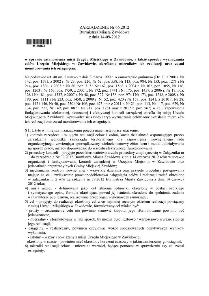 ZARZĄDZENIE Nr 66.2012 Burmistrza Miasta Zawidowa z dnia 14-09-2012 w sprawie ustanowienia misji Urzędu Miejskiego w Zawidowie, a także sposobu wyznaczania celów Urzędu Miejskiego w Zawidowie, określania mierników ich realizacji oraz zasad monitorowania ich osiągnięcia. Na podstawie art. 40 ust. 2 ustawy z dnia 8 marca 1990 r. o samorządzie gminnym (Dz. U. z 2001r. Nr 142, poz. 1591, z 2002 r. Nr 23, poz. 220, Nr 62, poz. 558, Nr 113, poz. 984, Nr 153, poz. 1271 i Nr 214, poz. 1806, z 2003 r. Nr 80, poz. 717 i Nr 162, poz. 1568, z 2004 r. Nr 102, poz. 1055, Nr 116, poz. 1203 i Nr 167, poz. 1759, z 2005 r. Nr 172, poz. 1441 i Nr 175, poz. 1457, z 2006 r. Nr 17, poz. 128 i Nr 181, poz. 1337, z 2007 r. Nr 48, poz. 327, Nr 138, poz. 974 i Nr 173, poz. 1218, z 2008 r. Nr 180, poz. 1111 i Nr 223, poz. 1458, z 2009 r. Nr 52, poz. 420 i Nr 157, poz. 1241, z 2010 r. Nr 28, poz. 142 i 146, Nr 40, poz. 230 i Nr 106, poz. 675 oraz z 2011 r. Nr 21, poz. 113, Nr 117, poz. 679, Nr 134, poz. 777, Nr 149, poz. 887 i Nr 217, poz. 1281 oraz z 2012 r. poz. 567) w celu zapewnienia funkcjonowania adekwatnej, skutecznej i efektywnej kontroli zarządczej określa się misję Urzędu Miejskiego w Zawidowie, wprowadza się zasady i tryb wyznaczania celów oraz określania mierników ich realizacji oraz zasad monitorowania ich osiągnięcia. § 1. Użyte w niniejszym zarządzeniu pojęcia mają następujące znaczenie: 1) kontrola zarządcza – w ujęciu realizacji celów i zadań, każda działalność wspomagająca proces zarządzania jednostką samorządu terytorialnego dla zapewnienia wewnętrznego ładu organizacyjnego, zawierająca uporządkowany wieloelementowy zbiór form i metod oddziaływania na sposób pracy, mający doprowadzić do wzrostu efektywności funkcjonowania; 2) procedury kontroli - przyjęte przez kierownictwo urzędu procedury znajdujące się w Załączniku nr 1 do zarządzenia Nr 39.2012 Burmistrza Miasta Zawidowa z dnia 14 czerwca 2012 roku w sprawie organizacji i funkcjonowania kontroli zarządczej w Urzędzie Miejskim w Zawidowie oraz jednostkach organizacyjnych Gminy Miejskiej Zawidów; 3) mechanizmy kontroli wewnętrznej - wszystkie działania oraz przyjęte procedury postępowania mające na celu zwiększenie prawdopodobieństwa osiągnięcia celów i realizacji zadań określone w załączniku nr 2 w/w zarządzenia nr 39.2012 Burmistrza Miasta Zawidowa z dnia 14 czerwca 2012 roku; 4) misja urzędu - definiowana jako: cel istnienia jednostki, określony w postaci krótkiego i syntetycznego opisu, formuła określająca powód jej istnienia określone do spełnienia zadanie o charakterze publicznym, realizowane przez organ wykonawczy samorządu; 5) cel – przyjęty do realizacji określony cel z co najmniej rocznym okresem realizacji powiązany z misją Urzędu Miejskiego w Zawidowie, formułowany cel winien być: - prosty – zrozumienie celu nie powinno stanowić kłopotu, jego sformułowanie powinno być jednoznaczne, - mierzalny - sformułowany w taki sposób, by można było liczbowo / wartościowo wyrazić stopień jego realizacji, - osiągalny – realistyczny, powinien oscylować wokół spodziewanych pozytywnych wyników wykonania, - istotny – ważny i powiązany z misją Urzędu Miejskiego w Zawidowie, - określony w czasie – powinien mieć określony horyzont czasowy w jakim zamierzamy go osiągnąć; 6) mierniki realizacji celów – mierzalne wartości, będące pomocne w sprawdzeniu czy cel został osiągnięty. § 2. Określa się misję Urzędu Miejskiego w Zawidowie w brzmieniu: Misją Urzędu Miejskiego w Zawidowie jest zaspokajanie potrzeb zbiorowych i indywidualnych społeczności lokalnej w sposób profesjonalny, rzetelny i skuteczny, kierując się zasadami legalizmu, celowości, bezstronności i obiektywizmu przy gospodarnym wykorzystaniu środków, którymi dysponuje administracja samorządowa. § 3. 1. Misja Urzędu Miejskiego w Zawidowie realizowana jest przez wykonywanie określonych zadań. 2. Struktura organizacyjna Urzędu Miejskiego w Zawidowie jest powiązana z misją jednostki i zadaniami przez nią realizowanymi. 3. Kierownik referatu oraz pracownik na samodzielnym stanowisku pracy odpowiada za realizację konkretnego zadania lub zadań w zakresie określonym w przepisach określających zakres obowiązków tej komórki. 4. Cele oraz zadania na kolejny rok kalendarzowy, za których realizację odpowiadają kierownicy referatów / pracownicy na samodzielnych stanowiskach pracy powinny być bezpośrednio związane z misją Urzędu Miejskiego w Zawidowie. 5. Termin i sposób składania w/w zadań i celów określone zostały w Zarządzeniu Nr 39.2012 Burmistrza Miasta Zawidowa z dnia 14 czerwca 2012 roku w sprawie organizacji i funkcjonowania kontroli zarządczej w Urzędzie Miejskim w Zawidowie oraz jednostkach organizacyjnych Gminy Miejskiej Zawidów. 6. Kierownicy referatów w Urzędzie Miejskim w Zawidowie oraz pracownicy na samodzielnych stanowiskach pracy sporządzają sprawozdanie z realizacji zadań i celów, którego wzór stanowi załącznik nr 1 niniejszego zarządzenia, które przekazują Sekretarzowi Miasta do dnia 31 stycznia roku następnego. 7. Sprawozdanie z realizacji celów i zadań podlega zatwierdzeniu przez Burmistrza Miasta Zawidowa i zamieszczeniu w BIP Gminy Miejskiej Zawidów. 8. W związku z tym, iż jest to informacja zarządcza dla Burmistrza Miasta – treść protokołów z realizacji celów, notatek i informacji udostępniana jest na wniosek. § 4. Zarządzenie wchodzi w życie z dniem podjęcia. Burmistrz Miasta Zawidowa Robert Łężny