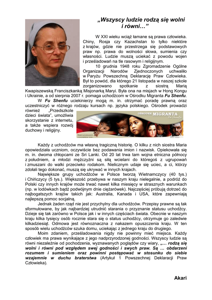 „Wszyscy ludzie rodzą się wolni i równi…” W XXI wieku wciąŜ łamane są prawa człowieka. Chiny, Rosja czy Kazachstan to tylko niektóre z krajów, gdzie nie przestrzega się podstawowych praw np. prawa do wolności słowa, sumienia czy własności. Ludzie muszą uciekać z powodu wojen i prześladowań na tle rasowym i religijnym. 10 grudnia 1948 roku Zgromadzenie Ogólne Organizacji Narodów Zjednoczonych uchwaliło w ParyŜu Powszechną Deklarację Praw Człowieka. Był to powód, dla którego 21 listopada w naszej szkole zorganizowano spotkanie z siostrą Marią Kwapiszewską Franciszkanką Misjonarką Maryi. Była ona na misjach w Hong Kongu i Ukrainie, a od sierpnia 2007 r. pomaga uchodźcom w Ośrodku Migranta Fu Shenfu. W Fu Shenfu uciekinierzy mogą m. in. otrzymać poradę prawną oraz uczestniczyć w róŜnego rodzaju kursach np. języka polskiego. Ośrodek prowadzi równieŜ „Przedszkole dzieci świata”, umoŜliwia skorzystanie z internetu, a takŜe wspiera rozwój duchowy i religijny. KaŜdy z uchodźców ma własną tragiczną historię. O kilku z nich siostra Maria opowiedziała uczniom, oczywiście bez podawania imion i nazwisk. Opiekowała się m. in. dwoma chłopcami ze Sri Lanki. Od 20 lat trwa tam wojna etniczna północy z południem, a młodzi męŜczyźni są siłą wcielani do któregoś z ugrupowań i zmuszani do walki przeciwko rodakom. Nielicznym udaje się uciec, a ci, którzy zdołali tego dokonać, muszą się ukrywać w innych krajach. Największe grupy uchodźców w Polsce tworzą Wietnamczycy (40 tys.) i Chińczycy (5 tys.). Większość przebywa w naszym kraju nielegalnie, a podróŜ do Polski czy innych krajów moŜe trwać nawet kilka miesięcy w strasznych warunkach (np. w lodówkach bądź podwójnym dnie cięŜarówek). Najczęściej próbują dotrzeć do najbogatszych krajów takich jak: Australia, Kanada i USA, które zapewniają najlepszą pomoc socjalną. Jednak Ŝaden rząd nie jest przychylny dla uchodźców. Przepisy prawne są tak sformułowane, by jak najbardziej utrudnić starania o przyznanie statusu uchodźcy. Dzieje się tak zarówno w Polsce jak i w innych częściach świata. Obecnie w naszym kraju kilka tysięcy osób rocznie stara się o status uchodźcy, otrzymuje go zaledwie kilkadziesiąt. Odmowa jest równoznaczna z nakazem opuszczenia kraju. W ten sposób wielu uchodźców szuka domu, uciekając z jednego kraju do drugiego. Moim zdaniem, prześladowania nigdy nie powinny mieć miejsca. KaŜdy człowiek ma prawa wynikające z jego nadprzyrodzonej godności. Wszyscy ludzie są równi niezaleŜnie od pochodzenia, wyznawanych poglądów czy wiary, „… rodzą się wolni i równi pod względem swej godności i swych praw. Są … obdarzeni rozumem i sumieniem oraz powinni postępować w stosunku do siebie wzajemnie w duchu braterstwa (Artykuł 1 Powszechnej Deklaracji Praw Człowieka). Akari