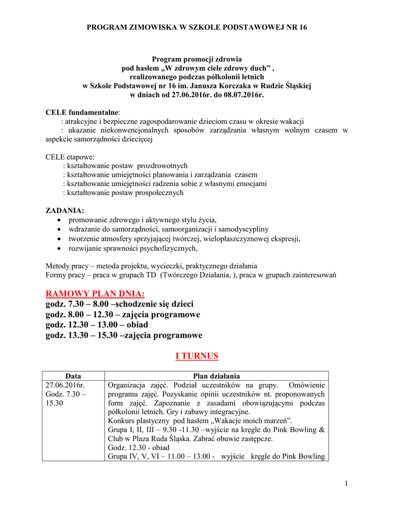 PROGRAM ZIMOWISKA W SZKOLE PODSTAWOWEJ NR 16 Program promocji zdrowia pod hasłem „W zdrowym ciele zdrowy duch” , realizowanego podczas półkolonii letnich w Szkole Podstawowej nr 16 im. Janusza Korczaka w Rudzie Śląskiej w dniach od 27.06.2016r. do 08.07.2016r. CELE fundamentalne: : atrakcyjne i bezpieczne zagospodarowanie dzieciom czasu w okresie wakacji : ukazanie niekonwencjonalnych sposobów zarządzania własnym wolnym czasem w aspekcie samorządności dziecięcej CELE etapowe: : kształtowanie postaw prozdrowotnych : kształtowanie umiejętności planowania i zarządzania czasem : kształtowanie umiejętności radzenia sobie z własnymi emocjami : kształtowanie postaw prospołecznych ZADANIA: promowanie zdrowego i aktywnego stylu życia, wdrażanie do samorządności, samoorganizacji i samodyscypliny tworzenie atmosfery sprzyjającej twórczej, wielopłaszczyznowej ekspresji, rozwijanie sprawności psychofizycznych, Metody pracy – metoda projektu, wycieczki, praktycznego działania Formy pracy – praca w grupach TD (Twórczego Działania, ), praca w grupach zainteresowań RAMOWY PLAN DNIA: godz. 7.30 – 8.00 –schodzenie się dzieci godz. 8.00 – 12.30 – zajęcia programowe godz. 12.30 – 13.00 – obiad godz. 13.30 – 15.30 –zajęcia programowe I TURNUS Data 27.06.2016r. Godz. 7.30 – 15.30 Plan działania Organizacja zajęć. Podział uczestników na grupy. Omówienie programu zajęć. Pozyskanie opinii uczestników nt. proponowanych form zajęć. Zapoznanie z zasadami obowiązującymi podczas półkolonii letnich. Gry i zabawy integracyjne. Konkurs plastyczny pod hasłem „Wakacje moich marzeń”. Grupa I, II, III – 9.30 -11.30 –wyjście na kręgle do Pink Bowling & Club w Plaza Ruda Śląska. Zabrać obuwie zastępcze. Godz. 12.30 - obiad Grupa IV, V, VI – 11.00 – 13.00 - wyjście kręgle do Pink Bowling 1 PROGRAM ZIMOWISKA W SZKOLE PODSTAWOWEJ NR 16 & Club w Plaza Ruda Śląska. Zabrać obuwie zastępcze. Godz. 13.00 - obiad Warsztaty plastyczne – origami. Gry i zabawy zespołowe. 28.06.2016r. godz. 7.30 – 15.30 Pogadanka na temat zachowania bezpieczeństwa podczas wycieczek i na basenie. Godz. 8.15 – wyjazd na basen kryty „Wodnik” w Paniówkach. Godz. 9.00 -11.00 zajęcia sportowo – rekreacyjne na basenie. Godz. 12.30 - obiad Turniej „Bezpieczne wakacje”. Gry i zabawy zespołowe 29.06.2016r. godz. 8.00 – 16.00 Wycieczka całodniowa do Dream Parku w Ochabach. W programie: zwiedzanie parku miniatur z przewodnikiem, zwiedzanie parku dinozaurów z przewodnikiem, zwiedzanie Oceanarium Prehistorycznego z przewodnikiem, kino 6d, bajkowe kino (bajki bez przemocy), park linowy (dwie trasy, wstęp dla osób od 140 cm wzrostu), mały park linowy (wstęp dla dzieci do 140 cm wzrostu), kule wodne, Wyspa Przygód (dmuchaniec dla dzieci), Ekstremalna Zjeżdżalnia (zjazd z dmuchańca z wysokości 6 m), eurobungee, trampolina, plac zabaw (karuzele, zjeżdżalnie, huśtawki, piracki statek), animacje dla dzieci. Zbiórka o godz. 8.00 na placu szkolnym przy ul. Westerplatte 2a. Powrót. Ok. godz. 16.00. Dzieci otrzymają tzw. suchy prowiant. Godz. 8.30 – 12.30 – wyjście na basen odkryty w Nowym Bytomiu. Godz. 12.30 – obiad Pogadanka na temat zdrowego odżywiania. Konkurs plastyczny nt. promowania zdrowego stylu życia Gry i zabawy zespołowe. Zabawy na placu zabaw. Wyjście do Cinema City na film wybrany przez dzieci. Godz. 12.30 - obiad Konkurs „Mam talent”. Dyskoteka. 30.06.2016r. godz. 7.30 – 15.30 01.07.2016r. godz. 7.30 – 15.30 2 PROGRAM ZIMOWISKA W SZKOLE PODSTAWOWEJ NR 16 II TURNUS Data 04.07.2016r. Godz. 7.30 – 15.30 Plan działania Organizacja zajęć. Podział uczestników na grupy. Omówienie programu zajęć. Pozyskanie opinii uczestników nt. proponowanych form zajęć. Zapoznanie z zasadami obowiązującymi podczas półkolonii letnich. Gry i zabawy integracyjne. Konkurs plastyczny pod hasłem „Wakacje moich marzeń”. Grupa I, II, III, IV – 9.30 -11.30 –wyjście na kręgle do Pink Bowling & Club w Plaza Ruda Śląska. Należy zabrać obuwie zastępcze. Godz. 12.30 - obiad Zabrać obuwie zastępcze. Godz. 13.00 - obiad Warsztaty plastyczne. Gry i zabawy zespołowe. 05.07.2016r. godz. 7.30 – 15.30 Pogadanka na temat zachowania bezpieczeństwa podczas wycieczek i na basenie. Godz. 8.15 – wyjazd do Aquadromu w Rudzie Śląskiej. Godz. 9.00 -11.00 zajęcia sportowo – rekreacyjne na basenie. Godz. 12.30 - obiad Turniej „Bezpieczne wakacje”. Gry i zabawy zespołowe 06.07.2016r. godz. 8.00 – 16.00 Wycieczka całodniowa do Krakowa. W programie: 1. Park edukacji globalnej „Wioski świata”. Zwiedzanie i udział w warsztatach „Dzień z życia w Afryce” oraz „Wśród Indian Ameryki Północnej”. 2. Spacer wzdłuż Wisły. 3. Wejście na dziedziniec arkadowy Zamku Wawel, Smocza Jama 4. Piknik nad Wisłą. Zbiórka o godz. 8.00 na placu szkolnym przy ul. Westerplatte 2a. Powrót. Ok. godz. 16.00. Dzieci otrzymają tzw. suchy prowiant. 07.07.2016r. godz. 7.30 – 15.30 08.07.2016r. godz. 7.30 – 15.30 Godz. 8.30 – 12.30 – wyjście na basen odkryty w Nowym Bytomiu. Godz. 12.30 – obiad Pogadanka na temat zdrowego odżywiania. Konkurs plastyczny nt. promowania zdrowego stylu życia Gry i zabawy zespołowe. Zabawy na placu zabaw. Wyjście do Cinema City na film wybrany przez dzieci. Godz. 12.30 - obiad Konkurs „Mam talent”. Dyskoteka. 3