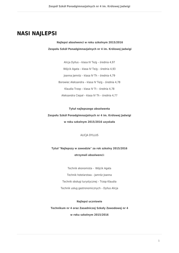 Zespół Szkół Ponadgimnazjalnych nr 4 im. Królowej Jadwigi NASI NAJLEPSI Najlepsi absolwenci w roku szkolnym 2015/2016 Zespołu Szkół Ponadgimnazjalnych nr 4 im. Królowej Jadwigi Alicja Dyllus – klasa IV Te/g – średnia 4,97 Wójcik Agata – klasa IV Te/g – średnia 4,93 Joanna Jamróz – klasa IV Th – średnia 4,79 Borowiec Aleksandra – klasa IV Te/g – średnia 4,78 Klaudia Trzop – klasa IV Tt – średnia 4,78 Aleksandra Ciepał – klasa IV Th – średnia 4,77 Tytuł najlepszego absolwenta Zespołu Szkół Ponadgimnazjalnych nr 4 im. Królowej Jadwigi w roku szkolnym 2015/2016 uzyskała ALICJA DYLLUS Tytuł "Najlepszy w zawodzie" za rok szkolny 2015/2016 otrzymali absolwenci: Technik ekonomista - Wójcik Agata Technik hotelarstwa – Jamróz Joanna Technik obsługi turystycznej – Trzop Klaudia Technik usług gastronomicznych – Dyllus Alicja Najlepsi uczniowie Technikum nr 4 oraz Zasadniczej Szkoły Zawodowej nr 4 w roku szkolnym 2015/2016 1 Zespół Szkół Ponadgimnazjalnych nr 4 im. Królowej Jadwigi Małek Magdalena – klasa 2 Te/h- średnia ocen 5,60 – Nagroda Prezesa Rady Ministrów Lenik Patrycja – klasa 3 Te/g- średnia ocen 5,41 Warzecha Agnieszka – klasa 2 aTg- średnia ocen 5,39 Jamróz Aleksandra – klasa 2 Te/h- średnia ocen 5,22 Kolat Florentyna – klasa 2 Te/h- średnia ocen 5,22 Lis Elżbieta – klasa 2 Tt- średnia ocen 5,13 Madej Angelika – klasa 2 Te/h- średnia ocen 5,07 Sikora Jadwiga – klasa 2 Te/h- średnia ocen 5,07 Konwerska Sandra – klasa 2 ZSZ- średnia ocen 5,00 Ziętek Natalia – klasa 2 ZSZ- średnia ocen 5,00 Pilch Ewelina – klasa I Tg - średnia ocen 5,00 Tomera Patryk – klasa 2 Te/h- średnia ocen 4,94 Paszcza Karolina – klasa 2 Te/h- średnia ocen 4,93 Wójtowiec Angelika – klasa 1 Te/g- średnia ocen 4,88 Błaś Natalia – klasa 2 Te/h- średnia ocen 4,87 Gorzkowska Anna – klasa 2 Te/h- średnia ocen 4,86 Rusin Patryk – klasa 2 Te/h- średnia ocen 4,83 Madejska Katarzyna – klasa 3 T h/t- średnia ocen 4,81 Januszewska Wioletta – klasa 2 Te/h- średnia ocen 4,80 Szubert Weronika – klasa 2 Te/h- średnia ocen 4,78 Szynalik Mateusz – klasa 3 Te/g- średnia ocen 4,75 2