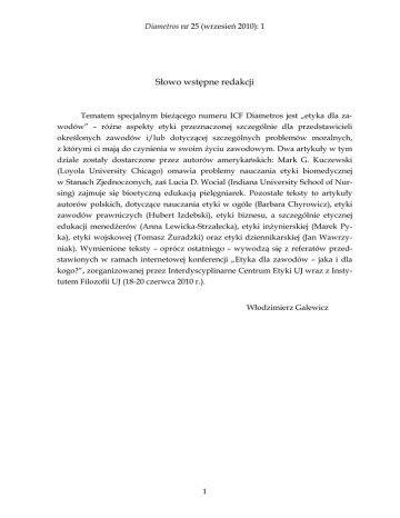 Diametros nr 25 (wrzesień 2010): 1 Słowo wstępne redakcji Tematem specjalnym bieżącego numeru ICF Diametros jest „etyka dla zawodów” – różne aspekty etyki przeznaczonej szczególnie dla przedstawicieli określonych zawodów i/lub dotyczącej szczególnych problemów moralnych, z którymi ci mają do czynienia w swoim życiu zawodowym. Dwa artykuły w tym dziale zostały dostarczone przez autorów amerykańskich: Mark G. Kuczewski (Loyola University Chicago) omawia problemy nauczania etyki biomedycznej w Stanach Zjednoczonych, zaś Lucia D. Wocial (Indiana University School of Nursing) zajmuje się bioetyczną edukacją pielęgniarek. Pozostałe teksty to artykuły autorów polskich, dotyczące nauczania etyki w ogóle (Barbara Chyrowicz), etyki zawodów prawniczych (Hubert Izdebski), etyki biznesu, a szczególnie etycznej edukacji menedżerów (Anna Lewicka-Strzałecka), etyki inżynierskiej (Marek Pyka), etyki wojskowej (Tomasz Żuradzki) oraz etyki dziennikarskiej (Jan Wawrzyniak). Wymienione teksty – oprócz ostatniego – wywodzą się z referatów przedstawionych w ramach internetowej konferencji „Etyka dla zawodów – jaka i dla kogo?”, zorganizowanej przez Interdyscyplinarne Centrum Etyki UJ wraz z Instytutem Filozofii UJ (18-20 czerwca 2010 r.). Włodzimierz Galewicz 1