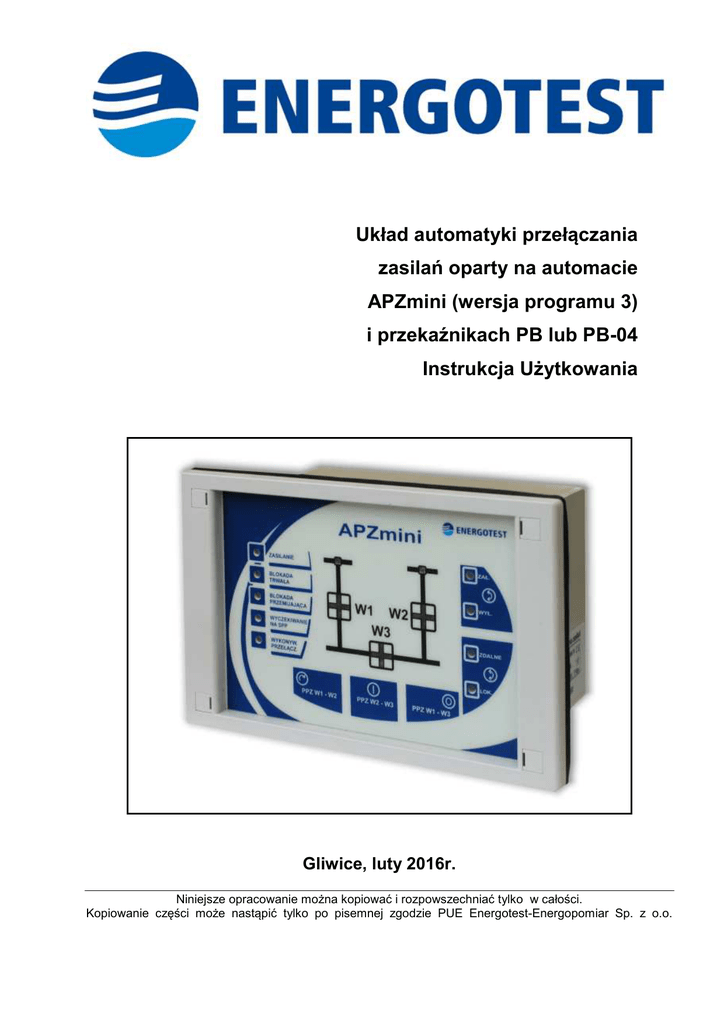 Układ automatyki przełączania zasilań oparty na automacie APZmini (wersja programu 3) i przekaźnikach PB lub PB-04 Instrukcja Użytkowania Gliwice, luty 2016r. Niniejsze opracowanie można kopiować i rozpowszechniać tylko w całości. Kopiowanie części może nastąpić tylko po pisemnej zgodzie PUE Energotest-Energopomiar Sp. z o.o. Instrukcja Użytkowania PUE Energotest-Energopomiar zastrzega sobie prawo wprowadzania zmian w swoich produktach polegających na doskonaleniu ich cech technicznych. Zmiany te nie zawsze mogą być na bieżąco uwzględniane w dokumentacji. Marki i nazwy produktów wymienione w niniejszej instrukcji stanowią znaki towarowe lub zarejestrowane znaki towarowe, należące odpowiednio do ich właścicieli. Tak można się z nami skontaktować: Energotest Sp. z o.o. ul. Chorzowska 44B 44-100 Gliwice Telefon – Centrala: 048-32-270 45 18 Telefon – Produkcja: 048-32-270 45 18 w. 40 Telefon – Marketing: 048-32-270 45 18 w. 25 Fax 048-32-270 45 17 Poczta elektroniczna – Produkcja: [email protected] Internet (www): http://www.energotest.com.pl Copyright 2004 by PUE Energotest-Energopomiar. Wszelkie prawa zastrzeżone. Automat APZmini wersja programu 3 (02.2016) 2 Instrukcja Użytkowania ZNACZENIE INSTRUKCJI UŻYTKOWANIA W razie wątpliwości co do właściwej interpretacji treści instrukcji prosimy koniecznie zwracać się o wyjaśnienie do producenta. Będziemy wdzięczni za wszelkiego rodzaju sugestie, opinie i krytyczne uwagi użytkowników, oraz prosimy o ich ustne lub pisemne przekazywanie. Pomoże nam to uczynić instrukcję jeszcze łatwiejszą w użyciu oraz uwzględnić życzenia i wymagania użytkowników. Urządzenie, do którego została dołączona niniejsza instrukcja, zawiera niemożliwe do wyeliminowania, potencjalne zagrożenie dla osób i wartości materialnych. Dlatego każda osoba, pracująca przy urządzeniu lub wykonująca jakiekolwiek czynności związane z obsługiwaniem i konserwowaniem urządzenia, musi zostać uprzednio przeszkolona i znać potencjalne zagrożenie. Wymaga to starannego przeczytania, zrozumienia i przestrzegania instrukcji użytkowania, w szczególności wskazówek dotyczących bezpieczeństwa. Automat APZmini wersja programu 3 (02.2016) 3 Instrukcja Użytkowania Spis treści ZNACZENIE INSTRUKCJI UŻYTKOWANIA................................................................... 3 Spis treści ............................................................................................................................ 4 INFORMACJA O ZGODNOŚCI....................................................................................... 7 1 Zastosowanie układu automatyki ................................................................................ 7 2 Zasady bezpieczeństwa.............................................................................................. 8 3 Opis techniczny......................................................................................................... 11 3.1 Opis ogólny......................................................................................................... 11 3.2 Obudowa automatu ............................................................................................ 16 3.3 Płyta czołowa automatu...................................................................................... 16 3.4 Blokowanie i odblokowywanie automatu ............................................................ 17 3.5 Sygnalizacja zakłóceń ........................................................................................ 18 3.5.1 Sygnalizacja wewnętrzna ............................................................................. 19 3.5.2 Sygnalizacja zewnętrzna .............................................................................. 19 3.6 Tryby pracy automatu ......................................................................................... 19 3.7 Sterowanie automatem....................................................................................... 19 3.7.1 Informacje ogólne ......................................................................................... 19 3.7.2 Wybór miejsca sterowania ............................................................................ 20 3.7.3 Załączenie (odblokowanie) i wyłączenie (odstawienie) automatu................. 20 3.7.4 Pobudzenie automatyki PPZ......................................................................... 22 3.7.5 Ręczne sterowanie (załączanie i wyłączanie) wyłącznikami i agregatem prądotwórczym.......................................................................................................... 22 3.8 Opis działania ..................................................................................................... 24 3.8.1 Automatyka samoczynnego załączania rezerwy (SZR)................................ 27 3.8.2 Automatyka planowego przełączania zasilań (PPZ) ..................................... 30 3.8.3 Automatyka samoczynnego przełączania powrotnego (SPP) ...................... 31 3.8.4 Automatyka załączania zasilania (AZZ)........................................................ 32 4 Dane techniczne ....................................................................................................... 36 5 Wykaz zastosowanych norm..................................................................................... 38 Automat APZmini wersja programu 3 (02.2016) 4 Instrukcja Użytkowania 6 Dane o kompletności................................................................................................. 39 7 Instalowanie .............................................................................................................. 40 7.1 Informacje ogólne ............................................................................................... 40 7.2 Instalowanie urządzeń układu automatyki przełączania zasilań ......................... 40 7.3 Rozmieszc