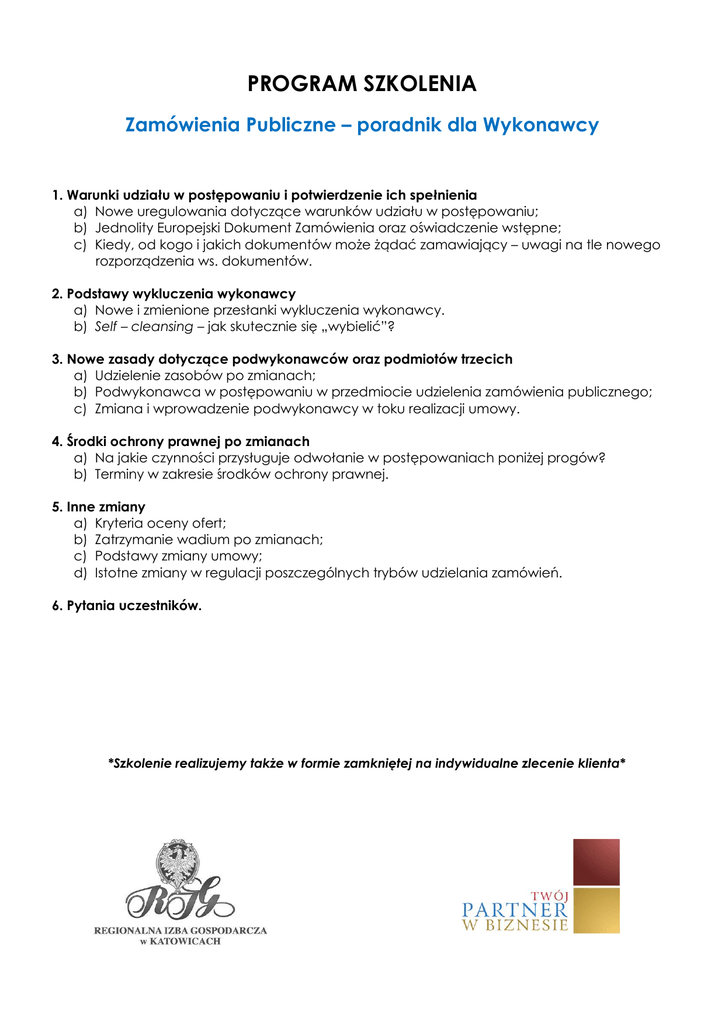 PROGRAM SZKOLENIA Zamówienia Publiczne – poradnik dla Wykonawcy 1. Warunki udziału w postępowaniu i potwierdzenie ich spełnienia a) Nowe uregulowania dotyczące warunków udziału w postępowaniu; b) Jednolity Europejski Dokument Zamówienia oraz oświadczenie wstępne; c) Kiedy, od kogo i jakich dokumentów może żądać zamawiający – uwagi na tle nowego rozporządzenia ws. dokumentów. 2. Podstawy wykluczenia wykonawcy a) Nowe i zmienione przesłanki wykluczenia wykonawcy. b) Self – cleansing – jak skutecznie się „wybielić”? 3. Nowe zasady dotyczące podwykonawców oraz podmiotów trzecich a) Udzielenie zasobów po zmianach; b) Podwykonawca w postępowaniu w przedmiocie udzielenia zamówienia publicznego; c) Zmiana i wprowadzenie podwykonawcy w toku realizacji umowy. 4. Środki ochrony prawnej po zmianach a) Na jakie czynności przysługuje odwołanie w postępowaniach poniżej progów? b) Terminy w zakresie środków ochrony prawnej. 5. Inne zmiany a) Kryteria oceny ofert; b) Zatrzymanie wadium po zmianach; c) Podstawy zmiany umowy; d) Istotne zmiany w regulacji poszczególnych trybów udzielania zamówień. 6. Pytania uczestników. *Szkolenie realizujemy także w formie zamkniętej na indywidualne zlecenie klienta*