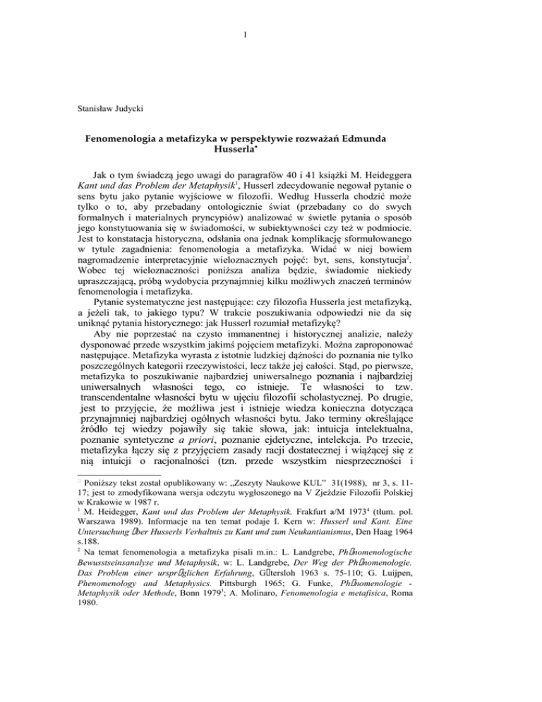 1 Stanisław Judycki Fenomenologia a metafizyka w perspektywie rozważań Edmunda Husserla∗ Jak o tym świadczą jego uwagi do paragrafów 40 i 41 książki M. Heideggera Kant und das Problem der Metaphysik1, Husserl zdecydowanie negował pytanie o sens bytu jako pytanie wyjściowe w filozofii. Według Husserla chodzić może tylko o to, aby przebadany ontologicznie świat (przebadany co do swych formalnych i materialnych pryncypiów) analizować w świetle pytania o sposób jego konstytuowania się w świadomości, w subiektywności czy też w podmiocie. Jest to konstatacja historyczna, odsłania ona jednak komplikację sformułowanego w tytule zagadnienia: fenomenologia a metafizyka. Widać w niej bowiem nagromadzenie interpretacyjnie wieloznacznych pojęć: byt, sens, konstytucja2. Wobec tej wieloznaczności poniższa analiza będzie, świadomie niekiedy upraszczającą, próbą wydobycia przynajmniej kilku możliwych znaczeń terminów fenomenologia i metafizyka. Pytanie systematyczne jest następujące: czy filozofia Husserla jest metafizyką, a jeżeli tak, to jakiego typu? W trakcie poszukiwania odpowiedzi nie da się uniknąć pytania historycznego: jak Husserl rozumiał metafizykę? Aby nie poprzestać na czysto immanentnej i historycznej analizie, należy dysponować przede wszystkim jakimś pojęciem metafizyki. Można zaproponować następujące. Metafizyka wyrasta z istotnie ludzkiej dążności do poznania nie tylko poszczególnych kategorii rzeczywistości, lecz także jej całości. Stąd, po pierwsze, metafizyka to poszukiwanie najbardziej uniwersalnego poznania i najbardziej uniwersalnych własności tego, co istnieje. Te własności to tzw. transcendentalne własności bytu w ujęciu filozofii scholastycznej. Po drugie, jest to przyjęcie, że możliwa jest i istnieje wiedza konieczna dotycząca przynajmniej najbardziej ogólnych własności bytu. Jako terminy określające źródło tej wiedzy pojawiły się takie słowa, jak: intuicja intelektualna, poznanie syntetyczne a priori, poznanie ejdetyczne, intelekcja. Po trzecie, metafizyka łączy się z przyjęciem zasady racji dostatecznej i wiążącej się z nią intuicji o racjonalności (tzn. przede wszystkim niesprzeczności i Poniższy tekst został opublikowany w: „Zeszyty Naukowe KUL” 31(1988), nr 3, s. 1117; jest to zmodyfikowana wersja odczytu wygłoszonego na V Zjeździe Filozofii Polskiej w Krakowie w 1987 r. 1 M. Heidegger, Kant und das Problem der Metaphysik. Frakfurt a/M 19734 (tłum. pol. Warszawa 1989). Informacje na ten temat podaje I. Kern w: Husserl und Kant. Eine Untersuchung ber Husserls Verhaltnis zu Kant und zum Neukantianismus, Den Haag 1964 s.188. 2 Na temat fenomenologia a metafizyka pisali m.in.: L. Landgrebe, Ph nomenologische Bewusstseinsanalyse und Metaphysik, w: L. Landgrebe, Der Weg der Ph nomenologie. Das Problem einer urspr glichen Erfahrung, G tersloh 1963 s. 75-110; G. Luijpen, Phenomenology and Metaphysics. Pittsburgh 1965; G. Funke, Ph nomenologie Metaphysik oder Methode, Bonn 19793; A. Molinaro, Fenomenologia e metafisica, Roma 1980. 2 poznawalności) bytu. Te trzy tezy należy uznać za leżące bardziej po stronie metody i postawy metafizycznej. Po stronie bardziej treściowej należy dodać jeszcze dwie. Po czwarte, tezę o realizmie poznania, czyli o tym, że to, co istnieje jest w swoim istnieniu i uposażeniu niezależne od poznającego podmiotu oraz - po piąte - bazową intuicję metafizyki klasycznej, tzn. intuicję stwierdzającą kontyngencję bytu. Tych pięć tez stanowi rekonstrukcję metodycznej i częściowo także treściowej struktury metafizyki klasycznej. Oczywiście, metafizykę można pojmować inaczej3, np. bardzo szeroko, to znaczy tak, że każda dostatecznie mocna i uniwersalna teza na temat bytu w ogóle, czy jakiejś z jego kategorii jest tezą metafizyczną. Można uprawiać metafizykę hipotetycznie, odrzucając istnienie poznania koniecznego i istotowego. Można ją uprawiać bardzo partykularnie, czy też wychodząc od człowieka lub poznania samego. Zaprezentowane wyżej ujęcie metafizyki ma jednak tę zaletę, że jest na tyle specyficzne, iż pozwala coś powiedzieć na temat metafizyki w filozofii Husserla. Ograniczę się więc do niego, pozostawiając analizę jego modyfikacji dalszym rozważaniom. Od razu należy stwierdzić, że Husserl był metafizykiem (czy też jego filozofia była metafizyką), jeśli chodzi o dwie pierwsze składowe idei metafizyki, a więc w fenomenologii transcendentalnej chodziło zarówno o poznanie najbardziej uniwersalne tego, co istnieje, jak też założona była w teorii poznania ejdetycznego możliwość dotarcia do koniecznych i ostatecznych elementów rzeczywistości. Ta kwestia wydaje się nie podlegać dyskusji, chociaż oczywiście jest sprawą samą dla siebie, czy takie poznanie bytu jest możliwe. Pozostają zatem do rozważenia zagadnienia racji dostatecznej, realizmu i kontyngencji. W tym celu należy zwrócić uwagę na pojęcie fenomenologii. Istnieją dwa odrębne pojęcia fenomenologii. W pierwszym, fenomenologia to specyficznego typu technika patrzenia, opisu i częściowo analizy. Jest to przede wszystkim uniwersalizujący opis. Widząc stół, za nim krzesła i dalej ścianę, formułuję stąd strukturalne prawo horyzontalności dla spostrzeżenia zmysłowego zewnętrznego. W ten sposób można zbudować fenomenologię spostrzegania, żywego ciała, wstrętu czy ateizmu. Przynależność do tej lub innej sfery bytowej, stopień abstrakcyjności czy konkretności przedmiotów poddawanych opisowi fenomenologicznemu nie mają znaczenia. W tym sensie fenomenologicznym powinien być każdy filozof i do pewnego stopnia każdy naukowiec, o ile tylko chcą rzetelnie poznawać przedmioty swoich badań. Ten sens fenomenologii obecny jest oczywiście w pismach Husserla i on właśnie wywarł największy wpływ na tzw. szkołę fenomenologiczną, filozofię i nauki humanistyczne XX wieku. Fenomen 