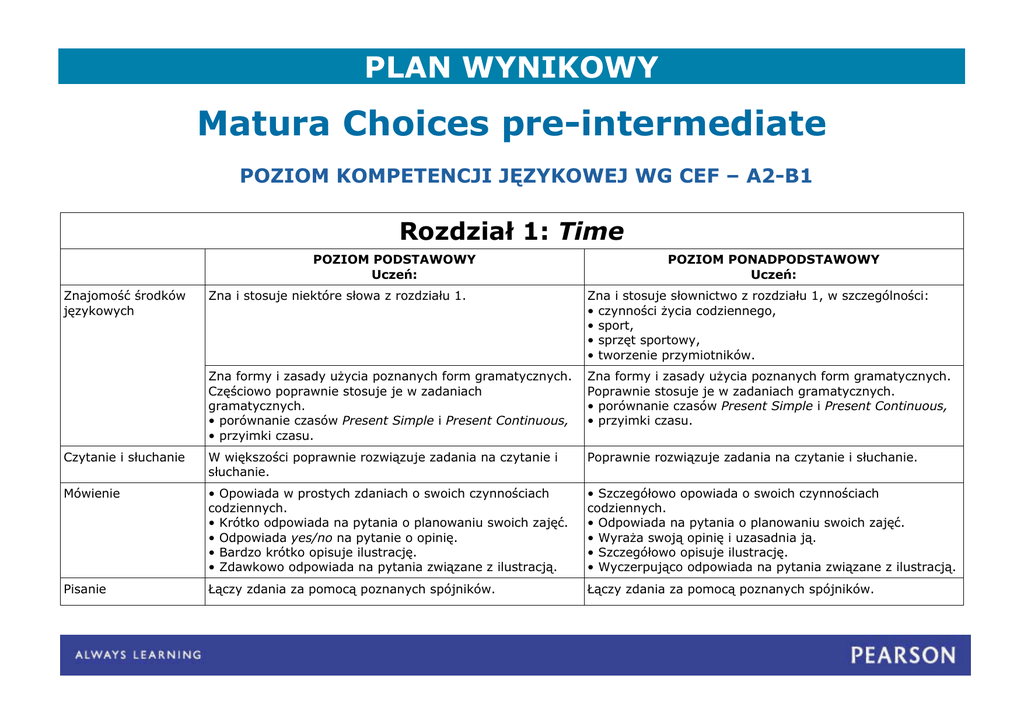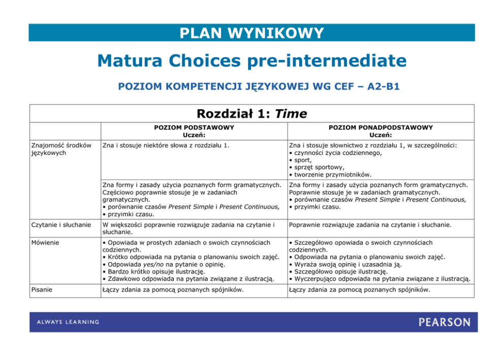 PLAN WYNIKOWY Matura Choices pre-intermediate POZIOM KOMPETENCJI JĘZYKOWEJ WG CEF – A2-B1 Rozdział 1: Time POZIOM PODSTAWOWY Uczeń: Znajomość środków językowych POZIOM PONADPODSTAWOWY Uczeń: Zna i stosuje niektóre słowa z rozdziału 1. Zna i stosuje słownictwo z rozdziału 1, w szczególności: • czynności życia codziennego, • sport, • sprzęt sportowy, • tworzenie przymiotników. Zna formy i zasady użycia poznanych form gramatycznych. Częściowo poprawnie stosuje je w zadaniach gramatycznych. • porównanie czasów Present Simple i Present Continuous, • przyimki czasu. Zna formy i zasady użycia poznanych form gramatycznych. Poprawnie stosuje je w zadaniach gramatycznych. • porównanie czasów Present Simple i Present Continuous, • przyimki czasu. Czytanie i słuchanie W większości poprawnie rozwiązuje zadania na czytanie i słuchanie. Poprawnie rozwiązuje zadania na czytanie i słuchanie. Mówienie • Opowiada w prostych zdaniach o swoich czynnościach codziennych. • Krótko odpowiada na pytania o planowaniu swoich zajęć. • Odpowiada yes/no na pytanie o opinię. • Bardzo krótko opisuje ilustrację. • Zdawkowo odpowiada na pytania związane z ilustracją. • Szczegółowo opowiada o swoich czynnościach codziennych. • Odpowiada na pytania o planowaniu swoich zajęć. • Wyraża swoją opinię i uzasadnia ją. • Szczegółowo opisuje ilustrację. • Wyczerpująco odpowiada na pytania związane z ilustracją. Pisanie Łączy zdania za pomocą poznanych spójników. Łączy zdania za pomocą poznanych spójników. Rozdział 2: Fun POZIOM PODSTAWOWY Uczeń: Znajomość środków językowych POZIOM PONADPODSTAWOWY Uczeń: Zna i stosuje niektóre słowa z rozdziału 2. Zna i stosuje słownictwo z rozdziału 2, w szczególności: • hobby i czynności wykonywane w wolnym czasie, • upodobania, • czasowniki nieregularne, • słownictwo związane z grami komputerowymi, • liczebniki. Zna formy i zasady użycia poznanych form gramatycznych. Częściowo poprawnie stosuje je w zadaniach gramatycznych. • czas Present Perfect, • modulanty poprzedzające przymiotniki i przysłówki, • wyrażenia some, any, no, a lot of, a few, a little. Zna formy i zasady użycia poznanych form gramatycznych. Poprawnie stosuje je w zadaniach gramatycznych. • czas Present Perfect, • modulanty poprzedzające przymiotniki i przysłówki, • wyrażenia some, any, no, a lot of, a few, a little. Czytanie i słuchanie W większości poprawnie rozwiązuje zadania na czytanie i słuchanie. Poprawnie rozwiązuje zadania na czytanie i słuchanie. Mówienie • Krótko opowiada o czynnościach wykonywanych w wolnym czasie. • Wyraża krótką opinię o Charliem Chaplinie. • Wykorzystując podpowiedzi z podręcznika wyraża swoje uczucia i podaje powód. • Zdawkowo odpowiada na pytania o grach komputerowych. • Bardzo krótko opisuje ilustrację. • Zdawkowo odpowiada na pytania związane z ilustracją. • Krótko uzasadnia czy wybrałby się na przyjęcie z zaproszenia. • Szczegółowo opowiada o czynnościach wykonywanych w wolnym czasie. • Wyraża i uzasadnia opinię o Charliem Chaplinie. • Wykorzystując podpowiedzi z podręcznika i własne wyraża swoje uczucia i podaje powód. • Wyczerpująco odpowiada na pytania o grach komputerowych wraz z uzasadnieniem. • Szczegółowo opisuje ilustrację. • Wyczerpująco odpowiada na pytania związane z ilustracją. • Uzasadnia czy wybrałby się na przyjęcie z zaproszenia. Pisanie Krótko pisze dlaczego lubi daną grę. Wzorując się na tekście w podręczniku pisze zaproszenie na szkolną imprezę i konkurs młodych talentów. Szczegółowo pisze uzasadnienie gry, którą lubi. Pisze zaproszenie na szkolną imprezę i konkurs młodych talentów. Rozdział 3: Money POZIOM PODSTAWOWY Uczeń: Znajomość środków językowych POZIOM PONADPODSTAWOWY Uczeń: Zna i stosuje niektóre słowa z rozdziału 3. Zna i stosuje słownictwo z rozdziału 3, w szczególności: • często kupowane rzeczy, • rodzaje sklepów, • słownictwo związane z zakupami, • produkty rynkowe. Zna formy i zasady użycia poznanych form gramatycznych. Częściowo poprawnie stosuje je w zadaniach gramatycznych. • określenia ilości, • czas Present Perfect, • wyrażenia ever, never, already, yet. Zna formy i zasady użycia poznanych form gramatycznych. Poprawnie stosuje je w zadaniach gramatycznych. • określenia ilości, • czas Present Perfect, • wyrażenia ever, never, already, yet. Czytanie i słuchanie W większości poprawnie rozwiązuje zadania na czytanie i słuchanie. Poprawnie rozwiązuje zadania na czytanie i słuchanie. Mówienie • Krótko opowiada o sposobie wydawania pieniędzy. • Szczegółowo opowiada o sposobie wydawania pieniędzy. • Przedstawia rady z podręcznika dotyczące oszczędzania. • Przestawia rady z podręcznika i własne o oszczędzaniu. • Wyraża swoje preferencje dotyczące wizyty w sklepie. • Wyraża i uzasadnia swoje preferencje dotyczące wizyty w • Układa dialog na podstawie podręcznika. sklepie. • Wzorując się na tekstach w podręczniku, odgrywa dialog w •Układa dialog wykorzystując własne pomysły. sklepie. • Samodzielnie odgrywa dialog w sklepie. • Udziela krótkich odpowiedzi o znanych bazarach. • Opisuje znane bazary w Polsce. • Zdawkowo odpowiada na pytania związane z ilustracją. • Wyczerpująco odpowiada na pytania związane z ilustracją. • Prostymi zdaniami prowadzi rozmowę w sklepie • Odgrywa rolę sprzedawcy i klienta prowadząc swobodny odzieżowym. dialog. Pisanie Pisze krótką opinię o jakości reklamowanych towarów. Korzystając z podpowiedzi w podręczniku pisze pytania do quizu. Piszę reklamę towaru na sprzedaż z krótkim opisem. Wzorując się na podręczniku pisze ogłoszenie o chęci sprzedaży przedmiotu. Pisze szczegółową opinię o jakości reklamowanych towarów. Samodzielnie pisze pytania do quizu. 