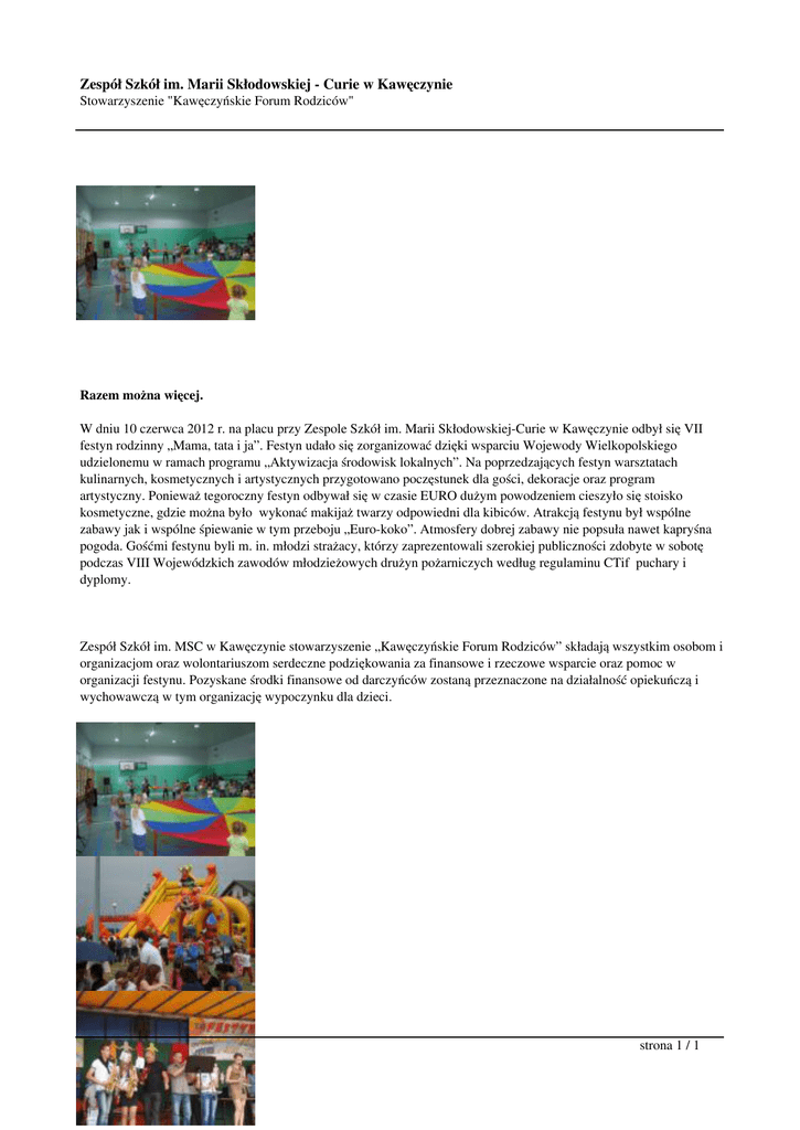Zespół Szkół im. Marii Skłodowskiej - Curie w Kawęczynie Stowarzyszenie "Kawęczyńskie Forum Rodziców" Razem można więcej. W dniu 10 czerwca 2012 r. na placu przy Zespole Szkół im. Marii Skłodowskiej-Curie w Kawęczynie odbył się VII festyn rodzinny „Mama, tata i ja”. Festyn udało się zorganizować dzięki wsparciu Wojewody Wielkopolskiego udzielonemu w ramach programu „Aktywizacja środowisk lokalnych”. Na poprzedzających festyn warsztatach kulinarnych, kosmetycznych i artystycznych przygotowano poczęstunek dla gości, dekoracje oraz program artystyczny. Ponieważ tegoroczny festyn odbywał się w czasie EURO dużym powodzeniem cieszyło się stoisko kosmetyczne, gdzie można było wykonać makijaż twarzy odpowiedni dla kibiców. Atrakcją festynu był wspólne zabawy jak i wspólne śpiewanie w tym przeboju „Euro-koko”. Atmosfery dobrej zabawy nie popsuła nawet kapryśna pogoda. Gośćmi festynu byli m. in. młodzi strażacy, którzy zaprezentowali szerokiej publiczności zdobyte w sobotę podczas VIII Wojewódzkich zawodów młodzieżowych drużyn pożarniczych według regulaminu CTif puchary i dyplomy. Zespół Szkół im. MSC w Kawęczynie stowarzyszenie „Kawęczyńskie Forum Rodziców” składają wszystkim osobom i organizacjom oraz wolontariuszom serdeczne podziękowania za finansowe i rzeczowe wsparcie oraz pomoc w organizacji festynu. Pozyskane środki finansowe od darczyńców zostaną przeznaczone na działalność opiekuńczą i wychowawczą w tym organizację wypoczynku dla dzieci. strona 1 / 1