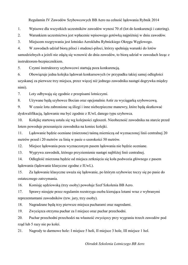 Regulamin IV Zawodów Szybowcowych BB Aero na celność lądowania Rybnik 2014 1. Wpisowe dla wszystkich uczestników zawodów wynosi 70 zł (lot do konkurencji i catering). 2. Warunkiem uczestnictwa jest wpłacenie wpisowego gotówką najpóźniej w dniu zawodów. 3. Miejscem rozgrywania jest lotnisko Aeroklubu Rybnickiego Okręgu Węglowego. 4. W zawodach udział biorą piloci i studenci-piloci, którzy spełniają warunki do lotów samodzielnych a jeżeli nie zdążą się wznowić do dnia zawodów, to biorą udział w zawodach lecąc z instruktorem-bezpiecznikiem. 5. Czynni instruktorzy szybowcowi startują poza konkurencją. 6. Obowiązuje jedna kolejka lądowań konkursowych (w przypadku takiej samej odległości uzyskanej za pierwsze trzy miejsca, przez więcej niż jednego zawodnika nastąpi dogrywka między nimi). 7. Loty odbywają się zgodnie z przepisami lotniczymi. 8. Używane będą szybowce Bocian oraz opcjonalnie Astir za wyciągarką szybowcową. 9. W czasie lotu zabronione są ślizgi i inne niebezpieczne manewry, które będą skutkować dyskwalifikacją, lądowanie ma być zgodnie z IUwL danego typu szybowca. 10. Kolejkę startową ustala się wg kolejności zgłoszeń. Nieobecność zawodnika na starcie przed lotem powoduje przesunięcie zawodnika na koniec kolejki. 11. Lądowanie będzie oceniane (mierzone) taśmą mierniczą od wyznaczonej linii centralnej 20 metrów przed i 20 metrów za linią w pasie o szerokości 50 metrów. 12. Miejsce lądowania poza wyznaczonym pasem lądowania nie będzie oceniane. 13. Wygrywa zawodnik, którego przyziemienie nastąpi najbliżej linii centralnej. 14. Odległość mierzona będzie od miejsca zetknięcia się koła podwozia głównego z pasem lądowania (lądowanie klasyczne zgodne z IUwL). 15. Za lądowanie klasyczne uważa się lądowanie, po którym szybowiec toczy się po pasie do ostatecznego zatrzymania. 16. Komisję sędziowską (trzy osoby) powołuje Szef Szkolenia BB Aero. 17. Sprawy nieujęte przez regulamin rozstrzyga osoba kierująca lotami wraz z wybranymi reprezentantami zawodników (tzw. jury, trzy osoby). 18. Nagradzane będą trzy pierwsze miejsca pucharami oraz nagrodami. 19. Zwycięzca otrzyma puchar za I miejsce oraz puchar przechodni. 20. Puchar przechodni przechodzi na własność zwycięzcy przy wygraniu trzech zawodów pod rząd lub 5 razy nie po kolei. 21. Nagrody to darmowe hole: I miejsce 5 holi, II miejsce 3 hole, III miejsce 1 hol. Ośrodek Szkolenia Lotniczego BB Aero