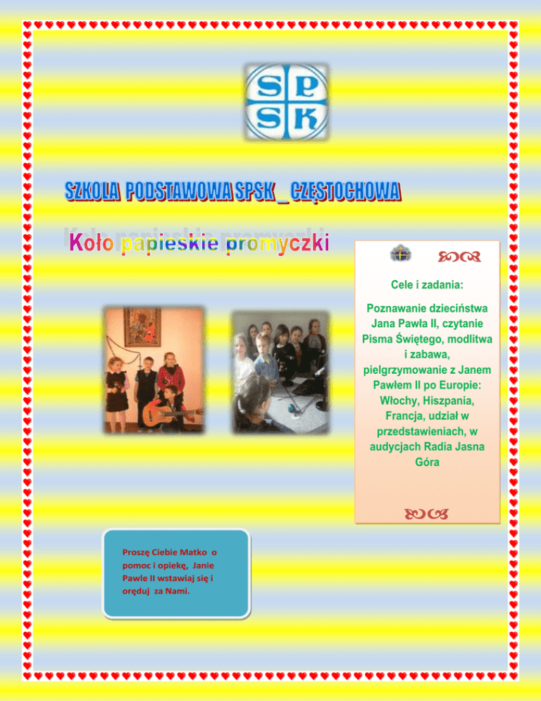 Cele i zadania: Poznawanie dzieciństwa Jana Pawła II, czytanie Pisma Świętego, modlitwa i zabawa, pielgrzymowanie z Janem Pawłem II po Europie: Włochy, Hiszpania, Francja, udział w przedstawieniach, w audycjach Radia Jasna Góra Proszę Ciebie Matko o pomoc i opiekę, Janie Pawle II wstawiaj się i oręduj za Nami. Nasz Papieski Dekalog 1. Jesteśmy uśmiechnięci i zadowoleni. 2. Pomagamy sobie wzajemnie, bo tworzymy wspólnotę. 3. Staramy zachowywać się grzeczne. 4. Jesteśmy posłuszni dla rodziców, nauczycieli, wychowawców. 5. Nie przezywamy się i nie bijemy, lubimy się wzajemnie. 6. Modlimy się codziennie, odmawiamy dziesiątkę różańca. 7. Poznajemy dzieciństwo Jana Pawła II, piszemy listy, rysujemy. 8. Kochamy Kościół i naszą Ojczyznę. 9. Staramy się dobrze uczyć i zachowywać. 10. Pamiętamy, że jesteśmy dziećmi Bożymi. Nasza ulubiona Piosenka Czy wy wiecie, że my mamy Papieża (3 x ) Papieża, w którym mieszka Święty Duch Czy wy wiecie, że On mieszkał w Krakowie (3 x ) Papieża, w którym mieszka Święty Duch Nasz hymn: Janie Pawle II prowadź nas Janie Pawle II wspomóż nas Bo największą wartość W Twoim sercu ma Nasza Polska ojczyzna Twa Czy wy wiecie, że On jeździł na nartach (3x) Papieża, w którym mieszka Święty Duch ,,Byłem góralskim biskupem i góralskim kardynałem, a na koocu zostałem góralskim papieżem", Jan Paweł II, 1984 r. Jan Paweł II mówi do nas o swej rodzinie Urodziłem się 18 maja 1920 r. w Wadowicach, w małym miasteczku położonym u stop Beskidów. Mój dziadek, ze strony ojca, Maciej Wojtyła, pochodził ze wsi Czaniec. Był rolnikiem. Ożenił się z córką piekarza Anną Przeczek. Mój tata urodził się w 1879 r. i pochodził z tej rodziny, był wojskowym. Rodzina mamy pochodziła z okolic Bielska – Białe. Tato mamy, Feliks Kaczorowski był rymarzem- zajmował się robieniem skórzanych siodeł. Babcia Lolka była córką szewca. Mama chodziła do szkoły prowadzonej przez siostry. Zajmowała się domem i wychowywaniem nas, bo miałem jeszcze starszego brata –Mundka i siostrę Olgę, która żyła parę tygodni. 1. Rysunek 2- dzieci z koła papieskiego z klasy 1b Rysunek 1 - Wadowice - widok na góry i halę z owcami 2. Wakacje Jna Pawła II. 3. Miejsce urodzin – Wadowice. 4. Rodzice Lolka. 5. Śpiewamy pieśni, czytamy fragmenty Biblii dla dzieci i modlimy się. 6. Przygotowujemy się do złożenia papieskiej deklaracji wstąpienia do koła. Nasza piosenka - Wadowice T o sa górskie okolice to jest moje miasto Wadowice To sa górskie okolice to jest moje miasto Wadowice Z Pisma Świętego Uśmiechnij się Papieskie wagary Podczas powitania w Monachium Papież spytał licznie obecne dzieci: - "Dano wam dziś wolne w szkole?". - "Tak" - wrzasnęła z radością dzieciarnia. - "To znaczy - skomentował Jan Paweł II - że papież powinien częściej tu przyjeżdżać". Nas i ulubieni świeci – Św. Stanisław Kostka – ,, do wyższych rzeczy zostałem stworzony. W przedstawieniu na zdjęciu 1 została przedstawiona scenka pt. W rodzinnym domu, natomiast na zdjeciu drugim scenka koocowa z piosenką,,Taki duży , taki mały może świetym byd.” - . Zapamiętaj! Jan Paweł II kochał swoich rodziców, nigdy się z tatą i mamą nie kłócił, ale był im zawsze posłuszny i modlił się za nich. Jeżeli będziemy szanowad naszych bliskich, to kiedyś my też będziemy szanowani. PAŹDZIERNIK Rysunek 3 - Lolek ze swoją szkolną klasą Rysunek 4 - Dzieci z koła papieskiego z klasy 2 a i 2b Tajemnice radosne . 1. Zwiastowanie NMP. 2. Nawiedzenie św. Elżbiety. 3. Narodzenie Pana Jezusa. 4.Ofiarowanie Pana Jezusa w Świątyni. 5.Odnalezienie Pana Jezusa w Świątyni. 1. Rysowanie portretów Jana Pawła II, obchodzenie Dnia Papieskiego. 2. Poznawanie różaoca, szczególnie tajemnic radosnych, kolorowanie, 3. Wędrówki śladami Papieża po Polsce - miejsca pielgrzymki zwłaszcza – Wadowice, Kraków, Częstochowa. 4. Nauka podstawowych zwrotów z języka włoskiego, przedstawianie scenek. 5. Nabożeostwo – składanie papieskich deklaracji. Jan Paweł II mówi do nas o swej nauce szkolnej Zawsze lubiłem szkołę i lubiłem też uczyd się. Gdy miałem 6 lat poszedłem do szkoły powszechnej, czyli podstawowej. Ale moja szkoła nie wyglądała tak jak dziś. Nie było komputerów, chodziło się w mundurkach, nie było kolorowych piórników, kolorowych pisaków, długopisów ani piór na naboje. Pisało się stalówką, którą moczyło się w kałamarzu z atramentem. Siedziało się w drewnianych ławkach. W mojej klasie nie było dziewczynek, bo wtedy chłopcy i dziewczynki uczyły się oddzielnie. Klasa była bardzo liczna, na liście uczniów w klasie pierwszej była aż 60 nazwiska. Wyobrażacie to sobie? Jednak uczyłem się zawsze dobrze i dwiczyłem kaligrafię. Zapamiętaj! Jan Paweł II lubił chodzid do szkoly i uczyd się.Nikt go do nauki nie przymuszał. Sam rozumiał, że im człowiek więcej wie, tym łatwiej mu będzie w życiu. Kochał mowę ojczystą, literatutę, a jego ulubionym zajęciem było czytanie ksiazek, a później przedstawienia teatralne. Gdy byłeś Karolkiem do szkoły chodziłeś I tak jak my dzisiaj też radosny byłeś. Uczyłeś się pilnie, liczyłeś, czytałeś, I tak jak my chłopcy, chętnie w piłkę grałeś. Rysunek 5 Rysunek Jana Pawła II - dziecka Uśmiechnij się! Gdy Lolek miał 7 lat, a było to w 1927 r., Amerykanin Charles Lindbergh przeleciał samolotem nad ogromnym Oceanem Atlantyckim. Cały świat mówił o słynnym lotniku.Gdy Lola zapytano wówczas: - Kim chciałbyś zostad? - Będę lotnikiem! – odpowiedział. - A dlaczego nie księdzem? - Bo Polak może byd drugim Lindberghiem, ale nie może zostad papieżem – wyjaśnił Lolek. (Mama Karola przeczuwała jednak, że lotnikiem Lolek nie zostanie wielkim człowiekiem.) On potrafił przemówid do serca każdego, Kochał ludzi, zwierzęta i może dlatego, Kazao jego słuchały naw