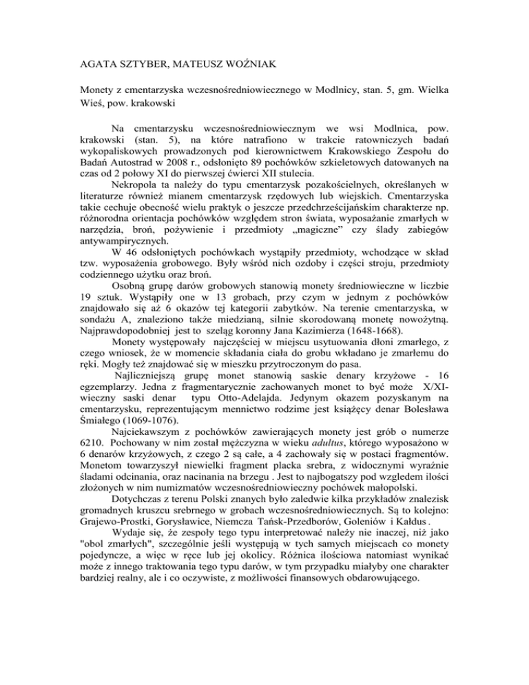 AGATA SZTYBER, MATEUSZ WOŹNIAK Monety z cmentarzyska wczesnośredniowiecznego w Modlnicy, stan. 5, gm. Wielka Wieś, pow. krakowski Na cmentarzysku wczesnośredniowiecznym we wsi Modlnica, pow. krakowski (stan. 5), na które natrafiono w trakcie ratowniczych badań wykopaliskowych prowadzonych pod kierownictwem Krakowskiego Zespołu do Badań Autostrad w 2008 r., odsłonięto 89 pochówków szkieletowych datowanych na czas od 2 połowy XI do pierwszej ćwierci XII stulecia. Nekropola ta należy do typu cmentarzysk pozakościelnych, określanych w literaturze również mianem cmentarzysk rzędowych lub wiejskich. Cmentarzyska takie cechuje obecność wielu praktyk o jeszcze przedchrześcijańskim charakterze np. różnorodna orientacja pochówków względem stron świata, wyposażanie zmarłych w narzędzia, broń, pożywienie i przedmioty „magiczne” czy ślady zabiegów antywampirycznych. W 46 odsłoniętych pochówkach wystąpiły przedmioty, wchodzące w skład tzw. wyposażenia grobowego. Były wśród nich ozdoby i części stroju, przedmioty codziennego użytku oraz broń. Osobną grupę darów grobowych stanowią monety średniowieczne w liczbie 19 sztuk. Wystąpiły one w 13 grobach, przy czym w jednym z pochówków znajdowało się aż 6 okazów tej kategorii zabytków. Na terenie cmentarzyska, w sondażu A, znaleziono także miedzianą, silnie skorodowaną monetę nowożytną. Najprawdopodobniej jest to szeląg koronny Jana Kazimierza (1648-1668). Monety występowały najczęściej w miejscu usytuowania dłoni zmarłego, z czego wniosek, że w momencie składania ciała do grobu wkładano je zmarłemu do ręki. Mogły też znajdować się w mieszku przytroczonym do pasa. Najliczniejszą grupę monet stanowią saskie denary krzyżowe - 16 egzemplarzy. Jedna z fragmentarycznie zachowanych monet to być może X/XIwieczny saski denar typu Otto-Adelajda. Jedynym okazem pozyskanym na cmentarzysku, reprezentującym mennictwo rodzime jest książęcy denar Bolesława Śmiałego (1069-1076). Najciekawszym z pochówków zawierających monety jest grób o numerze 6210. Pochowany w nim został mężczyzna w wieku adultus, którego wyposażono w 6 denarów krzyżowych, z czego 2 są całe, a 4 zachowały się w postaci fragmentów. Monetom towarzyszył niewielki fragment placka srebra, z widocznymi wyraźnie śladami odcinania, oraz nacinania na brzegu . Jest to najbogatszy pod wzgledem ilości złożonych w nim numizmatów wczesnośredniowieczny pochówek małopolski. Dotychczas z terenu Polski znanych było zaledwie kilka przykładów znalezisk gromadnych kruszcu srebrnego w grobach wczesnośredniowiecznych. Są to kolejno: Grajewo-Prostki, Gorysławice, Niemcza Tańsk-Przedborów, Goleniów i Kałdus . Wydaje się, że zespoły tego typu interpretować należy nie inaczej, niż jako "obol zmarłych", szczególnie jeśli występują w tych samych miejscach co monety pojedyncze, a więc w ręce lub jej okolicy. Różnica ilościowa natomiast wynikać może z innego traktowania tego typu darów, w tym przypadku miałyby one charakter bardziej realny, ale i co oczywiste, z możliwości finansowych obdarowującego.