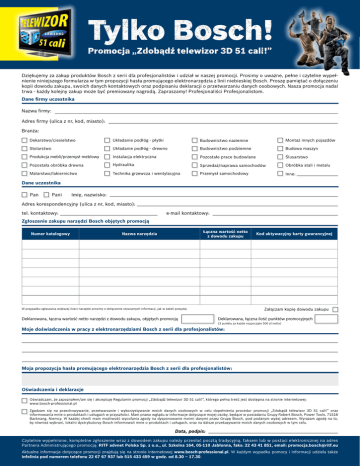 Dziękujemy za zakup produktów Bosch z serii dla profesjonalistów i udział w naszej promocji. Prosimy o uważne, pełne i czytelne wypełnienie niniejszego formularza w tym propozycji hasła promującego elektronarzędzia z linii niebieskiej Bosch. Proszę pamiętać o dołączeniu kopii dowodu zakupu, swoich danych kontaktowych oraz podpisaniu deklaracji o przetwarzaniu danych osobowych. Nasza promocja nadal trwa - każdy kolejny zakup może być premiowany nagrodą. Zapraszamy! Profesjonaliści Profesjonalistom. Dane firmy uczestnika Nazwa firmy: Adres firmy (ulica z nr, kod, miasto): Branża: Dekarstwo/ciesielstwo Układanie podłóg - płytki Budownictwo naziemne Montaż innych pojazdów Stolarstwo Układanie podłóg - drewno Budownictwo podziemne Budowa maszyn Produkcja mebli/przemysł meblowy Instalacja elektryczna Pozostałe prace budowlane Ślusarstwo Pozostała obróbka drewna Hydraulika Sprzedaż/naprawa samochodów Obróbka stali i metalu Technika grzewcza i wentylacyjna Przemysł samochodowy Inne: Malarstwo/lakiernictwo Dane uczestnika Pan Pani Imię, nazwisko: Adres korespondencyjny (ulica z nr, kod, miasto): tel. kontaktowy: e-mail kontaktowy: Zgłoszenie zakupu narzędzi Bosch objętych promocją Numer katalogowy Łączna wartość netto z dowodu zakupu Nazwa narzędzia Załączam kopię dowodu zakupu W przypadku zgłaszania większej ilości narzędzi prosimy o dołączenie stosownych informacji, jak w tabeli powyżej. Deklarowana, łączna wartość netto narzędzi z dowodu zakupu, objętych promocją Kod aktywacyjny karty gwarancyjnej Deklarowana, łączna ilość punktów promocyjnych (3 punkty za każde rozpoczęte 500 zł netto) Moje doświadczenia w pracy z elektronarzędziami Bosch z serii dla profesjonalistów: Moja propozycja hasła promującego elektronarzędzia Bosch z serii dla profesjonalistów: Oświadczenia i deklaracje Oświadczam, że zapoznałem/am się i akceptuję Regulamin promocji „Zdobądź telewizor 3D 51 cali!”, którego pełna treść jest dostępna na stronie internetowej: www.bosch-professional.pl Zgadzam się na przechowywanie, przetwarzanie i wykorzystywanie moich danych osobowych w celu dopełnienia procedur promocji „Zdobądź telewizor 3D 51 cali!” oraz informowania mnie o produktach i usługach w przyszłości. Mam prawo wglądu w informacje dotyczące mojej osoby, będące w posiadaniu Grupy Robert Bosch, Power Tools, 71518 Backnang, Niemcy. W każdej chwili mam możliwość wycofania zgody na dysponowanie moimi danymi przez Grupę Bosch, pod podanym wyżej adresem. Wyrażam zgodę na to, by również wybrani, lokalni dystrybutorzy Bosch informowali mnie o produktach i usługach, oraz na dalsze przekazywanie moich danych osobowych w tym celu. Data, podpis: Czytelnie wypełnione, kompletne zgłoszenie wraz z dowodem zakupu należy przesłać pocztą tradycyjną, faksem lub w postaci elektronicznej na adres Partnera Administrującego promocją: RITF advnet Polska Sp. z o.o., ul. Szkolna 164, 05-110 Jabłonna, faks: 22 43 41 851, email: [email protected] Aktualne informacje dotyczące promocji znajdują się na stronie internetowej www.bosch-professional.pl. W każdym wypadku pomocy i informacji udziela także infolinia pod numerem telefonu 22 67 67 937 lub 515 433 459 w godz. od 8.30 – 17.30.