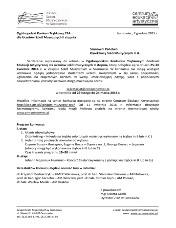 Sosnowiec, 7 grudnia 2015 r. Ogólnopolski Konkurs Trąbkowy CEA dla Uczniów Szkół Muzycznych II stopnia Szanowni Państwo Dyrektorzy Szkół Muzycznych II st. Serdecznie zapraszamy do udziału w Ogólnopolskim Konkursie Trąbkowym Centrum Edukacji Artystycznej dla uczniów szkół muzycznych II stopnia, który odbędzie się w dniach 25–26 kwietnia 2016 r. w Zespole Szkół Muzycznych w Sosnowcu. W konkursie nie mogą wystąpić uczniowie będący jednocześnie studentami uczelni muzycznych w tej samej specjalności. Zgłoszenia na załączonych kartach, w wersji umożliwiającej edycję, wraz z podpisanymi oświadczeniami, prosimy kierować drogą mailową na adres: [email protected] w terminie od 29 lutego do 24 marca 2016 r. Wszelkie informacje na temat konkursu dostępne są na stronie Centrum Edukacji Artystycznej: http://cea.art.pl/konkurs-muzyczny-cea/ Od 11 kwietnia 2016 r. informacje dotyczące harmonogramu konkursu będą mogli Państwo znaleźć na stronie internetowej szkoły: www.zsmsosnowiec.pl Program konkursu: I. etap: 1. Utwór obowiązkowy: Otto Ketting – Intrada na trąbkę solo (utwór może być wykonany na trąbce in B lub in C ) 2. Jeden z niżej podanych utworów do wyboru: Eugene Bozza – Rustiques, Eugene Bozza – Caprice no. 2, George Enescu – Legenda (utwory mogą być wykonane na trąbce in B lub in C) Czas trwania programu 15–20 minut II. etap: Johann Nepomuk Hummel – Koncert Es-dur (wykonany z pamięci na trąbce in B lub in Es) Uczestników konkursu będzie oceniać Jury w składzie: dr Krzysztof Bednarczyk – UMFC Warszawa, prof. dr hab. Stanisław Dziewior – AM Katowice, prof. dr hab. Igor Cecocho – AM Wrocław, prof. dr hab. Roman Gryń – AM Poznań, dr hab. Wacław Mulak – AM Kraków Z poważaniem mgr Dorota Grolik Dyrektor ZSM w Sosnowcu Zespół Szkół Muzycznych w Sosnowcu ul. Wawel 2 41-200 Sosnowiec tel.: (32) 266 37 93, (32) 266 37 95 e-mail: [email protected] www: www.zsmsosnowiec.pl