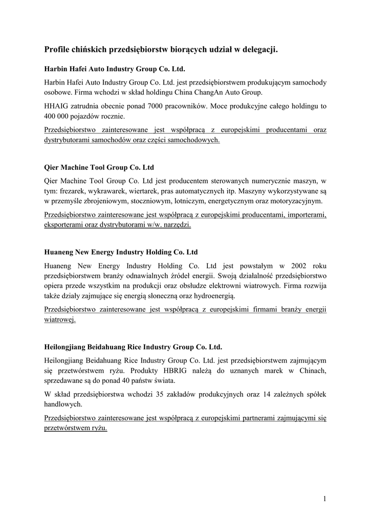 Profile chińskich przedsiębiorstw biorących udział w delegacji. Harbin Hafei Auto Industry Group Co. Ltd. Harbin Hafei Auto Industry Group Co. Ltd. jest przedsiębiorstwem produkującym samochody osobowe. Firma wchodzi w skład holdingu China ChangAn Auto Group. HHAIG zatrudnia obecnie ponad 7000 pracowników. Moce produkcyjne całego holdingu to 400 000 pojazdów rocznie. Przedsiębiorstwo zainteresowane jest współpracą z europejskimi producentami oraz dystrybutorami samochodów oraz części samochodowych. Qier Machine Tool Group Co. Ltd Qier Machine Tool Group Co. Ltd jest producentem sterowanych numerycznie maszyn, w tym: frezarek, wykrawarek, wiertarek, pras automatycznych itp. Maszyny wykorzystywane są w przemyśle zbrojeniowym, stoczniowym, lotniczym, energetycznym oraz motoryzacyjnym. Przedsiębiorstwo zainteresowane jest współpracą z europejskimi producentami, importerami, eksporterami oraz dystrybutorami w/w. narzędzi. Huaneng New Energy Industry Holding Co. Ltd Huaneng New Energy Industry Holding Co. Ltd jest powstałym w 2002 roku przedsiębiorstwem branży odnawialnych źródeł energii. Swoją działalność przedsiębiorstwo opiera przede wszystkim na produkcji oraz obsłudze elektrowni wiatrowych. Firma rozwija także działy zajmujące się energią słoneczną oraz hydroenergią. Przedsiębiorstwo zainteresowane jest współpracą z europejskimi firmami branży energii wiatrowej. Heilongjiang Beidahuang Rice Industry Group Co. Ltd. Heilongjiang Beidahuang Rice Industry Group Co. Ltd. jest przedsiębiorstwem zajmującym się przetwórstwem ryżu. Produkty HBRIG należą do uznanych marek w Chinach, sprzedawane są do ponad 40 państw świata. W skład przedsiębiorstwa wchodzi 35 zakładów produkcyjnych oraz 14 zależnych spółek handlowych. Przedsiębiorstwo zainteresowane jest współpracą z europejskimi partnerami zajmującymi się przetwórstwem ryżu. 1 Jiusan Oil & Fat Co. Ltd Jiusan Oil & Fat Co. Ltd jest przedsiębiorstwem zajmującym się przetwórstwem soi. Wśród produktów JO&F znaleźć można płatki sojowe, zarodki sojowe, olej sojowy, produkowana jest również naturalna witamina E. JO&F wykorzystuje w procesie technologicznym niemodyfikowaną genetycznie soję. Przedsiębiorstwo zainteresowane jest współpracą z europejskimi partnerami zajmującymi się produkcją, importem/eksportem oraz dystrybucją olejów roślinnych oraz produktów zbożowych. Heilongjiang Beidahuang Agriculture Holding Co. Ltd Heilongjiang Beidahuang Agriculture Holding Co. Ltd, jest powstałym w 1947 roku przedsiębiorstwem, zajmującym się przetwórstwem takich zbóż jak ryż, soja, kukurydza czy pszenica. HBAH zajmuje się również importem nasion, produkcją oraz sprzedażą papieru, środków lecznicych itp. Przedsiębiorstwo zainteresowane jest współpracą z europejskimi partnerami należącymi do branży rolno-spożywczej. Heilongjiang Yanglin Grease Group Heilongjiang Yanglin Grease Group jest przedsiębiorstwem zajmującym się przetwórstwem niemodyfikowanej genetycznie soi. Obecnie firma posiada 10 oddziałów i zatrudnia ponad 1 100 pracowników. Przedsiębiorstwo posiada 5 zakładów przetwórstwa soi o łącznej mocy produkcyjnej 1.8 ton rocznie oraz jeden zakład przetwórstwa ryżu o łącznej mocy produkcyjnej 40 000 ton rocznie. Wśród produktów HYGG znaleźć można soję rafinowaną, rafinowany ryż, olej sojowy, miazgę sojową itp. Produkty eksportowane są do Japonii, Korei oraz Rosji. Przedsiębiorstwo zainteresowane jest współpracą z europejskimi partnerami należącymi do branży rolno-spożywczej. 2