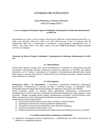 UCHWAŁA NR IV/025/2015 Rady Miejskiej w Nowym Warpnie z dnia 25 lutego 2015 r. w sprawie przyjęcia Gminnego Programu Profilaktyki i Rozwiązywania Problemów Alkoholowych na 2015 rok Na podstawie art. 18 ust. 2 pkt 15 ustawy z dnia 8 marca 1990 roku o samorządzie gminnym (Dz. U. z 2013 r. poz. 594, 645 i 1318 oraz z 2014 r. poz. 379 i 1072) oraz art. 41 ust. 2 i 5 ustawy z dnia 26 października 1982 roku o wychowaniu w trzeźwości i przeciwdziałaniu alkoholizmowi (Dz. U. z 2012 r., poz. 1356, z 2013 r. poz. 1563, z 2014 r. poz. 822 i 1188) Rada Miejska w Nowym Warpnie uchwala, co następuje: Przyjmuje się Gminny Program Profilaktyki i Rozwiązywania Problemów Alkoholowych na 2015 rok. § 1. Wprowadzenie Gmina Nowe Warpno uznając życie swoich mieszkańców w trzeźwości za podstawowy warunek moralnego i materialnego rozwoju, postanawia w gminnym programie na rok 2015, ująć zadania określone w art. 41 ustawy o wychowaniu w trzeźwości i przeciwdziałaniu alkoholizmowi, zwanej dalej ustawą, w zakresie wyznaczonym z jednej strony przez istniejące potrzeby, z drugiej natomiast przez możliwości ich realizacji. § 2. Cele programu. Kontynuacja celów z lat poprzednich, a mianowicie: prowadzenie działalności edukacyjnej, prewencyjnej i profilaktycznej w stosunku do dzieci i młodzieży uznając, że nadrzędnym celem niniejszego programu będzie ograniczenie dostępu do nabywania i picia przez nich alkoholu. Gmina przyjmuje zasadę, że wszelkie skutki oddziaływań edukacyjnych, prewencyjnych, profilaktycznych i innych w zakresie rozwiązywania problemów alkoholowych mogą nastąpić w czasie przyszłym i dlatego wymagają bardzo dużego zaangażowania wszystkich zainteresowanych służb. Efekty realizowanych zadań mogą pojawić się dopiero na przestrzeni następnych lat. Podstawowymi celami programu jest: 1) zmniejszenie spożycia alkoholu przez dzieci i młodzież, a także dorosłych, 2) zapobieganie powstawaniu nowych problemów alkoholowych, 3) zmniejszenie rozmiarów tych problemów, które aktualnie występują, 4) ulepszanie sposobów radzenia sobie z nimi, 5) podejmowanie skutecznych działań zmierzających do przeciwdziałania przemocy w rodzinie. § 3. Zadania własne Gminy obejmują w szczególności: 1) zwiększenie dostępności pomocy terapeutycznej i rehabilitacyjnej dla osób uzależnionych od alkoholu, w szczególności poprzez: 2) 3) 4) 5) a) podjęcie działań w zakresie współpracy z instytucjami, profesjonalnymi placówkami terapii uzależnień alkoholowych, w celu objęcia nowoczesnymi oddziaływaniami terapeutycznymi osób uzależnionych od alkoholu, udzielanie rodzinom, w których występują problemy alkoholowe, pomocy psychospołecznej i prawnej, a zwłaszcza ochrony przed przemocą w rodzinie, w szczególności poprzez: a) wdrażanie nowoczesnych oddziaływań w zakresie przeciwdziałania przemocy, b) wspieranie finansowe w prowadzeniu świetlicy środowiskowej , c) współpracę z instytucjami zajmującymi się dziećmi i młodzieżą w zakresie pomocy, w celu uchronienia dzieci i młodzieży przed popadnięciem w uzależnienia oraz ochrona ich przed przemocą domową i rówieśniczą, prowadzenie profilaktycznej działalności informacyjnej i edukacyjnej w zakresie rozwiązywania problemów alkoholowych i przeciwdziałania narkomanii, w szczególności dla dzieci i młodzieży, w tym prowadzenie pozalekcyjnych zajęć sportowych, a także działań na rzecz dożywania dzieci uczestniczących w pozalekcyjnych programach opiekuńczo-wychowawczych i socjoterapeutycznych, w szczególności poprzez: a) finansowanie dla dzieci szkolnych programu profilaktycznego: ”Zachowaj Trzeźwy Umysł” oraz merytoryczna pomoc i wspieranie finansowe szkolnych programów profilaktycznych i sztuk teatralnych poświęconych problematyce uzależnień, b) szkolenie i kształcenie osób tzw. pierwszego kontaktu środowiskowego w dziedzinie profilaktyki i rozwiązywania problemów alkoholowych, c) merytoryczna pomoc i wsparcie finansowe i terapeutyczne dla dzieci i młodzieży pochodzącej z rodzin, w których występuje problem alkoholowy, d) merytoryczna pomoc i wsparcie finansowe sposobu wykorzystania czasu wolnego dzieci i młodzieży, e) prowadzenie kampanii edukacyjnych dla społeczności Gminy Nowe Warpno poprzez m.in. stronę internetową Gminy Nowe Warpno, ulotki, informatory, zakup literatury, wspomaganie działalności instytucji, stowarzyszeń i osób fizycznych, służącej rozwiązywaniu problemów alkoholowych, w szczególności poprzez: a) wspieranie materialne, organizacyjne i edukacyjne dla organizacji pozarządowych, stowarzyszeń i fundacji zajmujących się statutowo problematyką alkoholową, wspieranie instytucji kościelnych, b) merytoryczna pomoc i wsparcie finansowe m.in. dla Zespołu Szkół i Przedszkola ”Złota Rybka „w Nowym Warpnie w zakresie tworzenia i prowadzenia zajęć pozalekcyjnych dla dzieci i młodzieży, c) współdziałanie z osobami, które profesjonalnie zajmują się pomaganiem osobom mającym problemy alkoholowe. podejmowanie interwencji w związku z naruszaniem przepisów określonych w art. 13 1 i 15 ustawy o wychowaniu w trzeźwości i przeciwdziałaniu alkoholizmowi oraz występowanie przed sądem w charakterze oskarżyciela publicznego, w szczególności poprzez: a) kontrolę miejsc, w których prowadzi się sprzedaż napojów alkoholowych w zakresie przestrzegania uchwał Rady Miejskiej w Nowym Warpnie i przepisów ustawy o wychowaniu w trzeźwości i przeciwdziałaniu alkoholizmowi, b) podejmowanie interwencji w celu ograniczania sprzedaży napojów alkoholowych dzieciom i młodzieży oraz sprzedawania alkoholu osobom nietrzeźwym w oparciu o procedury uzgodnione z Komendą Powiatową Policji w Policach. § 4. Oczekiwane korzyści z uchwalenia i realizacji Programu: 1. 2. 3. Zmniejszenie nowych przypadków uzależnienia od alkoholu. Zmniejszanie wypijanego alkoholu przez dzieci i młodzież. Zmniejszenie 