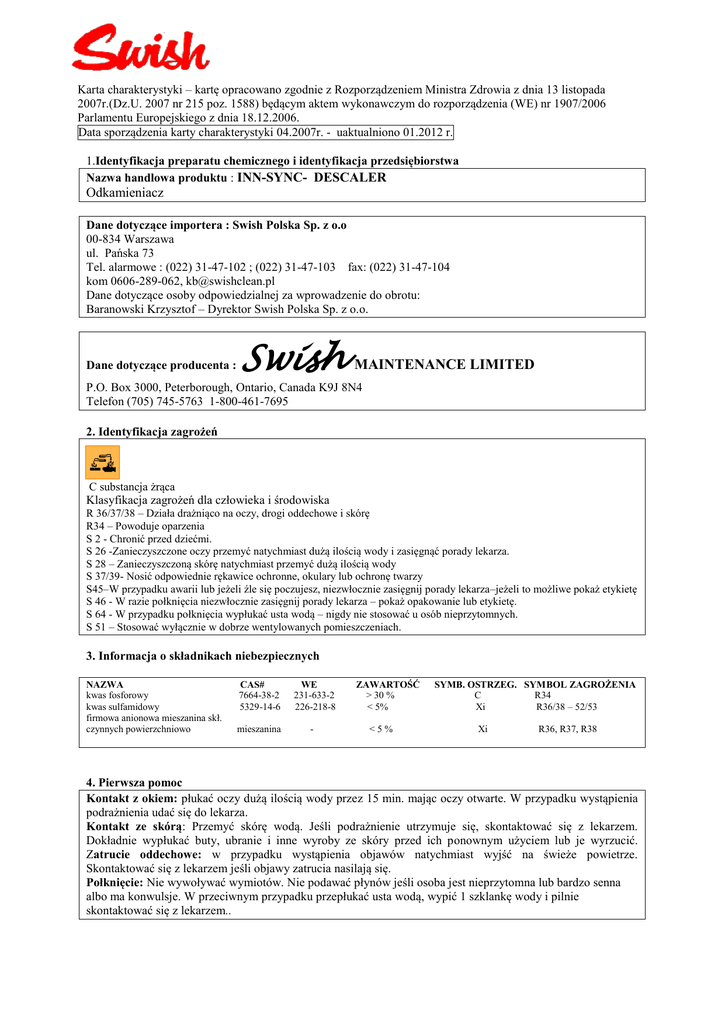 Karta charakterystyki – kartę opracowano zgodnie z Rozporządzeniem Ministra Zdrowia z dnia 13 listopada 2007r.(Dz.U. 2007 nr 215 poz. 1588) będącym aktem wykonawczym do rozporządzenia (WE) nr 1907/2006 Parlamentu Europejskiego z dnia 18.12.2006. Data sporządzenia karty charakterystyki 04.2007r. - uaktualniono 01.2012 r. 1.Identyfikacja preparatu chemicznego i identyfikacja przedsiębiorstwa Nazwa handlowa produktu : INN-SYNC- DESCALER Odkamieniacz Dane dotyczące importera : Swish Polska Sp. z o.o 00-834 Warszawa ul. Pańska 73 Tel. alarmowe : (022) 31-47-102 ; (022) 31-47-103 fax: (022) 31-47-104 kom 0606-289-062, [email protected] Dane dotyczące osoby odpowiedzialnej za wprowadzenie do obrotu: Baranowski Krzysztof – Dyrektor Swish Polska Sp. z o.o. Dane dotyczące producenta : Swish MAINTENANCE LIMITED P.O. Box 3000, Peterborough, Ontario, Canada K9J 8N4 Telefon (705) 745-5763 1-800-461-7695 2. Identyfikacja zagrożeń C substancja żrąca Klasyfikacja zagrożeń dla człowieka i środowiska R 36/37/38 – Działa drażniąco na oczy, drogi oddechowe i skórę R34 – Powoduje oparzenia S 2 - Chronić przed dziećmi. S 26 -Zanieczyszczone oczy przemyć natychmiast dużą ilością wody i zasięgnąć porady lekarza. S 28 – Zanieczyszczoną skórę natychmiast przemyć dużą ilością wody S 37/39- Nosić odpowiednie rękawice ochronne, okulary lub ochronę twarzy S45–W przypadku awarii lub jeżeli źle się poczujesz, niezwłocznie zasięgnij porady lekarza–jeżeli to możliwe pokaż etykietę S 46 - W razie połknięcia niezwłocznie zasięgnij porady lekarza – pokaż opakowanie lub etykietę. S 64 - W przypadku połknięcia wypłukać usta wodą – nigdy nie stosować u osób nieprzytomnych. S 51 – Stosować wyłącznie w dobrze wentylowanych pomieszczeniach. 3. Informacja o składnikach niebezpiecznych NAZWA kwas fosforowy kwas sulfamidowy firmowa anionowa mieszanina skł. czynnych powierzchniowo CAS# 7664-38-2 5329-14-6 WE 231-633-2 226-218-8 mieszanina - ZAWARTOŚĆ > 30 % < 5% <5% SYMB. OSTRZEG. SYMBOL ZAGROŻENIA C R34 Xi R36/38 – 52/53 Xi R36, R37, R38 4. Pierwsza pomoc Kontakt z okiem: płukać oczy dużą ilością wody przez 15 min. mając oczy otwarte. W przypadku wystąpienia podrażnienia udać się do lekarza. Kontakt ze skórą: Przemyć skórę wodą. Jeśli podrażnienie utrzymuje się, skontaktować się z lekarzem. Dokładnie wypłukać buty, ubranie i inne wyroby ze skóry przed ich ponownym użyciem lub je wyrzucić. Zatrucie oddechowe: w przypadku wystąpienia objawów natychmiast wyjść na świeże powietrze. Skontaktować się z lekarzem jeśli objawy zatrucia nasilają się. Połknięcie: Nie wywoływać wymiotów. Nie podawać płynów jeśli osoba jest nieprzytomna lub bardzo senna albo ma konwulsje. W przeciwnym przypadku przepłukać usta wodą, wypić 1 szklankę wody i pilnie skontaktować się z lekarzem.. 5. Postępowanie w przypadku pożaru Używać odpowiednich środków gaśniczych : dwutlenek węgla proszek piana alkoholowa Szczególne zagrożenie związane z narażeniem wynikającym z właściwości samej substancji: Strażacy winni posiadać aparaty tlenowe. Odnośnie produktów rozkładu- patrz pkt.10 6. Postępowanie w przypadku niezamierzonego uwolnienia do środowiska. Środki ochrony osobistej: rękawice ochronne, okulary ochronne. Zablokować i zamknąć dostęp do obszaru zagrożonego. Zapobiec przenikaniu do wód powierzchniowych. Zebrać za pomocą materiału sorpcyjnego. 7. Obchodzenie się z substancją i magazynowanie Przechowywać w oznaczonych plastikowych pojemnikach. Magazynowanie: Magazynować tylko w oryginalnych oznaczonych opakowaniach. Warunki magazynowania: chronić przed dostępem dzieci, nie magazynować razem ze środkami łatwo wchodzącymi w reakcje chemiczne (silnymi utleniaczami i silne kwasy).Chronić przed zamarzaniem. 8. Kontrola narażenia / środki ochrony indywidualnej Parametry kontroli narażenia w miejscu pracy: brak. Srodki ochrony indywidualnej: Rękawiczki: Używać rękawic gumowych. Ochrona oczu: Używać okularów ochronnych. Wdychanie : nie wymagana jest specjalna ochrona. 9. Właściwości fizyczne i chemiczne Wygląd : płyn Kolor : bezbarwny Zapach : charakterystyczny Rozpuszczalność w wodzie : całkowita Temp. krzepnięcia: 0C Temp. wrzenia : brak Punkt zapłonu : brak Ilość substancji lotnych: 61% Ciężar właściwy (woda=1,0) : 1.057 G/cm3 Wartość pH = 1,9 10. Stabilność i reaktywność Stabilny Reaktywność : reaguje z silnymi utleniaczami. Warunki reakcyjności – nie znane 11. Informacje toksykologiczne Drogi przenikania: oczy, kontakt ze skórą, połknięcie, wdychanie. Skutki ostrych zatruć: Skóra : może powodować silne podrażnienia i opażenia chemiczne. Niebezpieczne podrażnienia skóry mogą być początkowo bezbolesne. Oczy: może powodować silne podrażnienia Absorpcja: nie znane Wdychanie: Może powodować podrażnienie dróg oddechowych kaszel lub ból głowy. Połknięcie: możliwe opażenia chemiczne jamy ustnej, przełyku i żołądka, zaburzenie trawienia i wymioty Efekty długotrwałego kontaktu: Skóra: stany zapalne i wysychanie naskórka. Działanie rakotwórcze, teratogenne, mutagenne: dotychczas nie stwierdzono. 12. Informacje ekologiczne Łatwa biodegradacja- produkt z uwagi na kryteria OECD ulega łatwej biodegradacji Zawarte w preparacie związki powierzchniowo-czynne są biodegradowalne i zgodne z Rozporządzeniem (WE) nr 648/2004 Parlamentu Europejskiego i Rady z dnia 31marca 2004r. w sprawie detergentów(Dz.Urz.UE L 104 z dnia 8 kwietnia 2004r.) Ekotoksyczność/wskazówki ogólne Zapobiegać przenikaniu skoncentrowanego produktu do wód powierzchniowych i wód gruntowych. 13. Postępowanie. z odpadami Najlepszym sposobem postępowania z odpadami jest wysłanie do uprawnionego zakładu odzysku lub spalania. Wszelkie praktyki dotyczące usuwania muszą być w zgodności ze wszystkimi lokalnymi prawami i rozporządzeniami. Nie