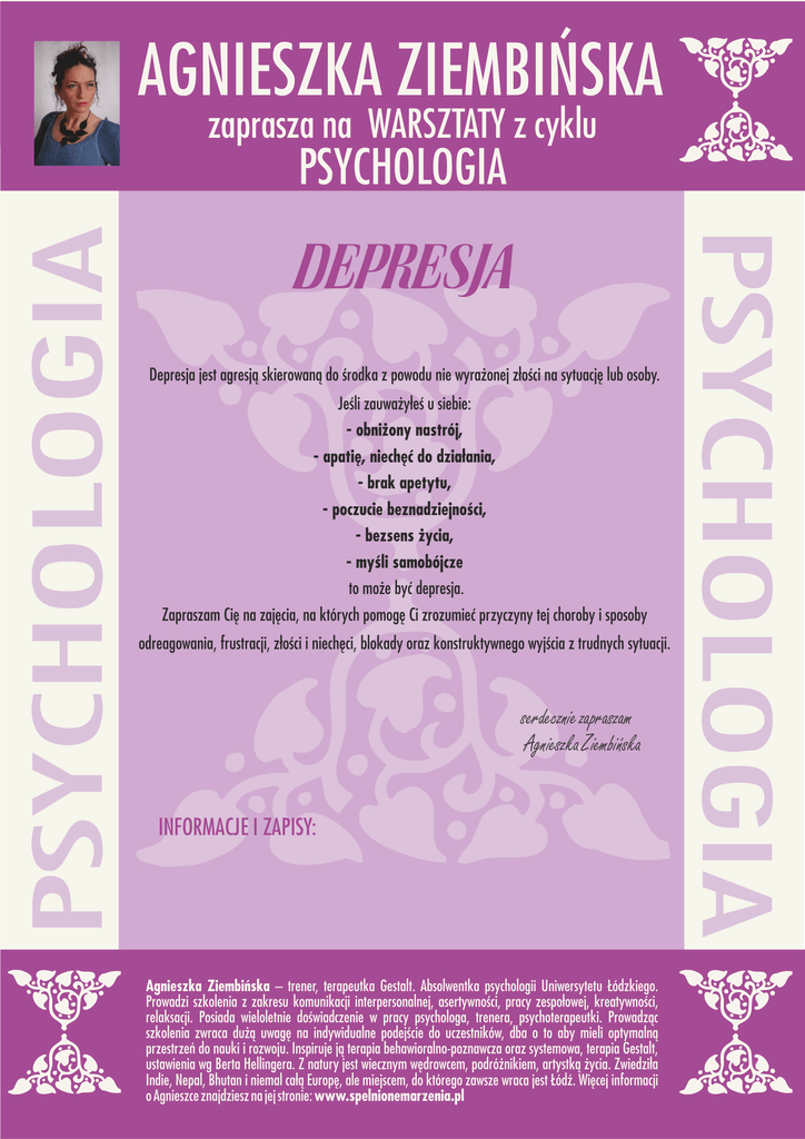 AGNIESZKA ZIEMBIŃSKA K PSYCHOLOGIA Depresja jest agresją skierowaną do środka z powodu nie wyrażonej złości na sytuację lub osoby. Jeśli zauważyłeś u siebie: - obniżony nastrój, - apatię, niechęć do działania, - brak apetytu, - poczucie beznadziejności, - bezsens życia, - myśli samobójcze to może być depresja. Zapraszam Cię na zajęcia, na których pomogę Ci zrozumieć przyczyny tej choroby i sposoby odreagowania, frustracji, złości i niechęci, blokady oraz konstruktywnego wyjścia z trudnych sytuacji. serdecznie zapraszam Agnieszka Ziembińska INFORMACJE I ZAPISY: Agnieszka Ziembińska – trener, terapeutka Gestalt. Absolwentka psychologii Uniwersytetu Łódzkiego. Prowadzi szkolenia z zakresu komunikacji interpersonalnej, asertywności, pracy zespołowej, kreatywności, relaksacji. Posiada wieloletnie doświadczenie w pracy psychologa, trenera, psychoterapeutki. Prowadząc szkolenia zwraca dużą uwagę na indywidualne podejście do uczestników, dba o to aby mieli optymalną przestrzeń do nauki i rozwoju. Inspiruje ją terapia behawioralno-poznawcza oraz systemowa, terapia Gestalt, ustawienia wg Berta Hellingera. Z natury jest wiecznym wędrowcem, podróżnikiem, artystką życia. Zwiedziła Indie, Nepal, Bhutan i niemal całą Europę, ale miejscem, do którego zawsze wraca jest Łódź. Więcej informacji o Agnieszce znajdziesz na jej stronie: www.spelnionemarzenia.pl PSYCHOLOGIA DEPRESJA K K PSYCHOLOGIA K zaprasza na WARSZTATY z cyklu