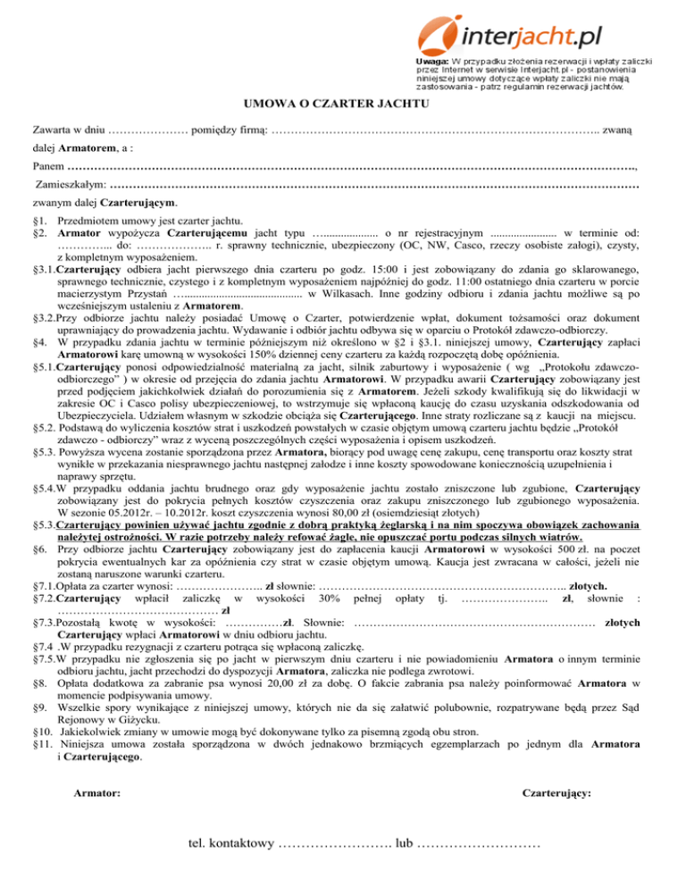 UMOWA O CZARTER JACHTU Zawarta w dniu ………………… pomiędzy firmą: ………………………………………………………………………….. zwaną dalej Armatorem, a : Panem …………………………………………………………………………………………………………………………………., Zamieszkałym: ………………………………………………………………………………………………………………………… zwanym dalej Czarterującym. §1. Przedmiotem umowy jest czarter jachtu. §2. Armator wypożycza Czarterującemu jacht typu …................... o nr rejestracyjnym ....................... w terminie od: …………... do: ……………….. r. sprawny technicznie, ubezpieczony (OC, NW, Casco, rzeczy osobiste załogi), czysty, z kompletnym wyposażeniem. §3.1.Czarterujący odbiera jacht pierwszego dnia czarteru po godz. 15:00 i jest zobowiązany do zdania go sklarowanego, sprawnego technicznie, czystego i z kompletnym wyposażeniem najpóźniej do godz. 11:00 ostatniego dnia czarteru w porcie macierzystym Przystań …......................................... w Wilkasach. Inne godziny odbioru i zdania jachtu możliwe są po wcześniejszym ustaleniu z Armatorem. §3.2.Przy odbiorze jachtu należy posiadać Umowę o Czarter, potwierdzenie wpłat, dokument tożsamości oraz dokument uprawniający do prowadzenia jachtu. Wydawanie i odbiór jachtu odbywa się w oparciu o Protokół zdawczo-odbiorczy. §4. W przypadku zdania jachtu w terminie późniejszym niż określono w §2 i §3.1. niniejszej umowy, Czarterujący zapłaci Armatorowi karę umowną w wysokości 150% dziennej ceny czarteru za każdą rozpoczętą dobę opóźnienia. §5.1.Czarterujący ponosi odpowiedzialność materialną za jacht, silnik zaburtowy i wyposażenie ( wg „Protokołu zdawczoodbiorczego” ) w okresie od przejęcia do zdania jachtu Armatorowi. W przypadku awarii Czarterujący zobowiązany jest przed podjęciem jakichkolwiek działań do porozumienia się z Armatorem. Jeżeli szkody kwalifikują się do likwidacji w zakresie OC i Casco polisy ubezpieczeniowej, to wstrzymuje się wpłaconą kaucję do czasu uzyskania odszkodowania od Ubezpieczyciela. Udziałem własnym w szkodzie obciąża się Czarterującego. Inne straty rozliczane są z kaucji na miejscu. §5.2. Podstawą do wyliczenia kosztów strat i uszkodzeń powstałych w czasie objętym umową czarteru jachtu będzie „Protokół zdawczo - odbiorczy” wraz z wyceną poszczególnych części wyposażenia i opisem uszkodzeń. §5.3. Powyższa wycena zostanie sporządzona przez Armatora, biorący pod uwagę cenę zakupu, cenę transportu oraz koszty strat wynikłe w przekazania niesprawnego jachtu następnej załodze i inne koszty spowodowane koniecznością uzupełnienia i naprawy sprzętu. §5.4.W przypadku oddania jachtu brudnego oraz gdy wyposażenie jachtu zostało zniszczone lub zgubione, Czarterujący zobowiązany jest do pokrycia pełnych kosztów czyszczenia oraz zakupu zniszczonego lub zgubionego wyposażenia. W sezonie 05.2012r. – 10.2012r. koszt czyszczenia wynosi 80,00 zł (osiemdziesiąt złotych) §5.3.Czarterujący powinien używać jachtu zgodnie z dobrą praktyką żeglarską i na nim spoczywa obowiązek zachowania należytej ostrożności. W razie potrzeby należy refować żagle, nie opuszczać portu podczas silnych wiatrów. §6. Przy odbiorze jachtu Czarterujący zobowiązany jest do zapłacenia kaucji Armatorowi w wysokości 500 zł. na poczet pokrycia ewentualnych kar za opóźnienia czy strat w czasie objętym umową. Kaucja jest zwracana w całości, jeżeli nie zostaną naruszone warunki czarteru. §7.1.Opłata za czarter wynosi: ………………….. zł słownie: ……………………………………………………….. złotych. §7.2.Czarterujący wpłacił zaliczkę w wysokości 30% pełnej opłaty tj. ………………….. zł, słownie : …………………………………… zł §7.3.Pozostałą kwotę w wysokości: ……………zł. Słownie: ……………………………………………………… złotych Czarterujący wpłaci Armatorowi w dniu odbioru jachtu. §7.4 .W przypadku rezygnacji z czarteru potrąca się wpłaconą zaliczkę. §7.5.W przypadku nie zgłoszenia się po jacht w pierwszym dniu czarteru i nie powiadomieniu Armatora o innym terminie odbioru jachtu, jacht przechodzi do dyspozycji Armatora, zaliczka nie podlega zwrotowi. §8. Opłata dodatkowa za zabranie psa wynosi 20,00 zł za dobę. O fakcie zabrania psa należy poinformować Armatora w momencie podpisywania umowy. §9. Wszelkie spory wynikające z niniejszej umowy, których nie da się załatwić polubownie, rozpatrywane będą przez Sąd Rejonowy w Giżycku. §10. Jakiekolwiek zmiany w umowie mogą być dokonywane tylko za pisemną zgodą obu stron. §11. Niniejsza umowa została sporządzona w dwóch jednakowo brzmiących egzemplarzach po jednym dla Armatora i Czarterującego. Armator: Czarterujący: tel. kontaktowy ……………………. lub ………………………