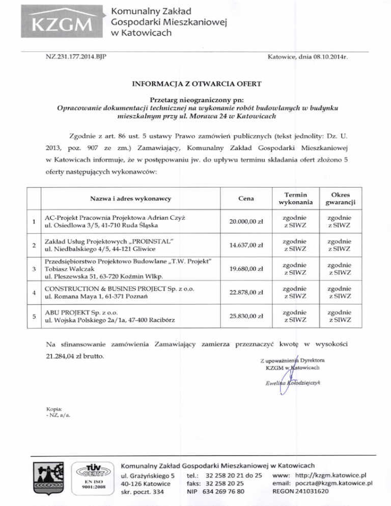 w Katowicach informuje, i€ w postgpowaniu jw. do uplywu terminu skladania ofert zlo2ono 5