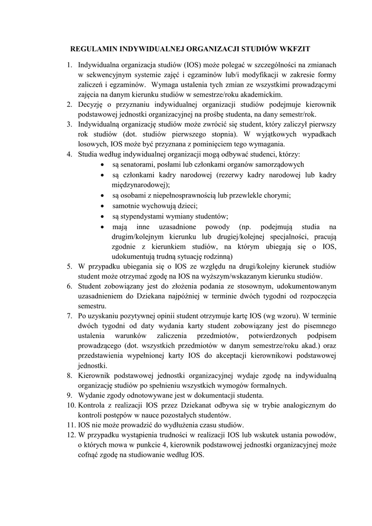 REGULAMIN INDYWIDUALNEJ ORGANIZACJI STUDIÓW WKFZIT 1. Indywidualna organizacja studiów (IOS) może polegać w szczególności na zmianach w sekwencyjnym systemie zajęć i egzaminów lub/i modyfikacji w zakresie formy zaliczeń i egzaminów. Wymaga ustalenia tych zmian ze wszystkimi prowadzącymi zajęcia na danym kierunku studiów w semestrze/roku akademickim. 2. Decyzję o przyznaniu indywidualnej organizacji studiów podejmuje kierownik podstawowej jednostki organizacyjnej na prośbę studenta, na dany semestr/rok. 3. Indywidualną organizację studiów może zwrócić się student, który zaliczył pierwszy rok studiów (dot. studiów pierwszego stopnia). W wyjątkowych wypadkach losowych, IOS może być przyznana z pominięciem tego wymagania. 4. Studia według indywidualnej organizacji mogą odbywać studenci, którzy: są senatorami, posłami lub członkami organów samorządowych są członkami kadry narodowej (rezerwy kadry narodowej lub kadry międzynarodowej); są osobami z niepełnosprawnością lub przewlekle chorymi; samotnie wychowują dzieci; są stypendystami wymiany studentów; mają inne uzasadnione powody (np. podejmują studia na drugim/kolejnym kierunku lub drugiej/kolejnej specjalności, pracują zgodnie z kierunkiem studiów, na którym ubiegają się o IOS, udokumentują trudną sytuację rodzinną) 5. W przypadku ubiegania się o IOS ze względu na drugi/kolejny kierunek studiów student może otrzymać zgodę na IOS na wyższym/wskazanym kierunku studiów. 6. Student zobowiązany jest do złożenia podania ze stosownym, udokumentowanym uzasadnieniem do Dziekana najpóźniej w terminie dwóch tygodni od rozpoczęcia semestru. 7. Po uzyskaniu pozytywnej opinii student otrzymuje kartę IOS (wg wzoru). W terminie dwóch tygodni od daty wydania karty student zobowiązany jest do pisemnego ustalenia warunków zaliczenia przedmiotów, potwierdzonych podpisem prowadzącego (dot. wszystkich przedmiotów w danym semestrze/roku akad.) oraz przedstawienia wypełnionej karty IOS do akceptacji kierownikowi podstawowej jednostki. 8. Kierownik podstawowej jednostki organizacyjnej wydaje zgodę na indywidualną organizację studiów po spełnieniu wszystkich wymogów formalnych. 9. Wydanie zgody odnotowywane jest w dokumentacji studenta. 10. Kontrola z realizacji IOS przez Dziekanat odbywa się w trybie analogicznym do kontroli postępów w nauce pozostałych studentów. 11. IOS nie może prowadzić do wydłużenia czasu studiów. 12. W przypadku wystąpienia trudności w realizacji IOS lub wskutek ustania powodów, o których mowa w punkcie 4, kierownik podstawowej jednostki organizacyjnej może cofnąć zgodę na studiowanie według IOS. Podstawa prawna: Uchwała Rady Wydziału Kultury Fizycznej, Zdrowia i Turystyki Nr 13/2012/2013 z dnia 13.11.2012 r. Uchwała Rady Wydziału Kultury Fizycznej, Zdrowia i Turystyki Nr 66/2012/2013 z dnia 18.06.2013 r. Uchwała Rady Wydziału Kultury Fizycznej, Zdrowia i Turystyki Nr 33/2016/2017 z dnia 13.12.2016 r.