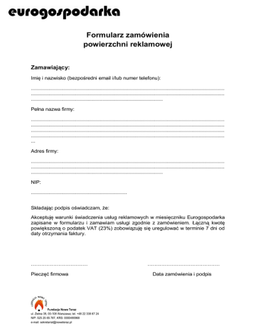 Formularz zamówienia powierzchni reklamowej Zamawiający: Imię i nazwisko (bezpośredni email i/lub numer telefonu): ....................................................................................................................................... ....................................................................................................................................... ............................................................................................ Pełna nazwa firmy: ....................................................................................................................................... ....................................................................................................................................... ....................................................................................................................................... ....................................................................................................................................... ... Adres firmy: ....................................................................................................................................... ....................................................................................................................................... ............................................................................................ NIP: ................................................................... Składając podpis oświadczam, że: Akceptuję warunki świadczenia usług reklamowych w miesięczniku Eurogospodarka zapisane w formularzu i zamawiam usługi zgodnie z zamówieniem. Łączną kwotę powiększoną o podatek VAT (23%) zobowiązuję się uregulować w terminie 7 dni od daty otrzymania faktury. …………………………… Pieczęć firmowa Fundacja Nowe Teraz ul. Zielna 39, 00-108 Warszawa; tel. +48 22 338 67 24 NIP: 525 25 85 787, KRS: 0000495968 e-mail: [email protected] …………………………………… Data zamówienia i podpis SPECYFIKACJA ZAMÓWIENIA Zamawiam baner reklamowy/artykuł sponsorowany na stronie internetowej miesięcznika „EUROGOSPODARKA” na okres od …………………………do …………………………. Projekt banneru reklamowego/artykułu sponsorowanego dostarcza Zamawiający w terminie do: . (data) BANNER INTERNETOWY Cena Dostępne formaty plików: formaty statyczne/dynamiczne – SWF, GIF, PNG, JPG Długość emisji (w tyg.) netto* Capping Rabat (za 1 Cena całkowita tydzień) BILLBOARD 750x100px 1 500 BANNER 336x280px 1 200 RECTANGLE BANNER 1 200 600x100px (pomiędzy tekstem) RECTANGLE BANNER 1 300 600x200px (pomiędzy tekstem) ARTYKUŁ SPONSOROWANY Długość emisji (w tyg.) max. 10 000 znaków + 5 grafik 2(2) Cena netto* Cena Rabat całkowita 3 000 RAZEM: * Kwotę należy powiększyć o podatek VAT 23%. ** Niepotrzebne skreślić. CAPPING RODZAJE: 1. CAPPING 1 – jedna odsłona przypadająca na jednego użytkownika netto 2. CAPPING 2 – dwie odsłony przypadające na jednego użytkownika netto 3. CAPPING 3 – trzy odsłony przypadające na jednego użytkownika netto 4. CAPPING Ø – bez cappingu; Fundacja Nowe Teraz ul. Zielna 39, 00-108 Warszawa; tel. +48 22 338 67 24 NIP: 525 25 85 787, KRS: 0000495968 e-mail: [email protected] + 15% ceny + 10% ceny + 5% ceny