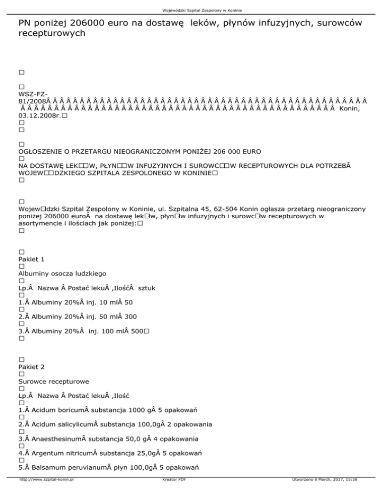 Wojewódzki Szpital Zespolony w Koninie PN poniżej 206000 euro na dostawę leków, płynów infuzyjnych, surowców recepturowych WSZ-FZ81/2008                                                                                               Konin, 03.12.2008r. OGŁOSZENIE O PRZETARGU NIEOGRANICZONYM PONIŻEJ 206 000 EURO NA DOSTAWĘ LEKÓW, PŁYNÓW INFUZYJNYCH I SUROWCÓW RECEPTUROWYCH DLA POTRZEB WOJEWÓDZKIEGO SZPITALA ZESPOLONEGO W KONINIE WojewÃłdzki Szpital Zespolony w Koninie, ul. Szpitalna 45, 62-504 Konin ogłasza przetarg nieograniczony poniżej 206000 euro na dostawę lekÃłw, płynÃłw infuzyjnych i surowcÃłw recepturowych w asortymencie i ilościach jak poniżej: Pakiet 1 Albuminy osocza ludzkiego Lp. Nazwa  Postać leku ,Ilość sztuk 1. Albuminy 20% inj. 10 ml 50 2. Albuminy 20% inj. 50 ml 300 3. Albuminy 20% inj. 100 ml 500 Pakiet 2 Surowce recepturowe Lp. Nazwa  Postać leku ,Ilość 1. Acidum boricum substancja 1000 g 5 opakowań 2. Acidum salicylicum substancja 100,0g 2 opakowania 3. Anaesthesinum substancja 50,0 g 4 opakowania 4. Argentum nitricum substancja 25,0g 5 opakowań 5. Balsamum peruvianum płyn 100,0g 5 opakowań http://www.szpital-konin.pl Kreator PDF Utworzono 8 March, 2017, 15:38 Wojewódzki Szpital Zespolony w Koninie 6. Calcium carbonicum praecipitatum substancja 1,0 kg 5 opakowań 7. Detreomycyna substancja 10g 6 opakowań 8. Chloralum hydratum substancja 100,0 g 12 opakowań 9. Eucerinum podłoże do maści 1 kg 10 opakowań 10. Formaldehydum płyn 40% 1 l. 200 opakowań 11. Formaldehydum  substancja 40% 1 kg 5 opakowań 12. Glicerol płyn 86% 1 kg 30 opakowań 13. Hydrocortisonum substancja 10,0 g 9 opakowań 14. Kalium jodatum substancja 100,0 g 1 opakowanie 15. Lanolinum anhydricum podłoże do maści 5,0 kg 15 opakowań 16. Mentholum substancja 25,0 g 3 opakowania 17. Natrium biboricum pulv. 100,0 g 50 opakowań 18. Natrium bicarbonicum pulv. 1,0 kg 40 opakowań 19. Nystatyna substancja 10,0 g 5 opakowań 20. Parafinum liquidum płyn 900g 120 opakowań 21. Perhydrol 30% płyn 30% 1 kg 60 opakowań 22. Pyoctanina 10 g 5 opakowań 23. Saccharum lactis substancja 250 g 4 opakowania 24. Scopolaminum hydrobromicum substancja 1 g 2 opakowania 25. Talcum substancja 1000 g 5 opakowań 26. Tetracainum hydrochloricum substancja 25,0g 2 opakowania 27. Vaselinum album podłoże do maści 5 kg 10 opakowań 28. Vaselinum flavum podłoże do maści 1000 g 100 opakowań 29. Zincum oxydatum substancja 1 kg 3 opakowania 30. Chlorhexidinum gluconicum płyn 20,0% 500 ml 100 opakowań 31. Tinetura jodi spirytuosa płyn 800g 10 opakowań 32. Jodum substancja 5g 3 opakowania 33. Glucosum substancja 1000,0 g 30 opakowań 34. Natrium chloratum substancja 1,0 kg 5 opakowań 35. Benzyna apteczna płyn 1 l 200 opakowań http://www.szpital-konin.pl Kreator PDF Utworzono 8 March, 2017, 15:38 Wojewódzki Szpital Zespolony w Koninie Pakiet 3 Płyny infuzyjne w opakowaniach posiadających dwa jałowe i niezależne od siebie porty L.p. Asortyment Ilość sztuk 1.  5% Glucosum a 1000 ml 500 2.  5% Glucosum a 500 ml 35.000 3.  10% Glucosum a 500 ml 3.500 4.  0,9% Natrium Chloratum a 100 ml 85.000 5.  0,9% Natrium Chloratum a 250 ml 15.000 6.  0,9% Natrium Chloratum a 500 ml 40.000 7.  0,9 %Natrium Chloratum a 1000 ml 500 8.  Płyn wieloelektrolitowy a 500 ml 50.000 9.  Płyn wieloelektrolitowy a 1000 ml 2.000 10.  Płyn Solutio Ringeri a 500 ml 1.000 11.  Aqua pro injectione a 500 ml 3.500 Pakiet 4  Płyny w opakowaniach posiadających dwa jałowe i niezależne od siebie porty L.p. Asortyment Ilość sztuk 1. Płyn jelitowy a 500 ml 1.000 2. Płyn nawadniający a 500 ml 5.000 3. Płyn pediatryczny wyrÃłwnawczy a 250 ml 500 Pakiet 5 Adefowir L.p. Nazwa Postać leku Ilość sztuk 1. Adefowir tabletki 10 mg 1080 http://www.szpital-konin.pl Kreator PDF Utworzono 8 March, 2017, 15:38 Wojewódzki Szpital Zespolony w Koninie Pakiet 6 L.p. Nazwa Postać leku Ilość sztuk 1 Rybaviryna tabletki 200mg 4 592, 2 Rybaviryna tabletki 400mg 1 640 3 Peginterferon Alfa – 2A injekcje0,5ml 43 200µg w dostępnych dawkach 180µg i 135 µg Pakiet 7 Cinacalcet L.p. Nazwa Postać lekuÂ Łączna dawka podzielna na 30, 60, 90 mg, Ilość mg 1 Cinacalcet Tabletki mg 90 720 mg 2. Wymagany termin realizacji zamÃłwienia: 12 miesięcy od dnia podpisani umowy. 3. Specyfikacja istotnych warunkÃłw zamÃłwienia dostępna jest na stronie internetowej WojewÃłdzkiego Szpitala Zespolonego w Koninie pod adresem: www.szpital-konin.pl. Specyfikację można odebrać rÃłwnież w siedzibie Zamawiającego: Konin, ul. Szpitalna 45, pokÃłj nr 3/33 II piętro lub za zaliczeniem pocztowym od 03.12.2008r Cena formularza 20,00 zł, + koszty przesyłki. 4. Zamknięte koperty zawierające oferty należy złożyć w WojewÃłdzkim Szpitalu Zespolonym w Koninie, ul. Szpitalna 45, (Kancelaria, pokÃłj 3/13) w nieprzekraczalnym terminie do dnia 12.12.2008r do godz. 10:00. Koperty winny być oznakowane: „Oferta w przetargu nieograniczonym poniżej 206000 euro na dostawę lekÃłw, płynÃłw infuzyjnych, surowcÃłw recepturowych dla potrzeb WojewÃłdzkiego Szpitala Zespolonego w Koninie (WSZ-FZ-81/2008). Nie otwierać przed 12.12.2008r., godz. 11:00―. 5. Pracownikami uprawnionymi do kontaktowania się z oferentami są: - w sprawach formalnych: Katarzyna Lewandowska – tel. (0-63) 240-41-33, faks 240-41-34 - w sprawach merytorycznych: – Kierownik Apteki- Izabela Czop – tel. 240-44-44. http://www.szpital-konin.pl Kreator PDF Utworzono 8 March, 2017, 15:38 Wojewódzki Szpital Zespolony w Koninie 6. Otwarcie ofert nastąpi w dniu 12.12.2008r. o godz. 11:00 w siedzibie Zamawiającego: Konin, ul. Szpitalna 45, świetlica, p