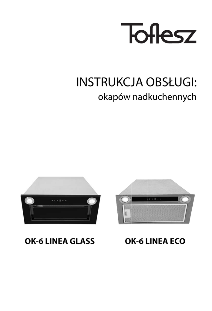 INSTRUKCJA OBSŁUGI: okapów nadkuchennych OK-6 LINEA GLASS OK-6 LINEA ECO Szanowny Kliencie Staliście się Państwo właścicielami najnowszej generacji okapu nadkuchennego. Okap ten został zaprojektowany i wykonany specjalnie z myślą o spełnieniu Państwa oczekiwań i z pewnością będzie stanowić część nowocześnie wyposażonej kuchni. Zastosowane w nim nowoczesne rozwiązania konstrukcyjne i użycie najnowszej technologii produkcji, zapewniają mu wysoką funkcjonalność i estetykę. Przed przystąpieniem do montażu okapu prosimy o dokładne zapoznanie się z treścią niniejszej instrukcji. Dzięki temu unikną Państwo błędnej instalacji i obsługi okapu. Życzymy satysfakcji i zadowolenia z wyboru okapu firmy Toflesz. I. SPECJALNE INSTRUKCJE DOTYCZĄCE BEZPIECZNEGO DZIAŁANIA OKAPU 1. Przed przystąpieniem do montażu należy dokładnie przeczytać niniejszą instrukcję. 2. Instalację okapu należy przeprowadzić zgodnie z opisem i wytycznymi przedstawionymi w rozdziale „Montaż”. 3. Okap nadkuchenny może być podłączony tylko do gniazda zasilającego o napięciu znamionowym 230V~ i częstotliwości 50Hz. Przed podłączeniem okapu należy sprawdzić, czy gniazdo jest wyposażone w sprawnie funkcjonujące uziemienie. 4. Niedopuszczalne jest, aby elektryczne gniazda zasilające instalacji stałej znajdowały się pod okapem. 5. Należy zwracać uwagę, aby przewód zasilający nie znajdował się pod okapem. 6. Jeżeli przewód zasilający nieodłączalny ulegnie uszkodzeniu, to powinien on być wymieniony u wytwórcy lub u pracownika zakładu serwisowego albo przez wykwalifikowaną osobę w celu uniknięcia zagrożenia. 2 7. W przypadku uszkodzenia okapu, naprawa może być przeprowadzona u wytwórcy lub u pracownika zakładu serwisowego albo przez wykwalifikowaną osobę. 8. Należy zwracać uwagę, aby w pomieszczeniu była odpowiednia wentylacja powietrza, gdy okap nadkuchenny jest używany w tym samym czasie, co urządzenia spalające gaz lub inne paliwa (nie dotyczy tylko okapów pracujących jako pochłaniacze zapachów, które dostarczają powietrze z powrotem do pomieszczenia). 9. Szczegóły dotyczące sposobu i częstotliwości czyszczenia są opisane w rozdziale „Konserwacja”. 10. Przed każdą operacja czyszczenia, wymianą filtra lub wymianą lampy należy wyjąc wtyczkę okapu z elektrycznego gniazda zasilającego lub w przypadku okapu na stałe podłączonego do instalacji elektrycznej odłączyć zasilanie. 11. Istnieje ryzyko pożaru, jeżeli czyszczenie nie odbywa się zgodnie z zaleceniami. 12. Pod okapem nadkuchennym nie wolno pozostawiać odkrytego płomienia, podczas zdejmowania naczyń znad palnika, należy ustawić płomień minimalny. 13. Potrawy przygotowywane na tłuszczach powinny być stale nadzorowane, ponieważ nagrzany tłuszcz może się łatwo zapalić. 14. UWAGA: Dostępne części okapu mogą się nagrzewać w przypadku korzystania z urządzenia do gotowania. 15. Niniejszy sprzęt może być użytkowany przez dzieci w wieku co najmniej 8 lat i przez osoby o obniżonych możliwościach fizycznych, umysłowych i osoby o braku doświadczenia i znajomości sprzętu, jeżeli zapewniony zostanie nadzór lub instruktaż odnośnie do użytkowania sprzętu w bezpieczny sposób, tak aby związane z tym zagrożenia były zrozumiałe. Dzieci nie powinny bawić się sprzętem. Dzieci bez nadzoru nie powinny wykonywać czyszczenia i konserwacji sprzętu. 3 II. CHARAKTERYSTYKA Okap nadkuchenny służy do usuwania oparów kuchennych. Jest on przeznaczony do użytku domowego. Okap wymaga zainstalowania przewodu odprowadzającego powietrze na zewnątrz. Po zainstalowaniu filtra z węglem aktywnym okap może pracować jako pochłaniacz zapachów. W tym przypadku nie wymaga się instalacji przewodu odprowadzającego powietrze na zewnątrz. Okap jest urządzeniem elektrycznym wykonanym w I klasie ochrony przeciwporażeniowej. Posiada niezależne oświetlenie LEDowe oraz wentylator wyciągowy z możliwością ustawienia jednej z czterech prędkości obrotowych. Okap przeznaczony jest do trwałego zamontowania ponad kuchenką gazową lub elektryczną. III. DANE TECHNICZNE Napięcie zasilania: 230V ~50Hz Ilość silników wentylatora: 1 Ilość filtrów aluminiowych: 1 Oświetlenie: LED SMD 2 x 2 W Ilość stopni prędkości: 4 Szerokość: Średnica wylotu: Maksymalna wydajność: 564 / 864 mm Ø 150 mm lub Ø 120 mm 700 m3/h lub 850 m3/h Maksymalny pobór mocy: Poziom głośności: 1 bieg 2 bieg 3 bieg 4 bieg (intensywny) Rodzaj pracy: Panel sterowania: 4 214 W lub 254 W 3 700 m /h 44 dB(A) 51 dB(A) 57 dB(A) 64 dB(A) 850 m3/h 42 dB(A) 50 dB(A) 59 dB(A) 69 dB(A) wyciąg lub pochłaniacz panel dotykowy oraz pilot zdalnego sterowania RYSUNKI TECHNICZNY 175 0 33 220 0 23 Ø150 lub Ø120 295 10 5 /84 5 54 64 4/8 270 56 Rozmiar 564 mm waga netto – 6,90 kg waga brutto – 9,65 kg Rozmiar 864 mm waga netto – 8,60 kg waga brutto – 10,00 kg 285 Okap OK-6 LINEA ECO 175 0 33 220 0 23 Ø150 lub Ø120 295 15 45 5/8 54 270 285 Okap OK-6 LINEA GLASS 64 4/8 56 Rozmiar 564 mm waga netto – 8,40 kg waga brutto – 11,30 kg Rozmiar 864 mm waga netto – 10,90 kg waga brutto – 12,25 kg 5 IV. ZAWARTOŚĆ ZESTAWU ŚRUBY MONTAŻOWE AKCESORIA A 4 x śruba M5 pilota zdalnego sterowania ELEMENTY MONTAŻOWE 1 okap LINEA GLASS /LINEA ECO/LINEA PLUS 2 redukcja Ø 150 / Ø 120 V. MONTAŻ Powietrze odprowadzane z okapu nie może być odprowadzane do komina, który jest używany do odprowadzania spalin z urządzeń spalających gaz lub inne paliwa. Przed przystąpieniem do montażu okapu należy podłączyć go do sieci elektrycznej (230V ~50Hz) w celu sprawdzenia czy oświetlenie i silnik działają prawidłowo. W miejscu instalacji okapu powinien być zapewniony w miarę łatwy dostęp do gniazda elektrycznego w celu awaryjnego wyjęcia wtyczki i przerwania zasilania urządzenia. 6 KROK 1 Wyznacz a potem wytnij w szafce otwór pod rurę odprowadzającą powietrz