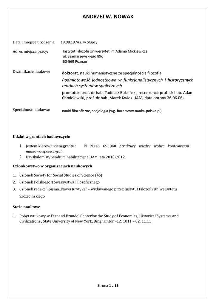 ANDRZEJ W. NOWAK Data i miejsce urodzenia 19.08.1974 r. w Słupcy Adres miejsca pracy: Instytut Filozofii Uniwersytet im Adama Mickiewicza ul. Szamarzewskiego 89c 60-569 Poznań Kwalifikacje naukowe doktorat. nauki humanistyczne ze specjalnością filozofia Podmiotowość jednostkowa w funkcjonalistycznych i historycznych teoriach systemów społecznych promotor: prof. dr hab. Tadeusz Buksiński, recenzenci: prof. dr hab. Adam Chmielewski, prof. dr hab. Marek Kwiek UAM, data obrony 26.06.06). Specjalność naukowa: nauki filozoficzne, socjologia (wg. baza www.nauka-polska.pl) Udział w grantach badawczych: 1. Jestem kierownikiem grantu : N N116 695040 Struktury wiedzy wobec kontrowersji naukowo-społecznych 2. Uzyskałem stypendium habilitacyjne UAM lata 2010-2012. Członkowstwo w organizacjach naukowych 1. Członek Society for Social Studies of Science (4S) 2. Członek Polskiego Towarzystwa Filozoficznego 3. Członek redakcji pisma „Nowa Krytyka” – wydawanego przez Instytut Filozofii Uniwersytetu Szczecińskiego Staże naukowe 1. Pobyt naukowy w Fernand Braudel Centerfor the Study of Economies, Historical Systems, and Civilizations , State University of New York, Binghamton -12. 1011 – 02. 11.11 Strona 1 z 13 ANDRZEJ W. NOWAK PUBLIKACJE NAUKOWE Książki 1. Podmiot, system, nowoczesność, Wydawnictwo IF UAM, Poznań 2011. Rozdziały w książkach 1. Przyszłość nie jest już tym, czym była kiedyś, Przedmowa do książki Immanuela Wallersteina, Utopistyka. Alternatywy historyczne dla XXI wieku, Wydawnictwo Bractwo Trojka, Poznań, 2008 Artykuły naukowe (2001-2010) 1. Europejska nowoczesność i jej wyparte konstytuujące „zewnętrze”, „Nowa Krytyka. Czasopismo filozoficzne” 26/27/2011 2. Czy można filozofować po Kongo Belgijskim? [w:] W sprawie Agambena Konteksty krytyki, (red.) Łukasz Musiał, Mikołaj Ratajczak, Krystian Szadkowski, Arkadiusz Żychliński, Wydawnictwo Poznańskie, Poznań 2010 3. Neoliberalna akademia. Szkolnictwo wyższe a wytwarzanie i legitymizowanie podziałów klasowych w Polsce po 1989 roku, [w:] red. naukowy Piotr Żuk. Podziały klasowe i nierówności społeczne. Oficyna Naukowa, Warszawa 2010, s. 117-132. 4. Komunikacja, demokracja, wykluczenie. O związkach demokracji i ontologii społecznej w społeczeństwie informacyjnym, „Kultura i Historia” nr 18/2010. 5. Florian Znaniecki- pomiędzy filozofią, teorią a socjologia wiedzy, (red) Tadeusz Buksiński, Wydawnictwo Instytutu Filozofii UAM, Poznań 2010. 6. Komunizm a ambiwalencje nowoczesności, [w:] Fenomen rosyjskiego komunizmu. Geneza, konteksty, konsekwencje, (red.) Bartłomiej Brzeziński, Wydawnictwo Naukowe UAM, Poznań 2010, s.259-269. 7. Polityka (estetyka?) innowacji. Laboratorium rzeczywistości czy jej polityka?, [w:] Dystrybucja Nooawangardy, (red.) Łukasz Ronduda, Edwin Bendyk, Wydawca: Fundacji Modern Art Means Modern Artist Language MAMMAL i Centrum Sztuki Współczesnej Zamek Ujazdowski, Warszawa 2010 8. Is Global Sittlichkeit possible? Culture, Human Rights and Modern World-System, [w:] Hegels politische Philosophie Zweiter Teil, (red.) Andreas Arndt, Paul Cruysberghs, Andrzej Przylebski, Akademie Verlag, Berlin 2009, s. 28 -33. 9. Komunikacja a przemoc strukturalna, [w:] Teorie mediów i komunikacji, tom 1 (red.) Marek Graszewicz, Jerzy Jastrzębski, Uniwersytet Wrocławski, Oficyna Wydawnicza ATUT, Wrocław 2009. 10. Methodenstreit, podmiot, phronesis. Wpływ sposobu interpretacji opozycji humanistyka a przyrodoznawstwo, na rozumienie etyki, polityki i podmiotu, [w:] Andrzej Szahaj, Adam Kola, (red.) Filozofia i etyka interpretacji, Wydawca: UNIVERSITAS, Kraków 2007, (artykuł ukazał się poprzednio – decyzją redaktora tomu Andrzeja Szahaja w Tekstach Drugich 6 /2006), 11. Wspólnota i wspólnotowość w procesach tranformacji systemowej, [w:] „Homo Politicus” rocznik Politologiczny vol 1(2) 2007, Wydawnictwo WSHE Łódź 12. Czy możliwa jest globalna etyczność? Kultura, prawa człowieka a nowoczesny system światowy [w:] Filozofia polityczna Hegla, Andrzej Przyłębski (red.), Campo di Fiori Poznań 2007 13. Responsywność a samorządność - wokół idei „społeczeństwa aktywnego" Amitaia Etzioniego, [w:] Tadeusz Buksiński, Krzysztof Bondyra, Jarema Jakubowski (red.) Demokracja, samorządność, prawo, Strona 2 z 13 ANDRZEJ W. NOWAK Wydawca: Instytut Filozofii UAM, Poznań 2007, 14. Pojęcie aktora w naukach społecznych a zaangażowanie społeczne nauki. Dyskusja Wallerstein-Joas nad raportem komisji Gulbenkiana [w:] M. Korczyński, P. Pluciński, Konstrukcja czy rekonstrukcja rzeczywistości/?/ Dylematy społecznego zaangażowania. Bogucki Wydawnictwo Naukowe, Poznań 2006, s. 153-168 15. Podmiotowość, wspólnota, system. Pomiędzy etyką, polityką a socjologią wiedzy [w:] Od filozofii polityki do praktyki politycznej (red.) Andrzej Szahaj, Wydawnictwo Naukowe UMK, Toruń 2006 16. Całość, złożoność, ontologia społeczna. Pojęcie całości we współczesnym paradygmacie systemowych analiz społeczeństwa, [w:] Piotr Orlik (red.), Całość –wizje pejzaże, teorie Problemy /Dyskusje, Wydawnictwo Naukowe IF UAM, Poznań 2006. 17. Uczucia a solidarność społeczna [w:] Piotr Orlik (red.) Uczucie, Problemy /Dyskusje, Wydawnictwo Naukowe IF UAM, Poznań 2005. 18. Uniwersalizm pluralistyczny jako próba pogodzenia uniwersalizmu praw człowieka z relatywizmem kulturowym konferencji [w:] Jarosław Greser, Paweł Mazur, (red.), Aktualne problemy w realizacji praw człowieka na arenie międzynarodowej, regionalnej i krajowej, tom pokonferencyjny wydany przez Wydział Prawa i Administracji UAM, Poznań 2005. 19. Oznaczanie jako forma władzy. Pomiędzy metafizyką a teorią społeczną. [w:] Piotr Orlik, (red.), W gąszczu znaków, Problemy /Dyskusje, Wydawnictwo Naukowe IF UAM, Poznań 2004. 20. Poszukiwanie tożsamości czy instynkt stada? [w:] Czas Kultury, nr 6/2003 21. Cicha siła możliwego, [w:] Marchew Marta, Mroczkowska Dorot