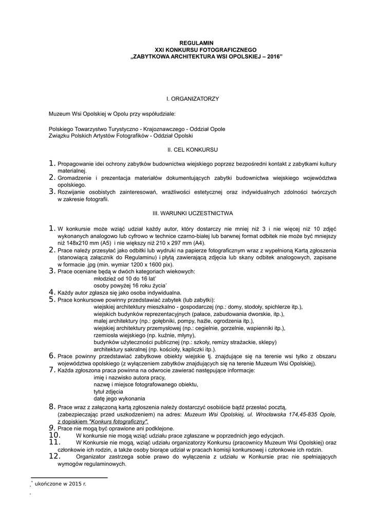REGULAMIN XXI KONKURSU FOTOGRAFICZNEGO „ZABYTKOWA ARCHITEKTURA WSI OPOLSKIEJ – 2016” I. ORGANIZATORZY Muzeum Wsi Opolskiej w Opolu przy współudziale: Polskiego Towarzystwo Turystyczno - Krajoznawczego - Oddział Opole Związku Polskich Artystów Fotografików - Oddział Opolski II. CEL KONKURSU 1. Propagowanie idei ochrony zabytków budownictwa wiejskiego poprzez bezpośredni kontakt z zabytkami kultury materialnej. 2. Gromadzenie 3. i prezentacja materiałów dokumentujących zabytki budownictwa wiejskiego województwa opolskiego. Rozwijanie osobistych zainteresowań, wrażliwości estetycznej oraz indywidualnych zdolności twórczych w zakresie fotografii. III. WARUNKI UCZESTNICTWA 1. W konkursie może wziąć udział każdy autor, który dostarczy nie mniej niż 3 i nie więcej niż 10 zdjęć wykonanych analogowo lub cyfrowo w technice czarno-białej lub barwnej format odbitek nie może być mniejszy niż 148x210 mm (A5) i nie większy niż 210 x 297 mm (A4). 2. Prace należy przesyłać jako odbitki lub wydruki na papierze fotograficznym wraz z wypełnioną Kartą zgłoszenia (stanowiącą załącznik do Regulaminu) i płytą zawierającą zdjęcia lub skany odbitek analogowych, zapisane w formacie .jpg (min. wymiar 1200 x 1600 pix). 3. Prace oceniane będą w dwóch kategoriach wiekowych: młodzież od 10 do 16 lat osoby powyżej 16 roku życia 4. Każdy autor zgłasza się jako osoba indywidualna. 5. Prace konkursowe powinny przedstawiać zabytek (lub zabytki): wiejskiej architektury mieszkalno - gospodarczej (np.: domy, stodoły, spichlerze itp.), wiejskich budynków reprezentacyjnych (pałace, zabudowania dworskie, itp.), malej architektury (np.: gołębniki, pompy, haźle, ogrodzenia itp.), wiejskiej architektury przemysłowej (np.: cegielnie, gorzelnie, wapienniki itp.), rzemiosła wiejskiego (np. kuźnie, młyny), budynków użyteczności publicznej (np.: szkoły, remizy strażackie, sklepy) architektury sakralnej (np. kościoły, kapliczki itp.). 6. Prace powinny przedstawiać zabytkowe obiekty wiejskie tj. znajdujące się na terenie wsi tylko z obszaru województwa opolskiego (z wyłączeniem zabytków znajdujących się na terenie Muzeum Wsi Opolskiej). 7. Każda zgłoszona praca powinna na odwrocie zawierać następujące informacje: imię i nazwisko autora pracy, nazwę i miejsce fotografowanego obiektu, tytuł zdjęcia datę jego wykonania 8. Prace wraz z załączoną kartą zgłoszenia należy dostarczyć osobiście bądź przesłać pocztą, (zabezpieczając przed uszkodzeniem) na adres: Muzeum Wsi Opolskiej, ul. Wrocławska 174,45-835 Opole, z dopiskiem "Konkurs fotograficzny". 9. Prace nie mogą być oprawione ani podklejone. 10. W konkursie nie mogą wziąć udziału prace zgłaszane w poprzednich jego edycjach. 11. W Konkursie nie mogą, wziąć udziału organizatorzy Konkursu (pracownicy Muzeum Wsi Opolskiej) oraz członkowie ich rodzin, a także osoby biorące udział w pracach komisji konkursowej i członkowie ich rodzin. 12. Organizator zastrzega sobie prawo do wyłączenia z udziału w Konkursie prac nie spełniających wymogów regulaminowych. ukończone w 2015 r. IV. PRZEBIEG KONKURSU 1. Konkurs zostaje ogłoszony z dniem 18.04.2016 roku. 2. Termin dostarczenia prac upływa z dniem 30 września 2016 roku (w przypadku przesyłki decyduje data stempla pocztowego). 3. Oceny zgłoszonych prac oraz zakwalifikowania ich do wystawy pokonkursowej dokona Komisja Konkursowa, powołana przez Organizatora. 4. Wystawa pokonkursowa będzie prezentowana od 7 listopada do 30 grudnia 2016 roku. V. NAGRODY 1. Komisja Konkursowa przyzna autorom najlepszych prac następujące nagrody ufundowane przez organizatora: a) w kategorii dzieci zostaną przyznane bony o wartości: I nagroda 250 zł, II nagroda 200 zł, Ill nagroda 150 zł, 3 wyróżnienia po 80 zł b) w kategorii dorośli: I nagroda 500 zł, II nagroda 400 zł, Ill nagroda 300 zł, 3 wyróżnienia po 150 zł, c) nagroda specjalna (rzeczowa) za dodatkowe walory krajoznawcze zgłoszonej pracy, ufundowana przez PTTK Opole, 2. Komisja Konkursowa zastrzega sobie prawo innego podziału nagród. VI. OGŁOSZENIE WYNIKÓW 1. Wyniki Konkursu zostaną ogłoszone po oficjalnym otwarciu wystawy pokonkursowej na stronie internetowej Muzeum Wsi Opolskiej oraz w lokalnych mediach. 2. Autorzy nagrodzonych prac zostaną powiadomieni indywidualnie o jego wynikach. Wszyscy uczestnicy zostaną zaproszeni do udziału w uroczystym podsumowaniu Konkursu połączonym z otwarciem wystawy pokonkursowej. VII. PRAWA UCZESTNIKÓW I ORGANIZATORÓW 1. Prace nagrodzone, wyróżnione oraz zakwalifikowane na wystawę pokonkursową przechodzą na własność Muzeum. 2. Muzeum zastrzega sobie prawo do prezentowania wystawy w innych ośrodkach. 3. Prace nie zakwalifikowane do wystawy należy odebrać w Muzeum Wsi Opolskiej w terminie do końca stycznia 2017 roku. Po tym terminie prace zostaną komisyjnie zniszczone. do Konkursu jest jednoznaczne z udzieleniem prawa do nieodpłatnego wykorzystania prac w następujących polach eksploatacji: prezentacja pokonkursowa, plakat, zaproszenie, ulotka, publikacja w mediach w celach promujących konkurs (publikacja w prasie i telewizji, użycie na stronie internetowej Muzeum i portalach społecznościowych) oraz w innych formach utrwaleń, nadających się do rozpowszechniania w ramach działań statutowych Muzeum, z zachowaniem autorskich praw osobistych. Ewentualne inne wykorzystanie wymaga zgody autora. 5. Zgłoszenie do Konkursu oznacza, iż uczestnik: - zapoznał się z regulaminem Konkursu i zaakceptował jego warunki - wyraża zgodę na przetwarzanie danych osobowych, zgodnie z ustawą o ochronie danych osobowych z dnia 29 sierpnia 1997 roku (Dz. U. Nr 133, poz. 883 z późn. zmianami) 13. Regulamin Konkursu oraz kartę zgłoszeniową można pobrać w następujących miejscach: osobiście w siedzibach: Muzeum Wsi Opolskiej, ul. Wrocławska 174 Opolskiego Oddziału PTTK, ul. Krakowska 15/17 za pośred