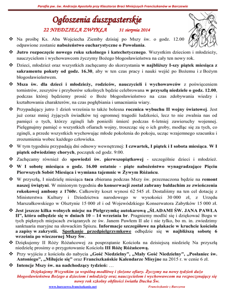 Parafia pw. św. Andrzeja Apostoła przy Klasztorze Braci Mniejszych Franciszkanów w Barczewie O g ł o s z e n ia d u s z p a s t e r s k ie 22 NIEDZIELA ZWYKŁA 31 sierpnia 2014 Na prośbę Ks. Aba Wojciecha Ziemby dzisiaj po Mszy św. o godz. 12.00 odpawione zostanie nabożeństwo eucharystyczne o Powołania. Jutro rozpoczęcie nowego roku szkolnego i katechetycznego. Wszystkim dzieciom i młodzieży, nauczycielom i wychowawcom życzymy Bożego błogosławieństwa na cały ten nowy rok. Dzieci, młodzież oraz wszystkich zachęcamy do skorzystania w najbliższy I-szy piątek miesiąca z sakramentu pokuty od godz. 16.30, aby w ten czas pracy i nauki wejść po Bożemu i z Bożym błogosławieństwem. Msza św. dla dzieci i młodzieży, rodziców, nauczycieli i wychowawców z poświęceniem tornistrów, zeszytów i przyborów szkolnych będzie celebrowana w przyszłą niedziele o godz. 12.00, podczas której będziemy prosić o Boże błogosławieństwo na czas zdobywania wiedzy i kształtowania charakterów, na czas pogłębiania i umacniania wiary. Przypadający jutro 1 dzień września to także bolesna rocznica wybuchu II wojny światowej. Jest już coraz mniej żyjących świadków tej ogromnej tragedii ludzkości, lecz to nie zwalnia nas od pamięci o tych, którzy zginęli lub ponieśli śmierć podczas 6-letniej zawieruchy wojennej. Pielęgnujmy pamięć o wszystkich ofiarach wojny, troszcząc się o ich groby, modląc się za tych, co zginęli, a przede wszystkich wychowując młode pokolenia do pokoju, ucząc wzajemnego szacunku i zrozumienia wobec każdego człowieka. W tym tygodniu przypadają dni odnowy wewnętrznej: I czwartek, I piątek i I sobota miesiąca. W I piątek odwiedzimy chorych, początek od godz. 9:00. Zachęcamy również do spowiedzi św. pierwszopiątkowej - szczególnie dzieci i młodzież. W I sobotę miesiąca o godz. 16.00 ostatnie - piąte nabożeństwo wynagradzające Pięciu Pierwszych Sobót Miesiąca i wymiana tajemnic w Żywym Różańcu. W przyszłą, I niedzielę miesiąca taca zbierana podczas Mszy św. przeznaczona będzie na remont naszej świątyni. W minionym tygodniu do konserwacji został zabrany baldachim ze zwieńczenia rokokowej ambony z 1760r. Całkowity koszt wynosi 62 545 zł. Dostaliśmy na ten cel dotację z Ministerstwa Kultury i Dziedzictwa narodowego w wysokości 30 000 zł, z Urzędu Marszałkowskiego w Olsztynie 15 000 zł i od Wojewódzkiego Konserwatora Zabytków 15 000 zł. Jest jeszcze kilka wolnych miejsc na Pielgrzymkę autokarową „ŚLADAMI ŚW. JANA PAWŁA II”, która odbędzie się w dniach 10 – 14 września br. Pragniemy modlić się i dziękować Bogu w tych pięknych miejscach związanych ze św. Janem Pawłem II ale i nie tylko, bo m. in. zwiedzimy sanktuaria maryjne na słowackim Spiszu. Informacje szczegółowe na plakacie w kruchcie kościoła a zapisy w zakrystii. Spotkanie przedpielgrzymkowe odbędzie się w najbliższą sobotę 6 września po wieczornej Mszy Św. Dziękujemy II Róży Różańcowej za posprzątanie Kościoła na dzisiejszą niedzielę Na przyszłą niedzielę prosimy o przygotowanie Kościoła III Różę Różańcową. Przy wyjściu z kościoła do nabycia „Gość Niedzielny”, „Mały Gość Niedzielny”, „Posłaniec św. Antoniego”, „Miłujcie się” oraz Franciszkańskie Kalendarze Misyjne na 2015 r. w cenie 6 zł. Intencje Mszy św. na nadchodzący tydzień: … Dziękujemy Wszystkim za wspólną modlitwę i złożone ofiary. Życzymy na nowy tydzień dużo błogosławieństwa Bożego a dzieciom i młodzieży oraz nauczycielom i wychowawcom na rozpoczynający się nowy rok szkolny obfitości światła Ducha Św. www.barczewo.franciszkanie.net Franciszkanie z Barczewa