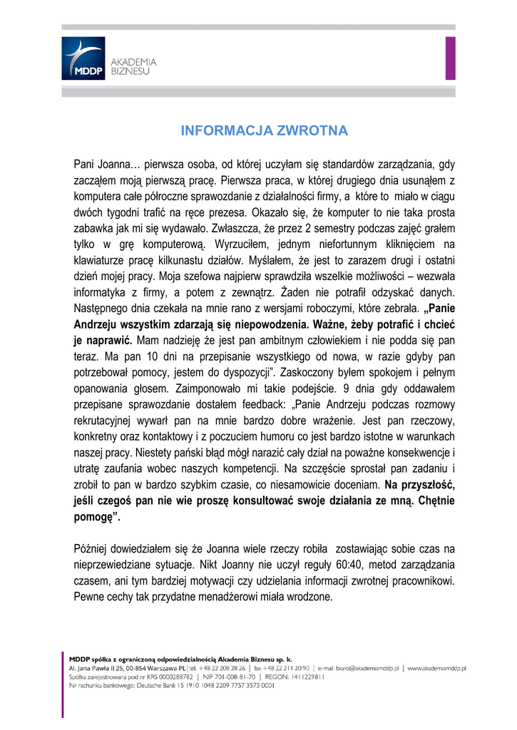 INFORMACJA ZWROTNA Pani Joanna… pierwsza osoba, od której uczyłam się standardów zarządzania, gdy zacząłem moją pierwszą pracę. Pierwsza praca, w której drugiego dnia usunąłem z komputera całe półroczne sprawozdanie z działalności firmy, a które to miało w ciągu dwóch tygodni trafić na ręce prezesa. Okazało się, że komputer to nie taka prosta zabawka jak mi się wydawało. Zwłaszcza, że przez 2 semestry podczas zajęć grałem tylko w grę komputerową. Wyrzuciłem, jednym niefortunnym kliknięciem na klawiaturze pracę kilkunastu działów. Myślałem, że jest to zarazem drugi i ostatni dzień mojej pracy. Moja szefowa najpierw sprawdziła wszelkie możliwości – wezwała informatyka z firmy, a potem z zewnątrz. Żaden nie potrafił odzyskać danych. Następnego dnia czekała na mnie rano z wersjami roboczymi, które zebrała. „Panie Andrzeju wszystkim zdarzają się niepowodzenia. Ważne, żeby potrafić i chcieć je naprawić. Mam nadzieję że jest pan ambitnym człowiekiem i nie podda się pan teraz. Ma pan 10 dni na przepisanie wszystkiego od nowa, w razie gdyby pan potrzebował pomocy, jestem do dyspozycji”. Zaskoczony byłem spokojem i pełnym opanowania głosem. Zaimponowało mi takie podejście. 9 dnia gdy oddawałem przepisane sprawozdanie dostałem feedback: „Panie Andrzeju podczas rozmowy rekrutacyjnej wywarł pan na mnie bardzo dobre wrażenie. Jest pan rzeczowy, konkretny oraz kontaktowy i z poczuciem humoru co jest bardzo istotne w warunkach naszej pracy. Niestety pański błąd mógł narazić cały dział na poważne konsekwencje i utratę zaufania wobec naszych kompetencji. Na szczęście sprostał pan zadaniu i zrobił to pan w bardzo szybkim czasie, co niesamowicie doceniam. Na przyszłość, jeśli czegoś pan nie wie proszę konsultować swoje działania ze mną. Chętnie pomogę”. Później dowiedziałem się że Joanna wiele rzeczy robiła zostawiając sobie czas na nieprzewiedziane sytuacje. Nikt Joanny nie uczył reguły 60:40, metod zarządzania czasem, ani tym bardziej motywacji czy udzielania informacji zwrotnej pracownikowi. Pewne cechy tak przydatne menadżerowi miała wrodzone. Teraz prowadzę szkolenia z udzielania informacji zwrotnej. W jednym z projektów, moim zadaniem było jeździć z menadżerami i sprawdzać jak umiejętności nabyte podczas szkolenia wdrażane są w codziennej pracy. Przed spotkaniem z pracownikiem ustaliliśmy jeszcze raz schemat rozmowy. Najprostsza metoda kanapki to krytyka podana w sposób łatwy do przyjęcia przez pracownika. Informacje niewygodne, wymagające poprawy, powiedziane są w środku rozmowy. Pozytywny początek i koniec sprawiają, że pracownik czuje się doceniony. Pracownik przyzwyczajony był do modelu rozmowy stosowanej dotychczas: negatyw – negatyw – „kiedy to w końcu zrozumiesz” – plan naprawczy. Był więc mocno zaskoczony gdy usłyszał od menadżera: „Zauważam pozytywne zmiany w twoich działaniach...” . Obserwowałem na początek zaskoczenie, a na koniec rozmowy uśmiech zadowolenia z tak przekazanej informacji. Niestety uśmiechnięty pracownik podczas rozmowy oceniającej był również zaskoczeniem dla menadżera, z czym ten sobie nie poradził. Rozmowa na koniec wyglądała więc następująco: „Praca, którą wykonałeś nad tym klientem podobała mi się. To wymagający klient, a jednak tobie się udało.” I tu właśnie pojawił się uśmiech pierwszy raz docenionego za działanie pracownika. Kilka sekund ciszy. U pracownika wzrasta poczucie wartości u menadżera poczucie spadku autorytetu twardziela. Przerywa, więc tę krótką aczkolwiek błogą chwilę: „Tak udało się. Ale … do pewnego momentu. Bo jak można było nie zaproponować jeszcze tego jak miałeś go już w garści!” Po czym przyjął swoją naturalną postawę i kontynuował rozmowę wg sprawdzonego przez siebie schematu. Nic nie wnoszącą oprócz własnej satysfakcji.