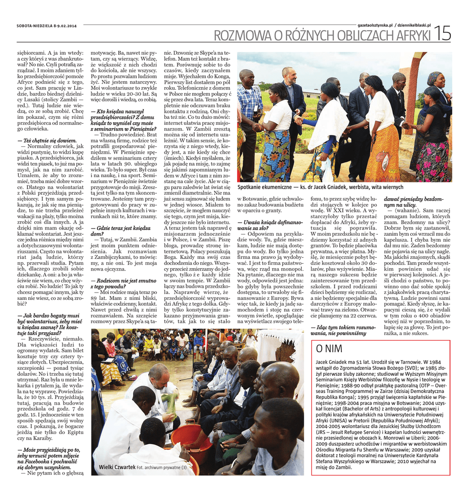 ROZMOWA O RÓŻNYCH OBLICZACH AFRYKI 15 gazetaolsztynska.pl / dziennikelblaski.pl SOBOTA-NIEDZIELA 8-9.02.2014 siębiorcami. A ja im wtedy: a czy któryś z was zbankrutował? No nie. Czyli potrafią zarządzać. I moim zdaniem tylko przedsiębiorczość pomoże Afryce podnieść się z tego, co jest. Sam pracuję w Lindzie, bardzo biednej dzielnicy Lusaki (stolicy Zambii — red.). Tutaj ludzie nie wiedzą, co ze sobą zrobić. Chcę im pokazać, czym się różni przedsiębiorca od normalnego człowieka. — Też chętnie się dowiem. — Normalny człowiek, jak widzi pustynię, to widzi kupę piasku. A przedsiębiorca, jak widzi ten piasek, to już ma pomysł, jak na nim zarobić. Uznałem, że aby to zrozumieć, trzeba mieć dobre wzorce. Dlatego na wolontariat z Polski przyjeżdżają przedsiębiorcy. I tym samym pokazują, że jak się ma pieniądze, to nie trzeba przeleżeć wakacji na plaży, tylko można zrobić coś dla innych. A ja dzięki nim mam okazję odkłamać wolontariat. Jest jeszcze jedna różnica między nimi a dotychczasowymi wolontariuszami. Często na wolontariat jadą ludzie, którzy np. przerwali studia. Pytam ich, dlaczego zrobili sobie dziekankę. A oni: a bo ja właściwie nie wiem, co chcę wżyciu robić. No ludzie! To jak ty chcesz pomagać innym, jak ty sam nie wiesz, co ze sobą zrobić? — Jak bardzo bogaty musi być wolontariusz, żeby mieć u księdza szansę? Ile kosztuje taki przyjazd? — Rzeczywiście, niemało. Dla większości ludzi to ogromny wydatek. Sam bilet kosztuje trzy czy cztery tysiące złotych. Ubezpieczenia, szczepionki — ponad tysiąc dolarów. No i trzeba się tutaj utrzymać. Raz była u mnie lekarka i pytałem ją, ile wydała na tę wyprawę. Powiedziała, że 10 tys. zł. Przyjeżdżają tutaj, pracują na budowie przedszkola od godz. 7 do godz. 15. I jednocześnie w ten sposób spędzają swój wolny czas. I pokazują, że bogacze jeżdżą nie tylko do Egiptu czy na Karaiby. — Może przyjeżdżają po to, żeby wrzucić potem zdjęcie na Facebooka i pochwalić się dobrym uczynkiem. — Nie pytam ich o głębszą motywację. Ba, nawet nie pytam, czy są wierzący. Widzę, że większość z nich chodzi do kościoła, ale nie wszyscy. Po prostu pozwalam ludziom żyć. Nie jestem natarczywy. Moi wolontariusze to zwykle ludzie w wieku 20-30 lat. Są więc dorośli i wiedzą, co robią. — Kto księdza nauczył przedsiębiorczości? Z domu ksiądz to wyniósł czy może z seminarium w Pieniężnie? — Trudno powiedzieć. Brat ma własną firmę, rodzice też potrafili gospodarować pieniędzmi. W Pieniężnie spędziłem w seminarium cztery lata w latach 90. ubiegłego wieku. To było super. Był czas i na naukę, i na sport. Seminarium w Pieniężnie świetnie przygotowuje do misji. Zresztą jest tylko na tym skoncentrowane. Jesteśmy tam przygotowywani do pracy w zupełnie innych kulturach i warunkach niż te, które znamy. — Gdzie teraz jest księdza dom? — Tutaj, w Zambii. Zambia jest moim punktem odniesienia. Jak rozmawiam z Zambijczykami, to mówię: my, a nie oni. To jest moja nowa ojczyzna. — Rodzicom nie jest smutno z tego powodu? — Moi rodzice mają teraz po 89 lat. Mam z nimi bliski, właściwie codzienny, kontakt. Nawet przed chwilą z nimi rozmawiałem. Na szczęście rozmowy przez Skype’a są ta- nie. Dzwonię ze Skype’a na telefon. Mam też kontakt z bratem. Porównuję sobie to do czasów, kiedy zaczynałem misje. Wyjechałem do Konga, Pierwszy list dostałem po pół roku. Telefonicznie z domem w Polsce nie mogłem połączy ć się przez dwa lata. Teraz kompletnie nie odczuwam braku kontaktu z rodziną. Oni chyba też nie. Co tu dużo mówić: internet ułatwia pracę misjonarzom. W Zambii zresztą można się od internetu uzależnić. W takim sensie, że korzysta się z niego wtedy, kiedy jest, a nie kiedy się chce (śmiech). Kiedyś myślałem, że jak pojadę na misję, to zajmę się jakimś zapomnianym ludem w Afryce i tam z nim zostanę na całe życie. Ale w ciągu paru zaledwie lat świat się zmienił diametralnie. Nie ma już sensu zajmować się ludem w jednej wiosce. Miałem to szczęście, że mogłem nauczyć się tego, czym jest misja, kiedy jeszcze nie było internetu. A teraz jestem tak naprawd ę misjonarzem jednocześnie i w Polsce, i w Zambii. Piszę bloga, prowadzę stronę internetową. Polacy poszukują Boga. Każdy ma swój czas dochodzenia do niego. Wszyscy przecież zmierzamy do jednego, tylko ż e każdy idzie w swoim tempie. W Zambii łączy nas budowa przedszkola. Naprawdę wierzę, że przedsiębiorczość wyprowadzi Afrykę z tego dołka. Gdyby tylko konstytucyjnie zakazano przyjmowania grantów, tak jak to się stało Spotkanie ekumeniczne — ks. dr Jacek Gniadek, werbista, wita wiernych w Botswanie, gdzie uchwalono zakaz budowania budżetu w oparciu o granty. — Uważa ksiądz dofinansowanie za zło? — Odpowiem na przykładzie wody. Tu, gdzie mieszkam, ludzie nie mają dostępu do wody. Bo tylko jedna firma ma prawo ją wydobywać. I jest to firma państwowa, więc rząd ma monopol. Na pytanie, dlaczego nie ma wody, odpowiedź jest jedna: bo gdyby była powszechnie dostępna, to urwałoby się finansowanie z Europy. Bywa więc tak, że kiedy ja jadę samochodem i stoję na czerwonym świetle, spoglądając na wyświetlacz swojego tele- fonu, to przez szybę widzę ludzi stojących w kolejce po wodę. W XXI wieku. A wystarczyłoby tylko przestać dopłacać do Afryki, żeby sytuacja się poprawiła. W moim przedszkolu nie bę dziemy korzystać zż adnych grantów. To będzie placówka prywatna, a więc płatna. Myślę, że miesięcznie pobyt będzie kosztował około 30 dolarów, plus wyżywienie. Miarą naszego sukcesu będzie zainteresowanie tym przedszkolem. I przed rodzicami dzieci będziemy się rozliczać, a nie będziemy specjalnie dla darczyńców z Europy malować trawy na zielono. Otwarcie planujemy na 22 czerwca. — Idąc tym tokiem rozumowani