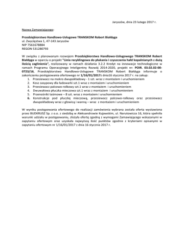 Jaryszów, dnia 23 lutego 2017 r. Nazwa Zamawiającego: Przedsiębiorstwo Handlowo-Usługowe TRANSKOM Robert Białdyga ul. Zwycięstwa 1, 47-143 Jaryszów NIP 7561678884 REGON 531280793 W związku z planowanym rozwojem Przedsiębiorstwa Handlowo-Usługowego TRANSKOM Robert Białdyga w oparciu o projekt "Linia recyklingowa do płukania i czyszczenia hałd kopalnianych z dużą ilością zaglinienia", realizowany w ramach działania 3.2.2 Kredyt na innowacje technologiczne w ramach Programu Operacyjnego Inteligentny Rozwój 2014-2020, projekt nr: POIR. 03.02.02-000723/16, Przedsiębiorstwo Handlowo-Usługowe TRANSKOM Robert Białdyga informuje o zakończeniu postępowania ofertowego nr 1/16/01/2017z dnia16 stycznia 2017 r. na zakup: 1. Przesiewacz na mokro dwupokładowy - 1 szt. wraz z montażem i uruchomieniem 2. Kosz zasypowy dla ładowarki szt.1 wraz z montażem i uruchomieniem 3. Przesiewacz palcowo-rolkowy szt.1 wraz z montażem i uruchomieniem 4. Dwuwałowa płuczka mieczowa szt.1 wraz z montażem i uruchomieniem 5. Przenośniki taśmowe – 8 szt. wraz z montażem i uruchomieniem 6. Konstrukcje pod płuczkę mieczową, przesiewacz palcowo-rolkowy oraz przesiewacz dwupokładowy wraz z głowicą i wanną – wraz z montażem i uruchomieniem W wyniku postępowania ofertowego do realizacji zamówienia wybrana została oferta wystawiona przez BUDKRUSZ Sp. z o.o. z siedzibą w Aleksandrowie Kujawskim, ul. Narutowicza 16, która spełniła warunki udziału w postępowaniu, złożyła ofertę zgodną z wymogami Zamawiającego wskazanymi w zapytaniu ofertowym oraz uzyskała najwyższą ilość punktów zgodnie z kryteriami opisanymi w zapytaniu ofertowym nr 1/16/01/2017 z dnia 16 stycznia 2017 r.