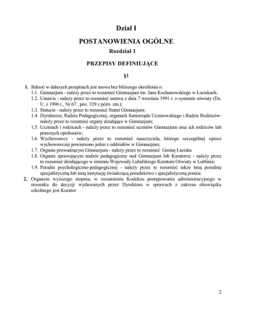 Dział I POSTANOWIENIA OGÓLNE Rozdział 1 PRZEPISY DEFINIUJĄCE §1 1. Ilekroć w dalszych przepisach jest mowa bez bliższego określenia o: 1.1. Gimnazjum - należy przez to rozumieć Gimnazjum im. Jana Kochanowskiego w Łaziskach; 1.2. Ustawie - należy przez to rozumieć ustawę z dnia 7 września 1991 r. o systemie oświaty (Dz. U. z 1996 r., Nr 67 , póz. 329 z późn. zm.); 1.3. Statucie - należy przez to rozumieć Statut Gimnazjum; 1.4. Dyrektorze, Radzie Pedagogicznej, organach Samorządu Uczniowskiego i Radzie Rodzicównależy przez to rozumieć organy działające w Gimnazjum; 1.5. Uczniach i rodzicach - należy przez to rozumieć uczniów Gimnazjum oraz ich rodziców lub prawnych opiekunów; 1.6. Wychowawcy - należy przez to rozumieć nauczyciela, którego szczególnej opiece wychowawczej powierzono jeden z oddziałów w Gimnazjum; 1.7. Organie prowadzącym Gimnazjum - należy przez to rozumieć Gminę Łaziska 1.8. Organie sprawującym nadzór pedagogiczny nad Gimnazjum lub Kuratorze - należy przez to rozumieć działającego w imieniu Wojewody Lubelskiego Kuratora Oświaty w Lublinie; 1.9. Poradni psychologiczno-pedagogicznej - należy przez to rozumieć także inną poradnię specjalistyczną lub inną instytucję świadczącą poradnictwo i specjalistyczną pomoc. 2. Organem wyższego stopnia, w rozumieniu Kodeksu postępowania administracyjnego w stosunku do decyzji wydawanych przez Dyrektora w sprawach z zakresu obowiązku szkolnego jest Kurator 2 Rozdział 2 PODSTAWOWE INFORMACJE O GIMNAZJUM §2 1. Gimnazjum im. Jana Kochanowskiego w Łaziskach jest szkołą publiczną. 2. Siedziba Gimnazjum znajduje się w budynku położonym w Łaziskach na działce nr 447. 3. Obwód Gimnazjum obejmuje teren gminy Łaziska. §3 1. Ustalona nazwa Gimnazjum im. Jana Kochanowskiego w Łaziskach używana jest przez Gimnazjum w pełnym brzmieniu. 2. Na pieczęciach i stemplach może być używany czytelny skrót nazwy. §4 1. Gimnazjum może mieć: patrona, własny hymn, sztandar, godło i ceremoniał. §5 1. Czas trwania cyklu kształcenia w Gimnazjum wynosi 3 lata. 2. Gimnazjum może prowadzić oddział sportowy, oddział dwujęzyczny oraz integracyjny. 2.1. Gimnazjum zapewnia możliwość korzystania z: a) Biblioteki; b) Świetlicy; c) Sali gimnastycznej; d) Pracowni komputerowej; e) Siłowni. §6 1. Zasady i tryb postępowania w sprawie spełniania obowiązku szkolnego określają odrębne przepisy. 2. Na zasadach określonych w ustawie Dyrektor może zezwolić uczniowi na indywidualny tok lub program nauki albo na spełnianie obowiązku szkolnego poza Gimnazjum, pod warunkiem składania przez ucznia egzaminów klasyfikacyjnych. §7 1. Na zasadach określonych w ustawie w Gimnazjum mogą działać stowarzyszenia i organizacje z wyjątkiem partii i organizacji politycznych. 2. Zasady funkcjonowania w Gimnazjum związków zawodowych regulują odrębne przepisy. §8 1. Gimnazjum jest jednostką budżetową. 2. W Gimnazjum mogą być tworzone środki specjalne. 3 3. Szczegółowe zasady gospodarki finansowej Gimnazjum regulują odrębne przepisy. §9 1. Gimnazjum używa pieczęci urzędowej, zgodnie z odrębnymi przepisami. 2. Gimnazjum prowadzi i przechowuje dokumentację na zasadach określonych w odrębnych przepisach. § 10 1. Zasady wydawania oraz wzory świadectw i innych druków szkolnych, sposób dokonywania ich sprostowań i wydawania duplikatów oraz zasady odpłatności za te czynności określają odrębne przepisy. 4 Rozdział 3 CELE I ZADANIA GIMNAZJUM § 11 1. Gimnazjum realizuje cele i zadania określone w ustawie oraz przepisach wydanych na jej podstawie, koncentrując się na prowadzeniu działalności dydaktycznej, wychowawczej oraz opiekuńczej. 2. Gimnazjum stwarza warunki do komplementarnego rozwoju uczniów, uwzględniając ich indywidualne zainteresowania i potrzeby, a także ich możliwości psychofizyczne. 3. Gimnazjum spełnia funkcję: kształcącą, wychowawczą, opiekuńczą, kompensacyjną i kulturalną, tworząc warunki do wielostronnego tj. intelektualnego, emocjonalnego, moralno-społecznego, estetycznego i fizycznego rozwoju ucznia. 4. Gimnazjum zapewnia uczniom pełny rozwój umysłowy, moralno-emocjonalny, fizyczny w zgodzie z ich potrzebami i możliwościami psychofizycznymi w warunkach poszanowania ich godności osobistej oraz wolności światopoglądowej i wyznaniowej. 5. W realizacji tego zadania gimnazjum respektuje zasady nauk pedagogiczno-psychologicznych, przepisy prawa, a także zobowiązania wynikające z Powszechnej Deklaracji Praw Człowieka ONZ, Deklaracji Praw Dziecka ONZ oraz Konwencji Praw Dziecka przyjęte przez zgromadzenie Ogólne ONZ 20 listopada 1989r. 6. Celem gimnazjum jest: 6.1 Kształcenie i wychowanie dzieci oraz przygotowanie do nauki w szkołach ponadgimnazjalnych i do życia we współczesnym świecie, 6.2 Zapewnienie niezbędnych warunków do rozwoju intelektualnego, emocjonalnego, duchowego i fizycznego, 6.3 Rozwijanie u uczniów poczucia odpowiedzialności, miłości do Ojczyzny oraz poszanowania dla polskiego dziedzictwa kulturowego, 6.4 Kształcenie i wychowanie w duchu tolerancji, humanizmu i patriotyzmu, przekazywanie wiedzy o społeczeństwie, o problemach społecznych, ekonomicznych kraju, świata, kulturze i środowisku naturalnym. § 12 1. Gimnazjum organizuje naukę religii oraz zajęcia o tematyce etyczno-moralnej w wymiarze określonym odrębnymi przepisami. § 13 1. Rodzice i nauczyciele, na zasadach określonych w Statucie, współdziałają ze sobą w sprawach wychowywania i kształcenia dzieci oraz mają prawo do: 1.1 Znajomości zadań i zamierzeń dydaktyczno-wychowawczych w danej klasie i szkole; 1.2 Znajomości przepisów dotyczących oceniania, klasyfikowania i promowania uczniów oraz przeprowadzania egzaminów; 1.3 Uzyskiwania w każdym okresie rzetelnej informacji na temat swojego dziecka, jego zachowania, postępów i przyczyn trudności w nauce; 5 1.4 Uzyskiwania informacji i porad w sprawach