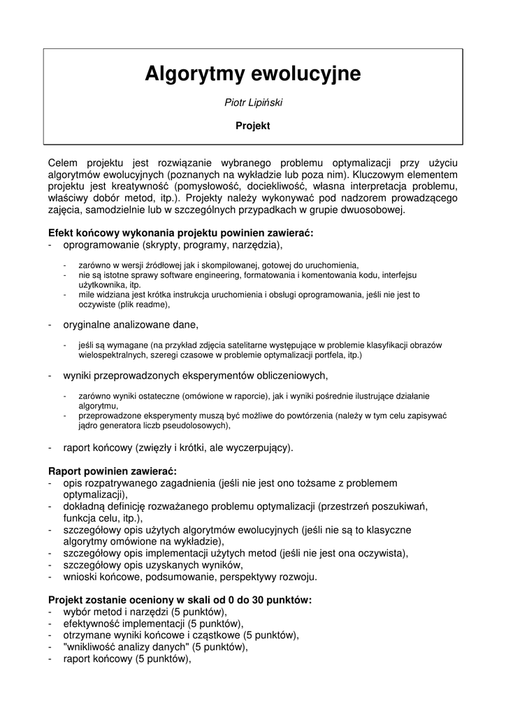 Algorytmy ewolucyjne Piotr Lipiński Projekt Celem projektu jest rozwiązanie wybranego problemu optymalizacji przy użyciu algorytmów ewolucyjnych (poznanych na wykładzie lub poza nim). Kluczowym elementem projektu jest kreatywność (pomysłowość, dociekliwość, własna interpretacja problemu, właściwy dobór metod, itp.). Projekty należy wykonywać pod nadzorem prowadzącego zajęcia, samodzielnie lub w szczególnych przypadkach w grupie dwuosobowej. Efekt końcowy wykonania projektu powinien zawierać: - oprogramowanie (skrypty, programy, narzędzia), - - oryginalne analizowane dane, - - jeśli są wymagane (na przykład zdjęcia satelitarne występujące w problemie klasyfikacji obrazów wielospektralnych, szeregi czasowe w problemie optymalizacji portfela, itp.) wyniki przeprowadzonych eksperymentów obliczeniowych, - - zarówno w wersji źródłowej jak i skompilowanej, gotowej do uruchomienia, nie są istotne sprawy software engineering, formatowania i komentowania kodu, interfejsu użytkownika, itp. mile widziana jest krótka instrukcja uruchomienia i obsługi oprogramowania, jeśli nie jest to oczywiste (plik readme), zarówno wyniki ostateczne (omówione w raporcie), jak i wyniki pośrednie ilustrujące działanie algorytmu, przeprowadzone eksperymenty muszą być możliwe do powtórzenia (należy w tym celu zapisywać jądro generatora liczb pseudolosowych), raport końcowy (zwięzły i krótki, ale wyczerpujący). Raport powinien zawierać: - opis rozpatrywanego zagadnienia (jeśli nie jest ono tożsame z problemem optymalizacji), - dokładną definicję rozważanego problemu optymalizacji (przestrzeń poszukiwań, funkcja celu, itp.), - szczegółowy opis użytych algorytmów ewolucyjnych (jeśli nie są to klasyczne algorytmy omówione na wykładzie), - szczegółowy opis implementacji użytych metod (jeśli nie jest ona oczywista), - szczegółowy opis uzyskanych wyników, - wnioski końcowe, podsumowanie, perspektywy rozwoju. Projekt zostanie oceniony w skali od 0 do 30 punktów: - wybór metod i narzędzi (5 punktów), - efektywność implementacji (5 punktów), - otrzymane wyniki końcowe i cząstkowe (5 punktów), - "wnikliwość analizy danych" (5 punktów), - raport końcowy (5 punktów), - całokształt rozwiązania problemu (5 punktów). Terminy: - ustalenie tematu projektu: 19 maja (zgłoszenie emailem lub osobiście w czasie zajęć), - przedstawienie podejścia do problemu i ewentualnie pierwszych wyników cząstkowych: do 4 czerwca (na zajęciach, konsultacjach lub w innym ustalonym terminie), - przedstawienie końcowej wersji projektu: do końca semestru (na zajęciach, konsultacjach lub w innym ustalonym terminie). Konsultacje, pytania, inne ustalenia z prowadzącym zajęcia – cały czas, osobiście lub emailem. Proponowane tematy projektów (po szczegółowe informacje proszę indywidualnie kontaktować się z prowadzącym zajęcia): - klasyfikacja wielospektralnych zdjęć satelitarnych (tym razem dla pełnego zdjęcia i wszystkich klas - będzie dużo trudniej niż w uproszczonym problemie na liście zadań), Inverse Kinematics z dynamicznymi przeszkodami, optymalizacja portfela papierów wartościowych, Dynamic TSP, MultiObjective TSP, ciekawe problemy kombinatoryczne NP-zupełne (po ustaleniu z prowadzącym zajęcia co jest ciekawe a co nie), inne po uzgodnieniu z prowadzącym zajęcia (ciekawe pomysły mile widziane).