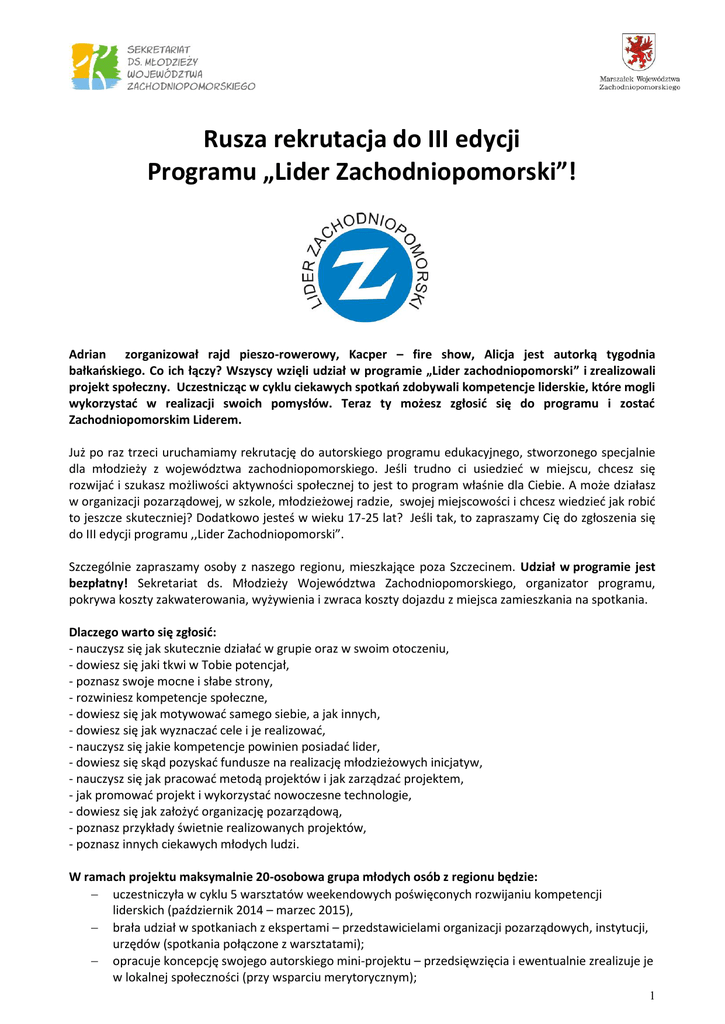 Rusza rekrutacja do III edycji Programu „Lider Zachodniopomorski”! Adrian zorganizował rajd pieszo-rowerowy, Kacper – fire show, Alicja jest autorką tygodnia bałkańskiego. Co ich łączy? Wszyscy wzięli udział w programie „Lider zachodniopomorski” i zrealizowali projekt społeczny. Uczestnicząc w cyklu ciekawych spotkań zdobywali kompetencje liderskie, które mogli wykorzystać w realizacji swoich pomysłów. Teraz ty możesz zgłosić się do programu i zostać Zachodniopomorskim Liderem. Już po raz trzeci uruchamiamy rekrutację do autorskiego programu edukacyjnego, stworzonego specjalnie dla młodzieży z województwa zachodniopomorskiego. Jeśli trudno ci usiedzieć w miejscu, chcesz się rozwijać i szukasz możliwości aktywności społecznej to jest to program właśnie dla Ciebie. A może działasz w organizacji pozarządowej, w szkole, młodzieżowej radzie, swojej miejscowości i chcesz wiedzieć jak robić to jeszcze skuteczniej? Dodatkowo jesteś w wieku 17-25 lat? Jeśli tak, to zapraszamy Cię do zgłoszenia się do III edycji programu ,,Lider Zachodniopomorski”. Szczególnie zapraszamy osoby z naszego regionu, mieszkające poza Szczecinem. Udział w programie jest bezpłatny! Sekretariat ds. Młodzieży Województwa Zachodniopomorskiego, organizator programu, pokrywa koszty zakwaterowania, wyżywienia i zwraca koszty dojazdu z miejsca zamieszkania na spotkania. Dlaczego warto się zgłosić: - nauczysz się jak skutecznie działać w grupie oraz w swoim otoczeniu, - dowiesz się jaki tkwi w Tobie potencjał, - poznasz swoje mocne i słabe strony, - rozwiniesz kompetencje społeczne, - dowiesz się jak motywować samego siebie, a jak innych, - dowiesz się jak wyznaczać cele i je realizować, - nauczysz się jakie kompetencje powinien posiadać lider, - dowiesz się skąd pozyskać fundusze na realizację młodzieżowych inicjatyw, - nauczysz się jak pracować metodą projektów i jak zarządzać projektem, - jak promować projekt i wykorzystać nowoczesne technologie, - dowiesz się jak założyć organizację pozarządową, - poznasz przykłady świetnie realizowanych projektów, - poznasz innych ciekawych młodych ludzi. W ramach projektu maksymalnie 20-osobowa grupa młodych osób z regionu będzie: uczestniczyła w cyklu 5 warsztatów weekendowych poświęconych rozwijaniu kompetencji liderskich (październik 2014 – marzec 2015), brała udział w spotkaniach z ekspertami – przedstawicielami organizacji pozarządowych, instytucji, urzędów (spotkania połączone z warsztatami); opracuje koncepcję swojego autorskiego mini-projektu – przedsięwzięcia i ewentualnie zrealizuje je w lokalnej społeczności (przy wsparciu merytorycznym); 1 stworzy grupę lokalnych liderów, której uczestnicy w trakcie i po zakończeniu programu będą zapraszani do działań lokalnych i międzynarodowych, w które zaangażowany jest Sekretariat ds. Młodzieży. Kogo poszukujemy, czyli profil uczestnika: wiek 17-25 lat, mieszka na terenie województwa zachodniopomorskiego, ma co najmniej minimalne doświadczenie w działaniach społecznych (np. w szkole, w młodzieżowej radzie, w organizacji pozarządowej, jako wolontariusz, w grupie nieformalnej), nie był uczestnikiem poprzednich edycji programu, ma motywację do zdobywania wiedzy i nowych umiejętności oraz do przeprowadzenia mini projektu w społeczności lokalnej. Pozostałe warunki udziału w programie: aktywne uczestnictwo we wszystkich spotkaniach projektowych (od października 2014 r. - do czerwca 2015), opracowanie oraz realizacja przy wsparciu merytorycznym koncepcji mini-projektu, pozostanie w stałym kontakcie z organizatorem programu - Sekretariatem ds. Młodzieży w trakcie trwania programu. Jak będzie wyglądała praca podczas programu: praca w małych grupach metodami aktywnymi dyskusje gry symulacyjne konsultacje z ekspertami Program trwa od października 2014 do czerwca 2015 r. i zakłada uczestnictwo w pięciu 2-3 dniowych spotkaniach. Spotkania programu będą się odbywały w wyznaczone piątki po południu, soboty i niedziele. Pierwsze spotkanie odbędzie się w dniach 24-26 października w Szczecinie. Formularz zgłoszeniowy do programu można znaleźć na stronie www.mlodziez.wzp.pl Chętnych prosimy o uprzednie zapoznanie się z harmonogramem programu, a następnie wysłanie wypełnionego formularza zgłoszeniowego do dnia 5 października na adres [email protected] Potrzebujesz informacji? Dzwoń: 91 42 10 262 lup pisz: [email protected] Harmonogram spotkań Data 24-26 października 2014 21-22 listopada 2014 początek grudnia (termin będzie podany później) 16-18 stycznia 2015 6-7 lutego 2015 13-15 marca 2015 Miejsce Szczecin Czarnocin Szczecin Szczecin/Czarnocin Szczecin/Czarnocin Szczecin/Czarnocin Organizatorzy zastrzegają sobie możliwość zmiany w harmonogramie spotkań oraz zmiany miejsca spotkań. 2 Kto prowadzi spotkania - czyli nasi eksperci i trenerzy. Katarzyna Jurewicz – prezes Zarządu Towarzystwa Wspierania Inicjatyw Kulturalno-Społecznych. Od początku aktywności zawodowej związana z III sektorem, który traktuje jako idealne miejsce do pracy dla innych, rozwoju osobistego i zmieniania świata na lepsze. Autorka licznych projektów oraz kampanii społecznych, które realizuje i koordynuje od 2006 roku. Trenerka umiejętności miękkich, która z zamiłowania dzieli się wiedzą i sama stale dokształca. Obecnie pracuje również jako coach, bo coaching jest dla niej cennym uzupełnieniem narzędzi do pracy indywidualnej i grupowej. Michał Grześkowiak – Coach, Trener, Mówca, Kreator specjalizujący się w komunikacji, wielojęzyczności i wystąpieniach publicznych. Uwielbia oddziaływania edukacyjne w wielu formach: wsparcia indywidualnego jako Coach i Mentor, praktycznych warsztatów rozwojowych jako Trener oraz wystąpień inspiracyjnych jako Mówca. Wyznacznikiem sukcesu są dla niego Spokojny Umysł i Błysk w Oku. Od ponad pięciu lat pracuje z lud
