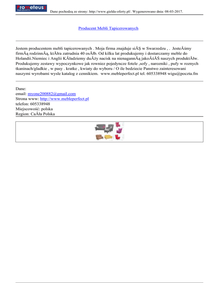 Dane pochodzą ze strony: http://www.gielda-oferty.pl/. Wygenerowano dnia: 08-03-2017. Producent Mebli Tapicerowanych Jestem producentem mebli tapicerowanych . Moja firma znajduje siĂŞ w Swarzedzu , . JesteÂśmy firmÂą rodzinnÂą, ktĂłra zatrudnia 40 osĂłb. Od kilku lat produkujemy i dostarczamy meble do Holandii.Niemiec i Anglii KÂładziemy duÂży nacisk na nienagannÂą jakoœÌ naszych produktĂłw. Produkujemy zestawy wypoczynkowe jak rowniez pojedyncze fotele ,sofy , narozniki , pufy w roznych tkaninach/gladkie , w pasy . kratke , kwiaty do wyboru / O ile bedziecie Panstwo zainteresowani naszymi wyrobami wysle katalog z cennikiem. www.mebleperfect.pl tel. 605338948 [email protected] Dane: email: [email protected] Strona www: http://www.mebleperfect.pl telefon: 605338948 Miejscowość: polska Region: CaÂła Polska