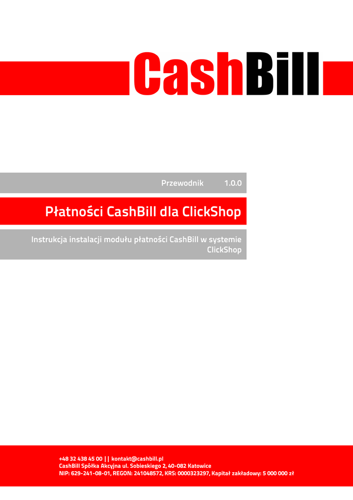 Przewodnik 1.0.0 Płatności CashBill dla ClickShop Instrukcja instalacji modułu płatności CashBill w systemie ClickShop +48 32 438 45 00 || [email protected] CashBill Spółka Akcyjna ul. Sobieskiego 2, 40-082 Katowice NIP: 629-241-08-01, REGON: 241048572, KRS: 0000323297, Kapitał zakładowy: 5 000 000 zł Płatności CashBill dla ClickShop Spis treści 1 Instalacja modułu........................................................................................................................... 3 2 Rejestracja i weryfikacja Sprzedawcy w CashBill........................................................................4 2.1 Uruchomienie Płatności CashBill............................................................................................. 4 3 Optymalizacja prowizji................................................................................................................... 6 4 Historia zmian................................................................................................................................. 8 2 Płatności CashBill dla ClickShop 1 Instalacja modułu W celu umożliwienia dokonywania płatności poprzez system CashBill należy zainstalować odpowiedni moduł zgodnie z poniższą instrukcją. Zaloguj się do Panelu Administratora Przejdź do Konfiguracja->Administracja,system->Administratorzy Dodaj nową grupę Administratorów z typem dostępu dostęp webapi Edytuj nowo stworzoną grupę i ustal uprawnienia Sprzedaż na odczyt, dodawanie, edycja Dodaj nowego Administratora ustalając opcję Grupa na wcześniej stworzoną Przejdz do Konfiguracja->Sprzedaż->Płatności Wybierz opcję dodaj nową płatność. Formularz wypełnij w poniższy sposób : Typ płatności: przelew Nazwa: Płatności CashBill Opis: Płatności internetowe przez CashBill Obsługiwane waluty : PLN Aktywność : Zaznacz Komunikat po złożeniu zamówienia <p><strong>Dziękujemy za złożenie zamówienia </strong><br /><br />Za chwilę otrzymasz e-mail z prośbą o jego potwierdzenie.<br /><br />Numer Twojego zamówienia: <strong>{order_id}</strong> <br />Całkowita wartość zakupów, wraz z kosztami wysyłki: <strong>{sum}</strong><br /><br /><strong>Aby opłacić zamówienie kliknij na poniższy przycisk:</strong></p> <form action="https://shop.cashbill.pl/shoper/" method="get"><input name="service" type="hidden" value="[ID Punktu Płatności]" /><input name="orderid" type="hidden" value="{order_id}" /><button class="important">Opłać zamówienie</button></form> <p><br /><br />O zmianie statusu będziemy Cię również informować pocztą elektroniczną.<br /><br />W razie jakichkolwiek pytań lub wątpliwości prosimy o kontakt <br />telefoniczny: {shop_phone} lub e- mailowy {shop_email}<br /><br />Pozdrawiamy,<br />Zespół Obsługi Sklepu {shop_name}<br /><br /></p> Instalacja modułu 3 Płatności CashBill dla ClickShop W komunikacie po złożeniu zamówienia podmień [ID Punktu Płatności] na Identyfikator Punktu Płatności Po zapisaniu kanału płatności należy przejść do Konfiguracja->Sprzedaż->Dostawa W wybranych metodach dostawy wybrać z listy Obsługiwane płatności Płatności CashBill Instalacja modułu 4 Płatności CashBill dla ClickShop 2 Rejestracja i weryfikacja Sprzedawcy w CashBill. Serwis CashBill dostępny jest pod adresem www.cashbill.pl Aby założyć konto kliknij „Rejestracja” i uzupełnij krótki formularz. Po potwierdzeniu adresu e-mail proszę, zgodnie z instrukcjami, uzupełnić dane konta i przeprowadzić jego weryfikację. Proces weryfikacji polega na wykonaniu przelewu bankowego według wskazówek zawartych w koncie CashBill. Po pozytywnej weryfikacji konta możesz przystąpić do uruchomienia Płatności CashBill. 2.1 Uruchomienie Płatności CashBill Pierwszym etapem uruchomienia Płatności Cashbill w sklepie internetowym ClickShop jest założenie Punktu Płatności w panelu administracyjnym CashBill. Każdy sklep internetowy powinien posiadać własny Punkt Płatności. W celu udostępnienia swoim Klientom możliwości wykonania dowolnej płatności za towary lub usługi w sklepie internetowym ClickShop, tworząc nowy Punkt Płatności należy wybrać opcję „Punkt Płatności Sklep Internetowy”. W formularzu zgłoszenia sklepu internetowego należy określić następujące parametry: Rodzaj interfejsu komunikacji: Prosty Formularz HTML Adres URL sklepu internetowego: adres głównej strony sklepu, prezentowany klientowi w procesie płatności Nazwa sklepu internetowego: nazwa sklepu prezentowana klientowi w procesie płatności Login API: Nazwa użytkownika do logowania z dostępem do grupy webapi w Twoim sklepie. Hasło API: Hasło do logowania dla użytkow nika z dostępem do webapi w Twoim sklepie. Rejestracja i weryfikacja Sprzedawcy w CashBill. 5 Płatności CashBill dla ClickShop Złożenie wniosku o uruchomienie usługi następuje poprzez przycisk „uruchom usługę”. Ze względu na wymogi nakładane przez instytucje nadzoru finansowego, każdorazowe uruchomienie nowego sklepu internetowego wymaga przeprowadzenia procesu weryfikacji. Proces przeprowadzany jest przez personel systemu CashBill po każdym zgłoszeniu nowego Punktu Płatności i zwykle trwa do jednego dnia roboczego. Do momentu zakończenia procesu weryfikacji punkt płatności działa jedynie w trybie testowym. Rejestracja i weryfikacja Sprzedawcy w CashBill. 6 Płatności CashBill dla ClickShop 3 Optymalizacja prowizji Ostatnim etapem uruchamiania sklepu internetowego w panelu administracyjnym CashBill jest określenie parametrów optymalizacji prowizji. Wiele kanałów płatności dostępnych jest w dwóch wariantach – natychmiastowym i klasycznym. Użycie kanałów natychmiastowych wiąże się z większymi prowizjami. Korzystając z zakładki „Kanały płatności” w konfiguracji nowo uruchamianego sklepu internetowego można określić, które z kanałów są udostępnione użytkownikowi sklepu. Dzięki optymalizacji prowizji można 