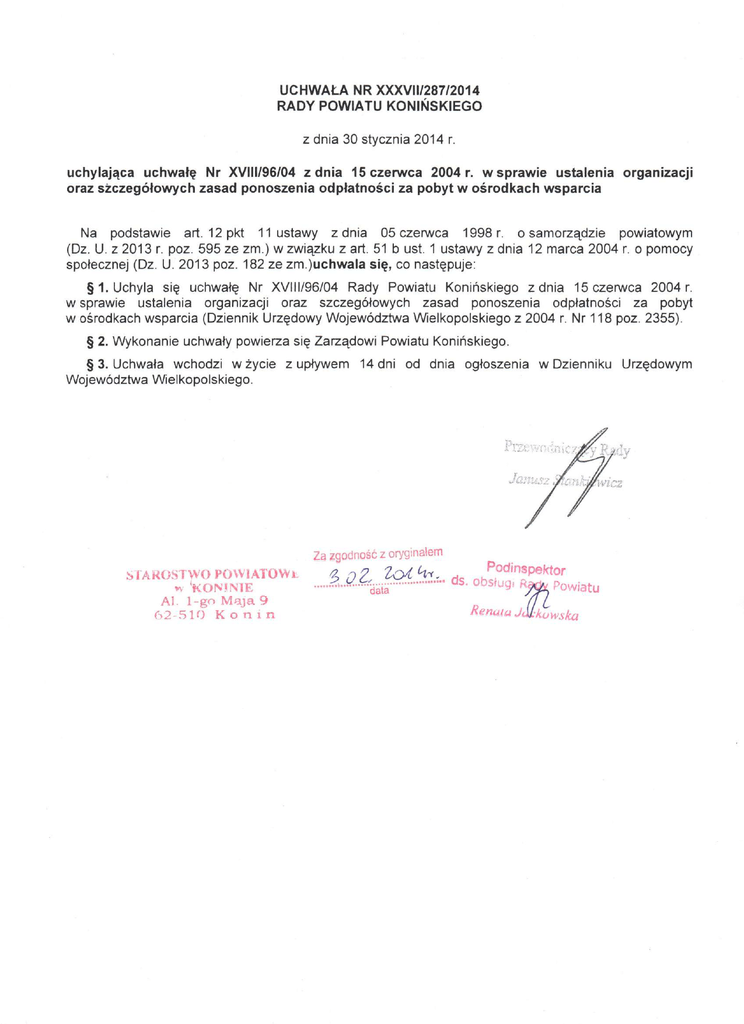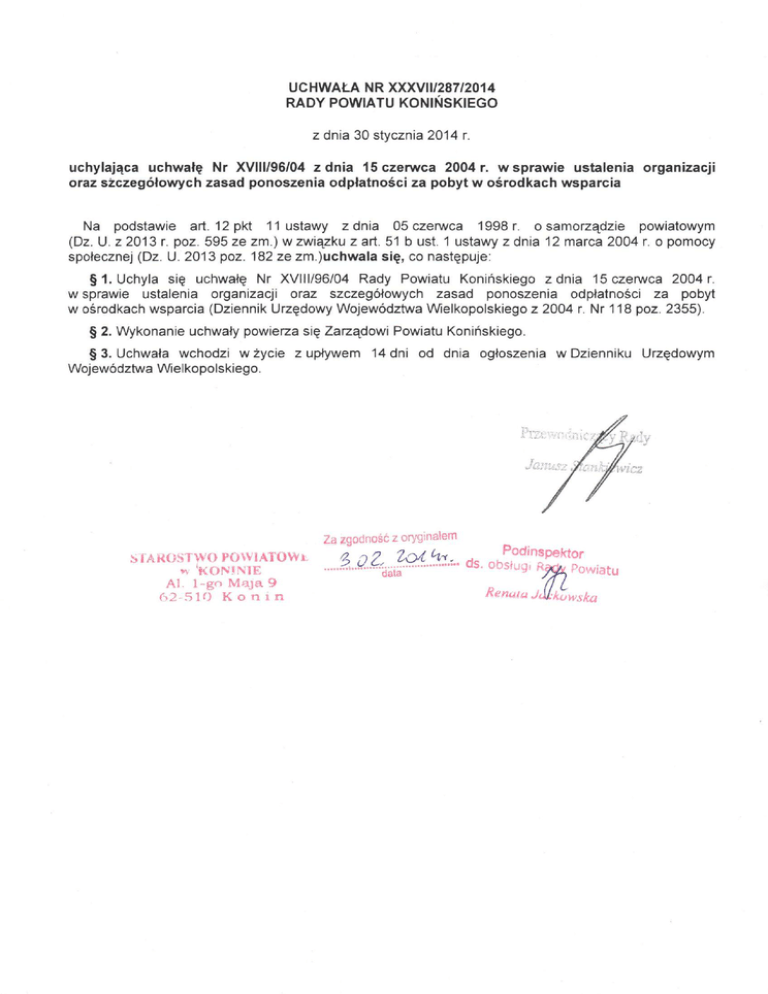 UCHWAŁA NR XXXVI 1/287/2014 RADY POWIATU KONIŃSKIEGO z dnia 30 stycznia 2014 r. uchylająca uchwałę Nr XVIII/96/04 z dnia 15 czerwca 2004 r. w sprawie ustalenia oraz szczegółowych zasad ponoszenia odpłatności za pobyt w o ś r o d k a c h wsparcia organizacji Na podstawie art. 12pkt 11 ustawy z dnia 05 czerwca 1998r. o samorządzie powiatowym (Dz. U. z 2013 r. poz. 595 ze zm.) w związku z art. 51 b ust. 1 ustawy z dnia 12 marca 2004 r. o pomocy społecznej (Dz. U. 2013 poz. 182 ze zm.juchwala się, co następuje: § 1 . U c l i y l a się uchwałę Nr XVIII/96/04 Rady Powiatu Konińskiego z dnia 15 czerwca 2004 r. w sprawie ustalenia organizacji oraz szczegółowych zasad ponoszenia odpłatności za pobyt w ośrodkach wsparcia (Dziennik Urzędowy Województwa Wielkopolskiego z 2004 r. Nr 118 poz. 2355). § 2. Wykonanie uchwały powierza się Zarządowi Powiatu Konińskiego. § 3. Uchwała wchodzi w ż y c i e z upływem 14 dni od dnia ogłoszenia w Dzienniku Województwa Wielkopolskiego. Za zgodność z oryginałem STAROSTWO POWIATÓW 11 rv 'KONINIE Al. 1-go Maja 9 62 5 1 0 K o n i n oZ. '^^..Z^..'... Podinspektor Urzędowym