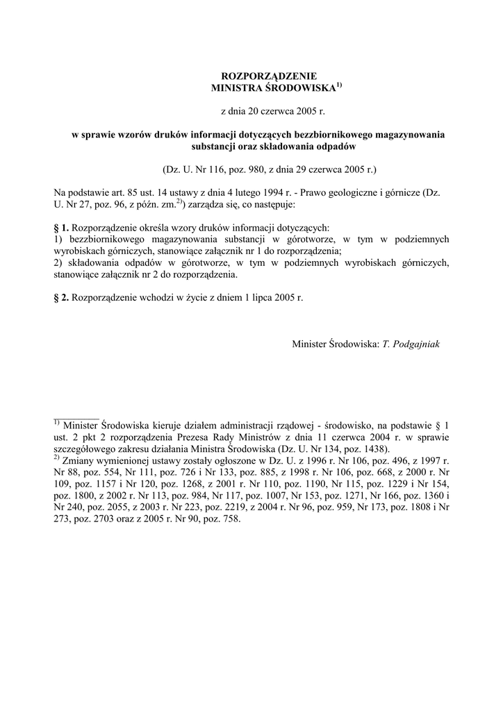 ROZPORZĄDZENIE MINISTRA ŚRODOWISKA1) z dnia 20 czerwca 2005 r. w