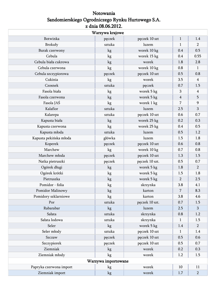 Notowania Sandomierskiego Ogrodniczego Rynku Hurtowego S.A. z dnia 08.06.2012. Warzywa krajowe Botwinka pęczek pęczek 10 szt 1 1.4 Brokuły sztuka luzem 1 2 Burak czerwony kg worek 10 kg 0.4 0.5 Cebula kg worek 15 kg 0.4 0.55 Cebula biała cukrowa kg worek 1.8 2.8 Cebula czerwona kg worek 10 kg 0.8 1 Cebula szczypiorowa pęczek pęczek 10 szt 0.5 0.8 Cukinia kg worek 3.5 4 Czosnek sztuka pęczek 0.7 1.5 Fasola biała kg worek 5 kg 3 4 Fasola czerwona kg worek 5 kg 4 5 Fasola JAŚ kg worek 1 kg 7 9 Kalafior sztuka luzem 2.5 3 Kalarepa sztuka pęczek 10 szt 0.6 0.7 Kapusta biała kg worek 25 kg 0.2 0.3 Kapusta czerwona kg worek 25 kg 0.4 0.5 Kapusta młoda sztuka luzem 0.5 1.2 Kapusta pekińska młoda główka luzem 1.5 1.8 Koperek pęczek pęczek 10 szt 0.6 0.8 Marchew kg worek 10 kg 0.7 0.8 Marchew młoda pęczek pęczek 10 szt 1.3 1.5 Natka pietruszki pęczek pęczek 10 szt. 0.5 0.7 Ogórek długi kg worek 5 kg 1.8 2 Ogórek krótki kg worek 5 kg 1.5 1.8 Pietruszka kg worek 5 kg 2 2.5 Pomidor - folia kg skrzynka 3.8 4.1 Pomidor Malinowy kg karton 7 8.3 Pomidory szklarniowe kg karton 3.8 4.6 Por sztuka pęczek 10 szt. 0.7 1.5 Rabarabar kg luzem 2.5 3 Sałata sztuka skrzynka 0.8 1.2 Sałata lodowa sztuka skrzynka 1 1.5 Seler kg worek 5 kg 1.4 2 Seler młody sztuka pęczek 10 szt 1 1.4 Szczaw pęczek pęczek 10 szt 0.5 0.6 Szczypiorek pęczek pęczek 10 szt 0.5 0.7 Ziemniak kg worek 0.2 0.3 Ziemniak młody kg worek 1.2 1.5 Warzywa importowane Papryka czerwona import kg worek 10 11 Ziemniak import kg worek 1.7 2