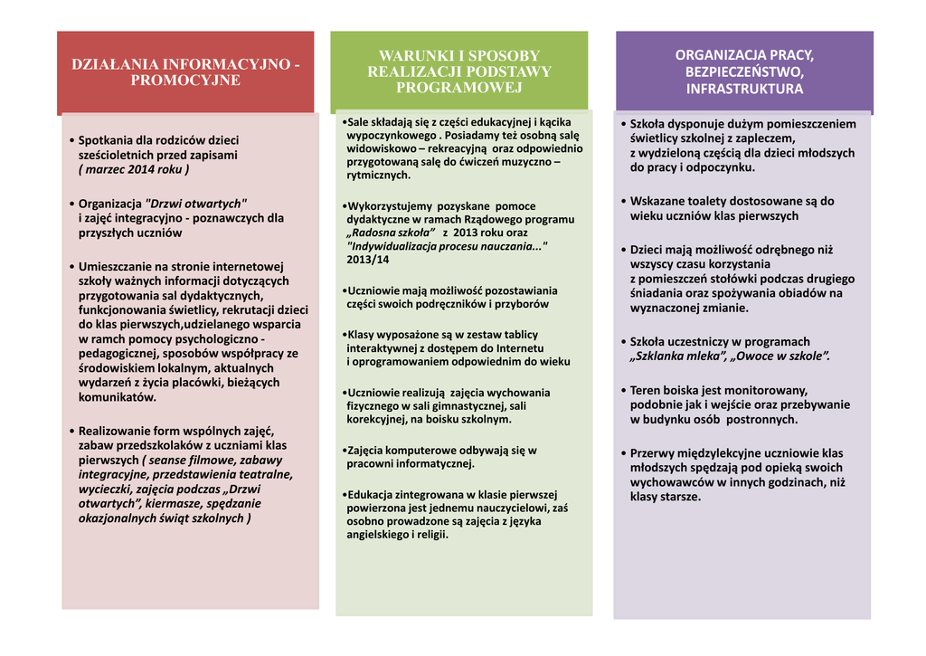 DZIAŁANIA INFORMACYJNO PROMOCYJNE • Spotkania dla rodziców dzieci sześcioletnich przed zapisami ( marzec 2014 roku ) • Organizacja "Drzwi otwartych" i zajęd integracyjno - poznawczych dla przyszłych uczniów • Umieszczanie na stronie internetowej szkoły ważnych informacji dotyczących przygotowania sal dydaktycznych, funkcjonowania świetlicy, rekrutacji dzieci do klas pierwszych,udzielanego wsparcia w ramch pomocy psychologiczno pedagogicznej, sposobów współpracy ze środowiskiem lokalnym, aktualnych wydarzeo z życia placówki, bieżących komunikatów. • Realizowanie form wspólnych zajęd, zabaw przedszkolaków z uczniami klas pierwszych ( seanse filmowe, zabawy integracyjne, przedstawienia teatralne, wycieczki, zajęcia podczas „Drzwi otwartych”, kiermasze, spędzanie okazjonalnych świąt szkolnych ) WARUNKI I SPOSOBY REALIZACJI PODSTAWY PROGRAMOWEJ ORGANIZACJA PRACY, BEZPIECZEŃSTWO, INFRASTRUKTURA •Sale składają się z części edukacyjnej i kącika wypoczynkowego . Posiadamy też osobną salę widowiskowo – rekreacyjną oraz odpowiednio przygotowaną salę do dwiczeo muzyczno – rytmicznych. • Szkoła dysponuje dużym pomieszczeniem świetlicy szkolnej z zapleczem, z wydzieloną częścią dla dzieci młodszych do pracy i odpoczynku. •Wykorzystujemy pozyskane pomoce dydaktyczne w ramach Rządowego programu „Radosna szkoła” z 2013 roku oraz "Indywidualizacja procesu nauczania..." 2013/14 • Wskazane toalety dostosowane są do wieku uczniów klas pierwszych •Uczniowie mają możliwośd pozostawiania części swoich podręczników i przyborów • Dzieci mają możliwośd odrębnego niż wszyscy czasu korzystania z pomieszczeo stołówki podczas drugiego śniadania oraz spożywania obiadów na wyznaczonej zmianie. •Klasy wyposażone są w zestaw tablicy interaktywnej z dostępem do Internetu i oprogramowaniem odpowiednim do wieku • Szkoła uczestniczy w programach „Szklanka mleka”, „Owoce w szkole”. •Uczniowie realizują zajęcia wychowania fizycznego w sali gimnastycznej, sali korekcyjnej, na boisku szkolnym. • Teren boiska jest monitorowany, podobnie jak i wejście oraz przebywanie w budynku osób postronnych. •Zajęcia komputerowe odbywają się w pracowni informatycznej. • Przerwy międzylekcyjne uczniowie klas młodszych spędzają pod opieką swoich wychowawców w innych godzinach, niż klasy starsze. •Edukacja zintegrowana w klasie pierwszej powierzona jest jednemu nauczycielowi, zaś osobno prowadzone są zajęcia z języka angielskiego i religii.