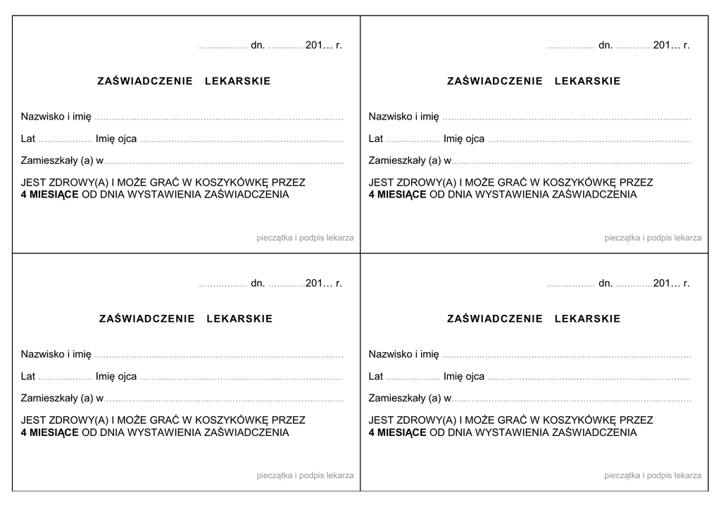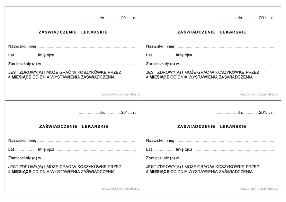 ................. dn. .............201… r. ZAŚWIADCZENIE LEKARSKIE ................. dn. .............201… r. ZAŚWIADCZENIE LEKARSKIE Nazwisko i imię ....................................................................................... Nazwisko i imię ....................................................................................... Lat ................... Imię ojca ....................................................................... Lat ................... Imię ojca ....................................................................... Zamieszkały (a) w.................................................................................... Zamieszkały (a) w.................................................................................... JEST ZDROWY(A) I MOŻE GRAĆ W KOSZYKÓWKĘ PRZEZ 4 MIESIĄCE OD DNIA WYSTAWIENIA ZAŚWIADCZENIA JEST ZDROWY(A) I MOŻE GRAĆ W KOSZYKÓWKĘ PRZEZ 4 MIESIĄCE OD DNIA WYSTAWIENIA ZAŚWIADCZENIA pieczątka i podpis lekarza pieczątka i podpis lekarza ................. dn. .............201… r. ZAŚWIADCZENIE LEKARSKIE ................. dn. .............201… r. ZAŚWIADCZENIE LEKARSKIE Nazwisko i imię ....................................................................................... Nazwisko i imię ....................................................................................... Lat ................... Imię ojca ....................................................................... Lat ................... Imię ojca ....................................................................... Zamieszkały (a) w.................................................................................... Zamieszkały (a) w.................................................................................... JEST ZDROWY(A) I MOŻE GRAĆ W KOSZYKÓWKĘ PRZEZ 4 MIESIĄCE OD DNIA WYSTAWIENIA ZAŚWIADCZENIA JEST ZDROWY(A) I MOŻE GRAĆ W KOSZYKÓWKĘ PRZEZ 4 MIESIĄCE OD DNIA WYSTAWIENIA ZAŚWIADCZENIA pieczątka i podpis lekarza pieczątka i podpis lekarza