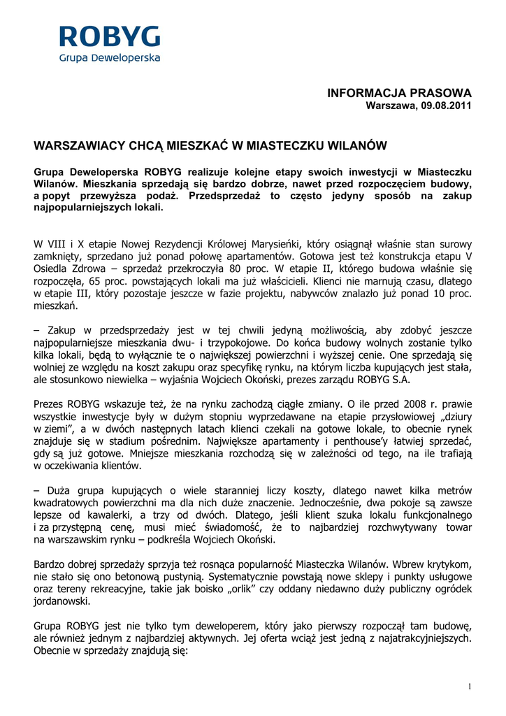INFORMACJA PRASOWA Warszawa, 09.08.2011 WARSZAWIACY CHCĄ MIESZKAĆ W MIASTECZKU WILANÓW Grupa Deweloperska ROBYG realizuje kolejne etapy swoich inwestycji w Miasteczku Wilanów. Mieszkania sprzedają się bardzo dobrze, nawet przed rozpoczęciem budowy, a popyt przewyższa podaż. Przedsprzedaż to często jedyny sposób na zakup najpopularniejszych lokali. W VIII i X etapie Nowej Rezydencji Królowej Marysieńki, który osiągnął właśnie stan surowy zamknięty, sprzedano już ponad połowę apartamentów. Gotowa jest też konstrukcja etapu V Osiedla Zdrowa – sprzedaż przekroczyła 80 proc. W etapie II, którego budowa właśnie się rozpoczęła, 65 proc. powstających lokali ma już właścicieli. Klienci nie marnują czasu, dlatego w etapie III, który pozostaje jeszcze w fazie projektu, nabywców znalazło już ponad 10 proc. mieszkań. – Zakup w przedsprzedaży jest w tej chwili jedyną możliwością, aby zdobyć jeszcze najpopularniejsze mieszkania dwu- i trzypokojowe. Do końca budowy wolnych zostanie tylko kilka lokali, będą to wyłącznie te o największej powierzchni i wyższej cenie. One sprzedają się wolniej ze względu na koszt zakupu oraz specyfikę rynku, na którym liczba kupujących jest stała, ale stosunkowo niewielka – wyjaśnia Wojciech Okoński, prezes zarządu ROBYG S.A. Prezes ROBYG wskazuje też, że na rynku zachodzą ciągłe zmiany. O ile przed 2008 r. prawie wszystkie inwestycje były w dużym stopniu wyprzedawane na etapie przysłowiowej „dziury w ziemi”, a w dwóch następnych latach klienci czekali na gotowe lokale, to obecnie rynek znajduje się w stadium pośrednim. Największe apartamenty i penthouse’y łatwiej sprzedać, gdy są już gotowe. Mniejsze mieszkania rozchodzą się w zależności od tego, na ile trafiają w oczekiwania klientów. – Duża grupa kupujących o wiele staranniej liczy koszty, dlatego nawet kilka metrów kwadratowych powierzchni ma dla nich duże znaczenie. Jednocześnie, dwa pokoje są zawsze lepsze od kawalerki, a trzy od dwóch. Dlatego, jeśli klient szuka lokalu funkcjonalnego i za przystępną cenę, musi mieć świadomość, że to najbardziej rozchwytywany towar na warszawskim rynku – podkreśla Wojciech Okoński. Bardzo dobrej sprzedaży sprzyja też rosnąca popularność Miasteczka Wilanów. Wbrew krytykom, nie stało się ono betonową pustynią. Systematycznie powstają nowe sklepy i punkty usługowe oraz tereny rekreacyjne, takie jak boisko „orlik” czy oddany niedawno duży publiczny ogródek jordanowski. Grupa ROBYG jest nie tylko tym deweloperem, który jako pierwszy rozpoczął tam budowę, ale również jednym z najbardziej aktywnych. Jej oferta wciąż jest jedną z najatrakcyjniejszych. Obecnie w sprzedaży znajdują się: 1 – Nowa Rezydencja Królowej Marysieńki: • • • • Etap Etap Etap Etap VIII-X, lokale od 33 do 115 m kw., ceny od 6 700 zł/m kw. IV, lokale od 100 do 204 m kw., ceny od 5 500 zł/m kw. VI, lokale od 110 do 117 m kw., ceny od 6 900 zł/m kw. II I IX, lokale od 133 do 185 m kw., ceny od 7.000 zł/m kw. W letniej promocji w Nowej Rezydencji Królowej Marysieńki ceny wybranych apartamentów zostały obniżone do 5 500 zł/m kw. Akcja trwa do końca sierpnia br. – Osiedle Zdrowa: • • • • Etap Etap Etap Etap III, lokale od 39 do 90 m kw., ceny od 6 500 zł/m kw. II, lokale od 37 do 120 m kw., ceny od 6 500 zł/m kw. V, lokale od 58 do 115 m kw., ceny od 6 400 zł/m kw. IV, lokale od 86 do 122 m kw., ceny od 6 200 zł/m kw. Na wakacje Grupa ROBYG przygotowała też specjalną wyprzedaż – co tydzień określona liczba lokali sprzedawana jest po obniżonych cenach. Mechanizm przypomina sezonowe wyprzedaże i promocje w sieciach handlowych, w których również stale pewna grupa towarów objęta jest ofertą specjalną. Dodatkowe informacje: Katarzyna Terej, tel. 602 21 43 53 Piotr Talarek, tel. 608 68 74 92 TBT i Wspólnicy, ul. Bracka 25 lok 503, Warszawa tel. (22) 692 17 11, e-mail: [email protected] *** Grupa deweloperska ROBYG specjalizuje się w realizacji projektów mieszkaniowych. Grupa deweloperska ROBYG składa się ze spółki holdingowej ROBYG S.A., spółki zarządzającej ROBYG Zarządzanie, spółki prowadzacej działania marketingowe ROBYG Marketing i Sprzedaż oraz ze spółek celowych, które realizują poszczególne projekty deweloperskie Grupy. *** Niniejszy komunikat nie stanowi oferty sprzedaży papierów wartościowych w Stanach Zjednoczonych Ameryki. Papiery wartościowe nie mogą być oferowane ani sprzedawane na terytorium Stanów Zjednoczonych Ameryki bez uprzedniej rejestracji lub zwolnienia od wymogu rejestracji. ROBYG S.A. („Spółka”) nie zamierza rejestrować żadnej części oferty papierów wartościowych Spółki w Stanach Zjednoczonych Ameryki. Niniejszy komunikat ani żadna jego kopia nie może być przekazana lub w jakikolwiek sposób przesłana lub udostępniona na terytorium Stanów Zjednoczonych Ameryki. Rozpowszechnianie tych materiałów w niektórych państwach może być zabronione. Niedozwolona jest dystrybucja niniejszego dokumentu na terytorium Kanady, Japonii lub Australii. Informacje zawarte w załączonych materiałach nie stanowią oferty sprzedaży ani zaproszenia do złożenia oferty nabycia papierów wartościowych Spółki w Kanadzie, Japonii lub Australii. Niniejszy komunikat jest dokumentem wyłącznie promocyjnym w rozumieniu art. 53 ustawy z dnia 29 lipca 2005 r. o ofercie publicznej i warunkach wprowadzenia instrumentów finansowych do zorganizowanego systemu obrotu oraz o spółkach publicznych. Oferta papierów wartościowych Spółki oraz ich dopuszczenie do obrotu na Giełdzie Papierów Wartościowych w Warszawie nastąpi na podstawie prospektu emisyjnego, po jego zatwierdzeniu przez Komisję Nadzoru Finansowego, przy czym prospekt emisyjny Spółki będzie jedynym prawnie wiążącym dokumentem zawierającym informacje o Spółce, ofercie publicznej papierów wartościowych Sp